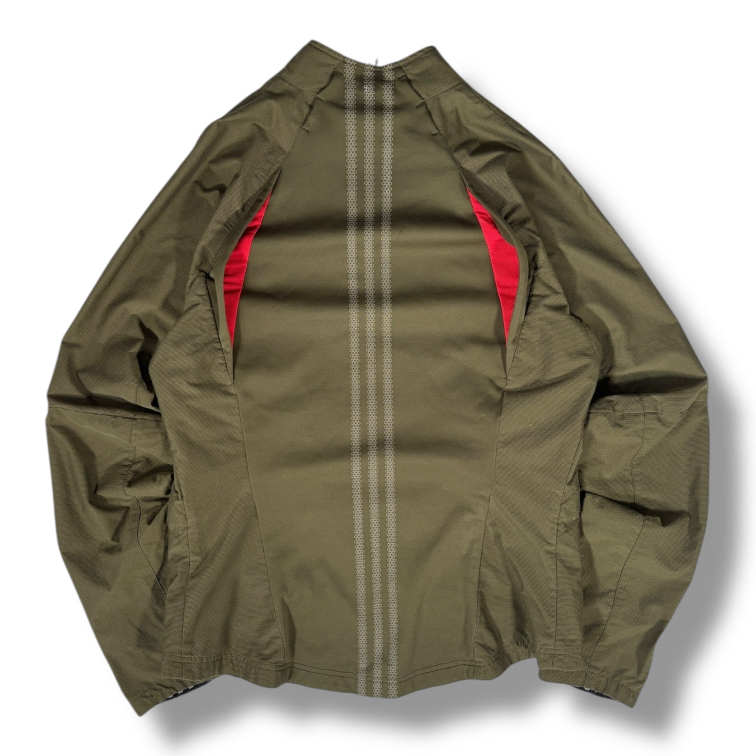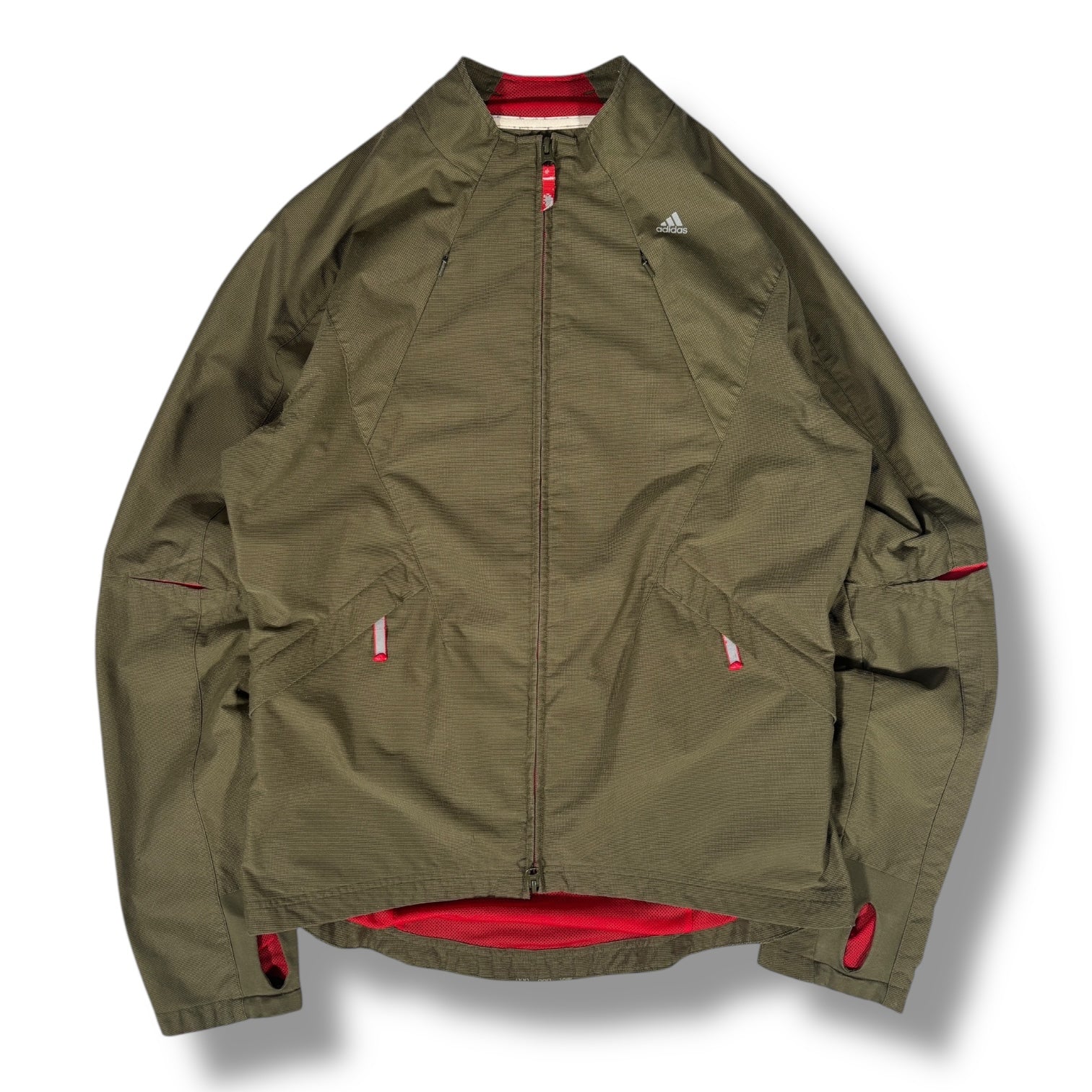 Olive green colourway with a red mesh lining and contrast red mesh slits throughout. Features include two zippered front pockets two angled zipped chest slits for ventilation with red zip pulls, and reflective striping down the back. The sleeves incorporate red underarm venting and cuffs with thumbholes. The back also includes ventilation slits.