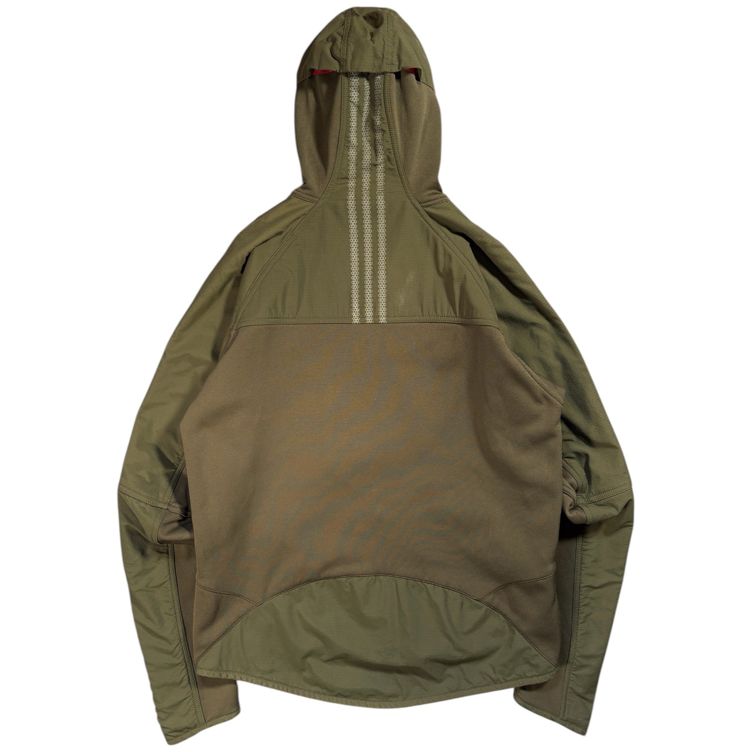 . Asymmetrical zip front with red accent detailing and high neck hood