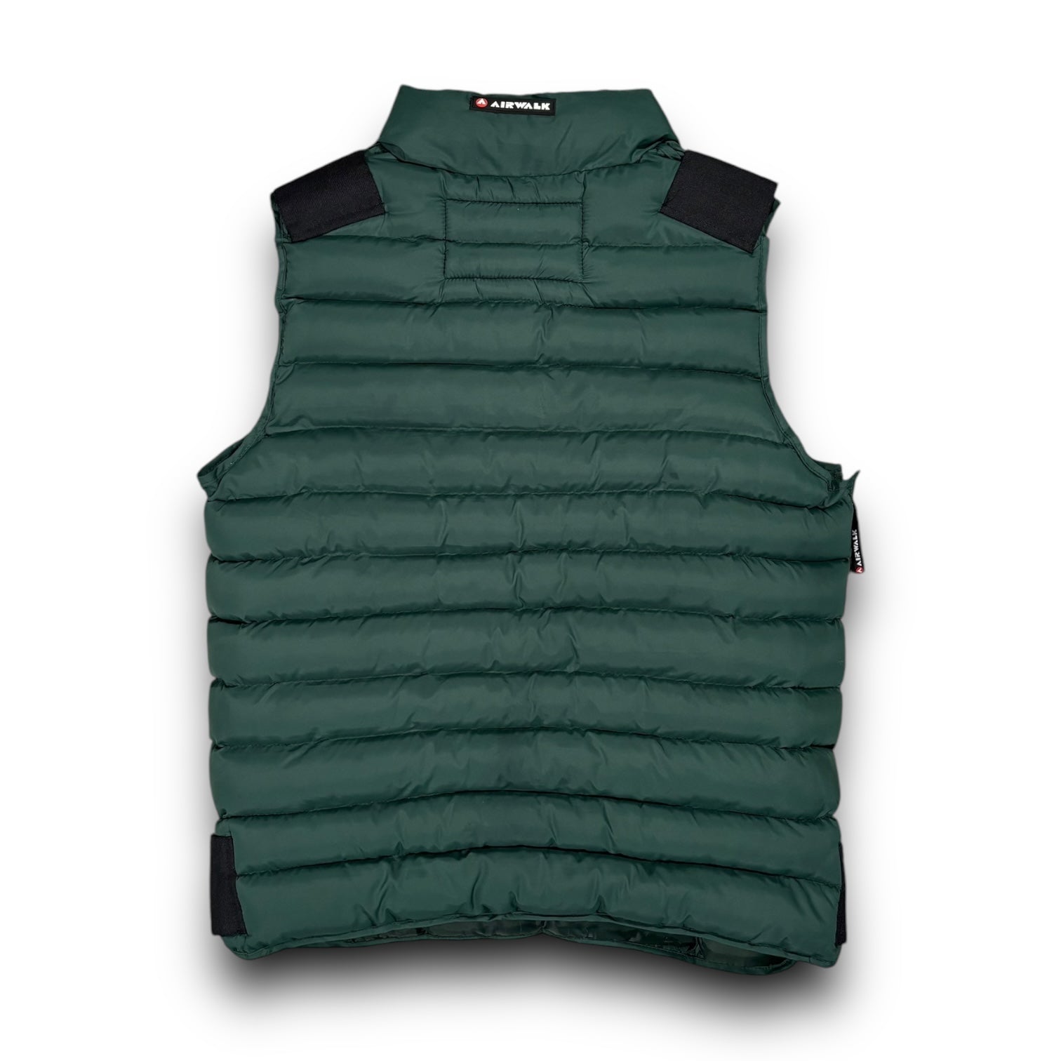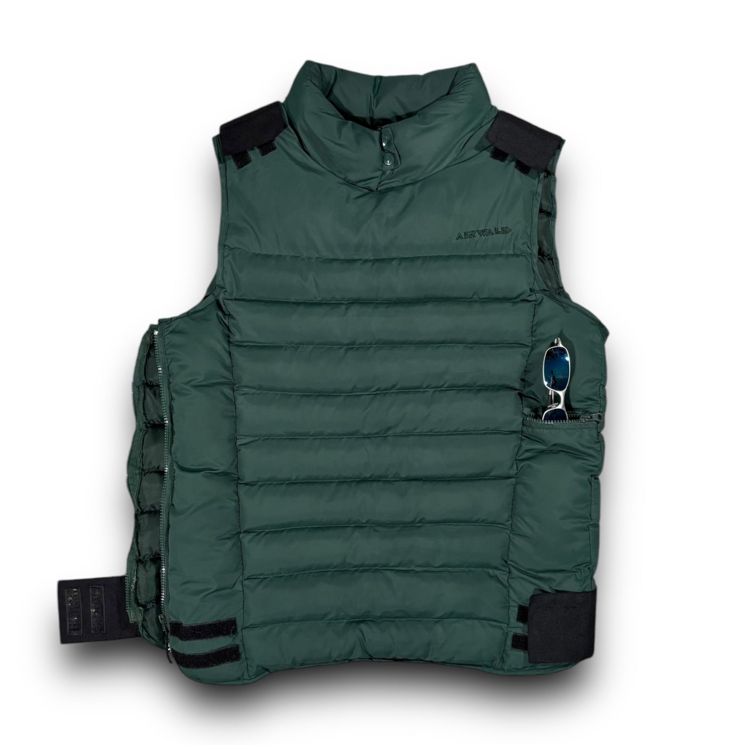 Dark green colourway. Puffer Gilet/Vest with velcro straps around the jacket to tighten to body, zip opening on the side of body & stash zipped pocket perfect for a mobile or glasses.