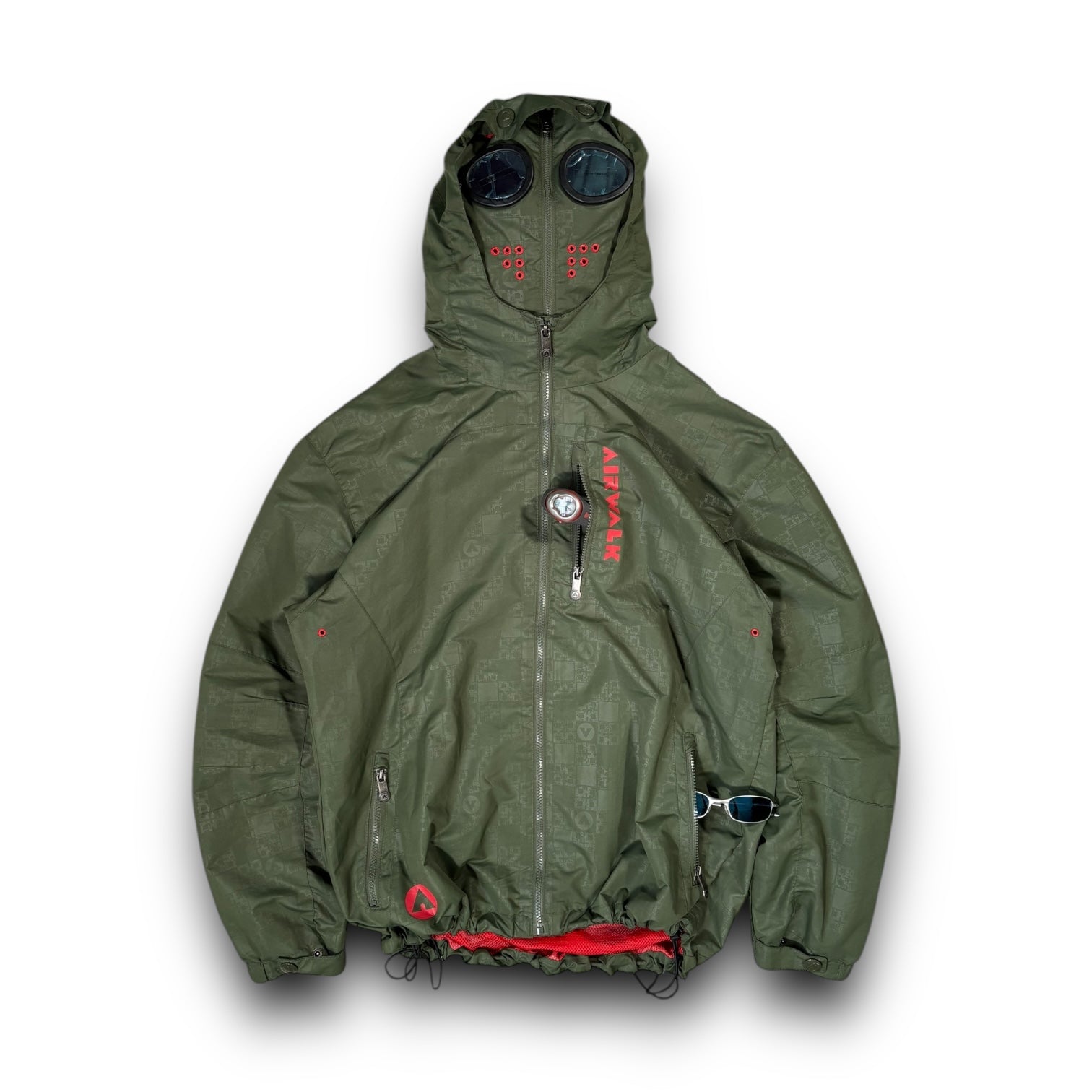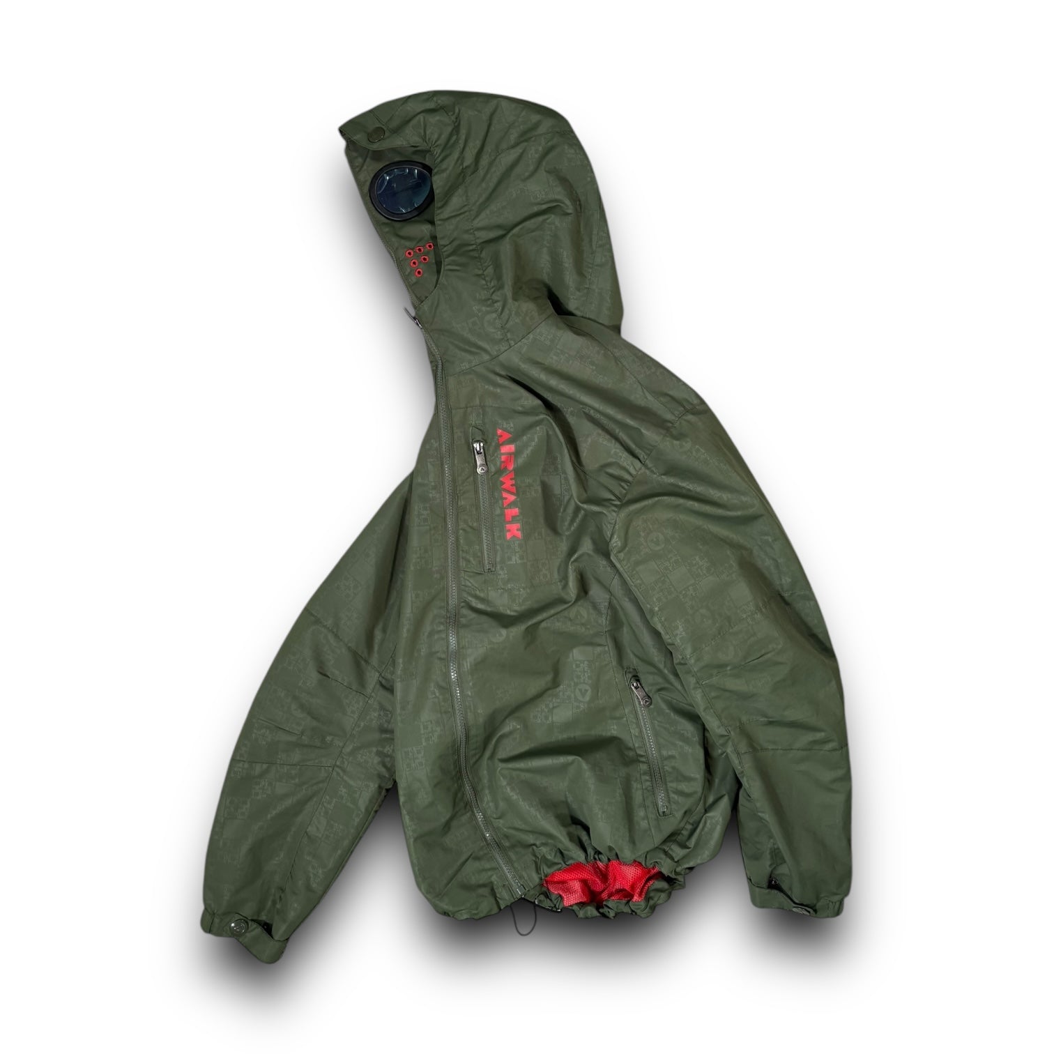 Dark green/ red colourway, with Airwalk print detailing across the jacket. Features a full face zip with tinted goggles that can be seen out of. Elasticated waist hem and buttoned cuffs. 3 front zipped pockets.