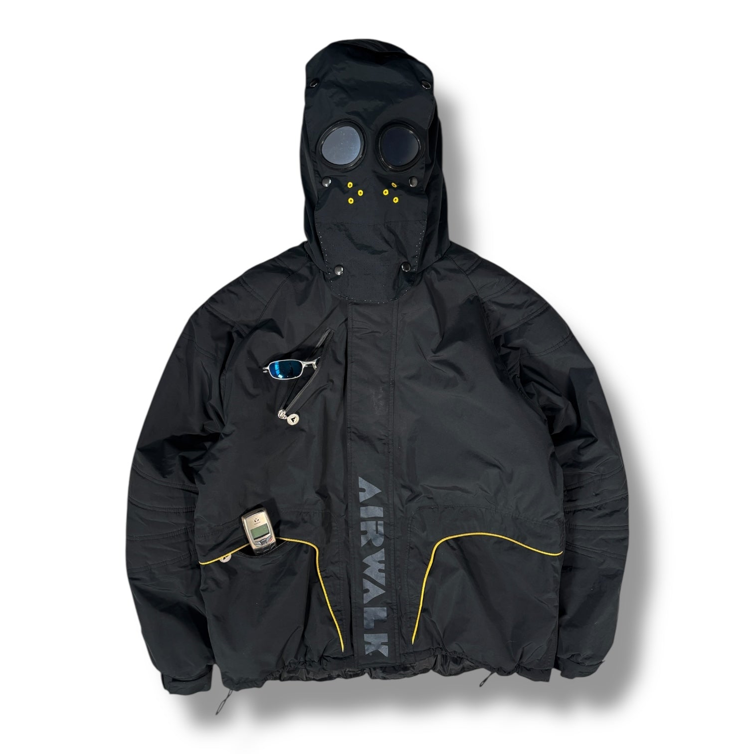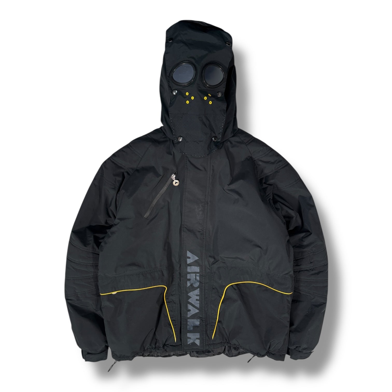 Black colourway featuring a hood with integrated detachable pannell with goggle lens secured with snap buttons and yellow rivets, can be hidden in the top of the hood. Includes a slanted zippered chest pocket, two zippered hand pockets with yellow piping, and bold a vertical Airwalk logo at the front. Drawstring adjustments are located at the hem. The interior has a snow skirt and inside zipped pocket.