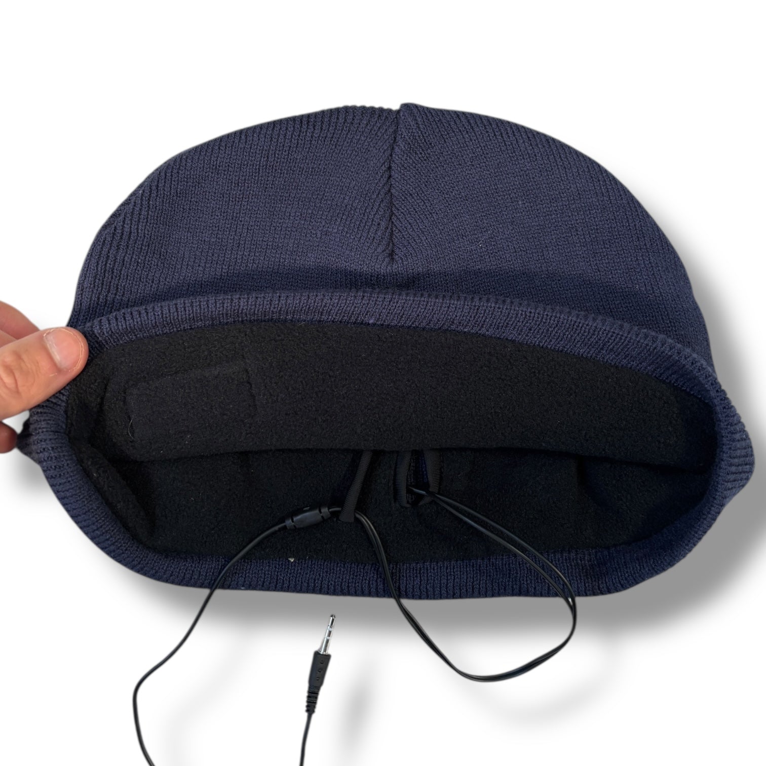 Navy colourway in a soft rib-knit construction with a stitched rubberised Airwalk patch on the front. Features integrated wired stereo headphones accessed through an inner fleece lining with visible cables and a 3.5mm audio jack.