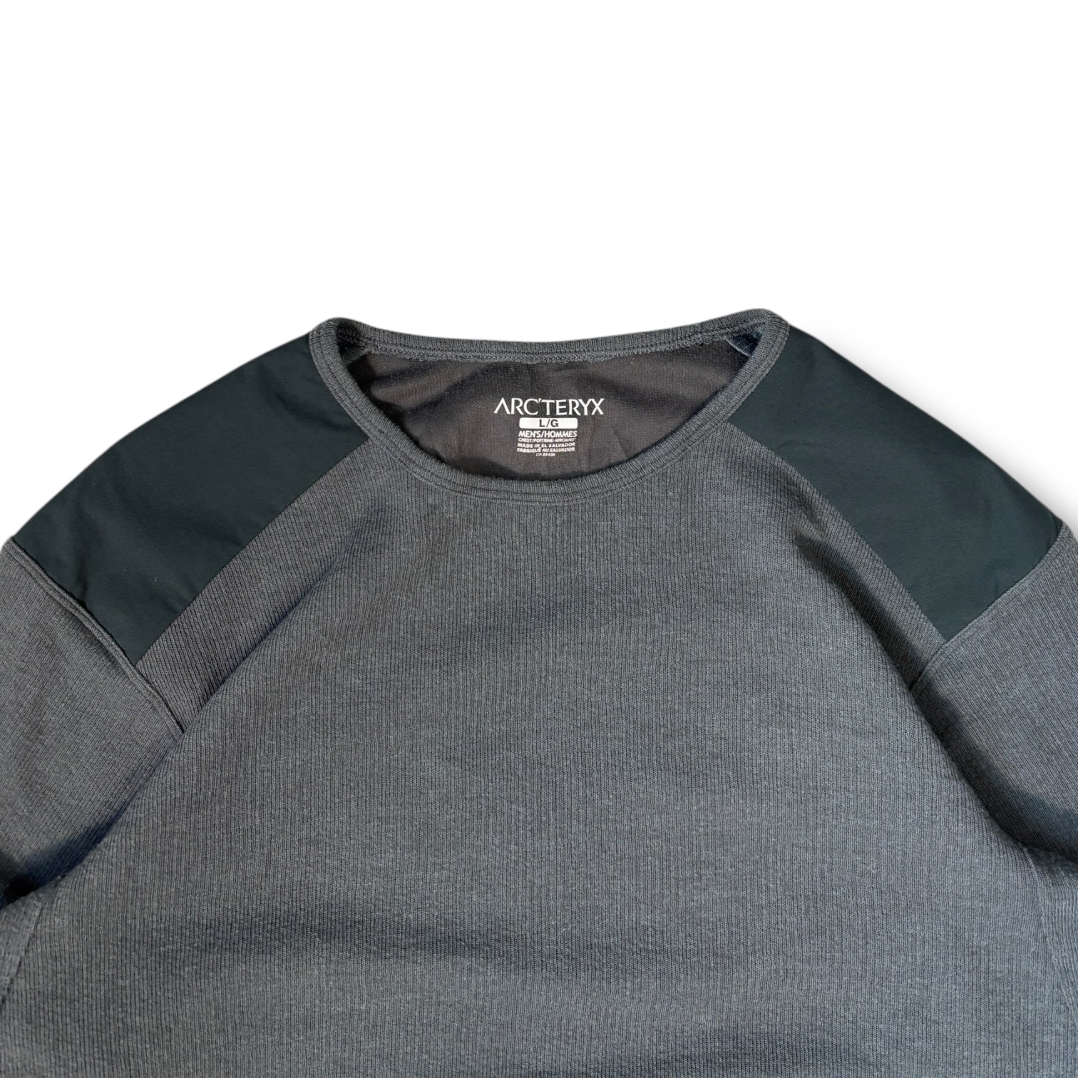 Charcoal grey colourway with tonal ribbed texture throughout. Features dark grey contrast shoulder panels made from a smooth synthetic fabric. The cut includes raglan sleeves and a straight hem with a small woven Arcteryx tab at the left seam.