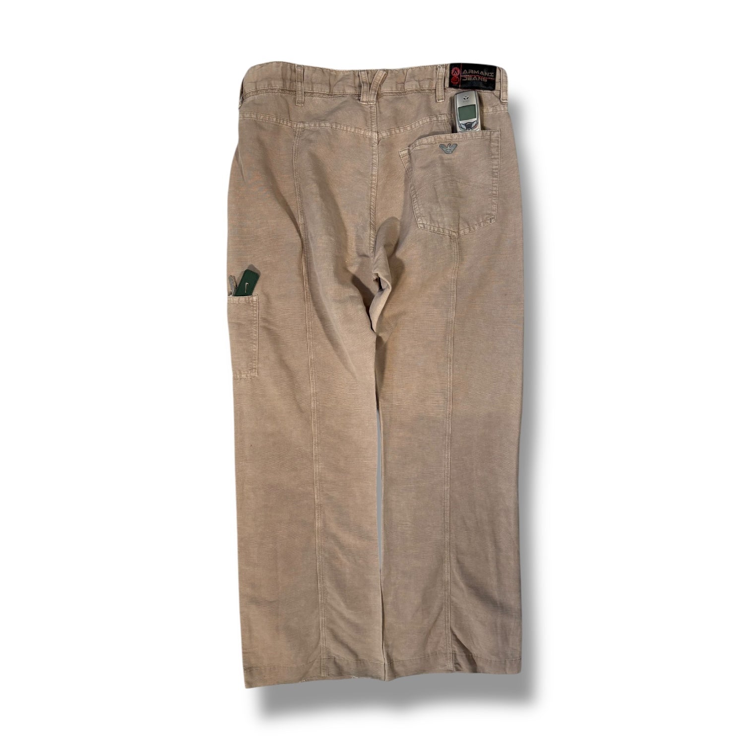Beige colourway with a soft washed texture and minimal fading throughout. Features two slanted front pockets, one with an additional small slot, and a single rear patch pocket with an Armani logo and contrast tag detail at the waistband. A utility-style pocket is positioned on the right leg. Straight leg fit with visible vertical seam construction down the front and back.