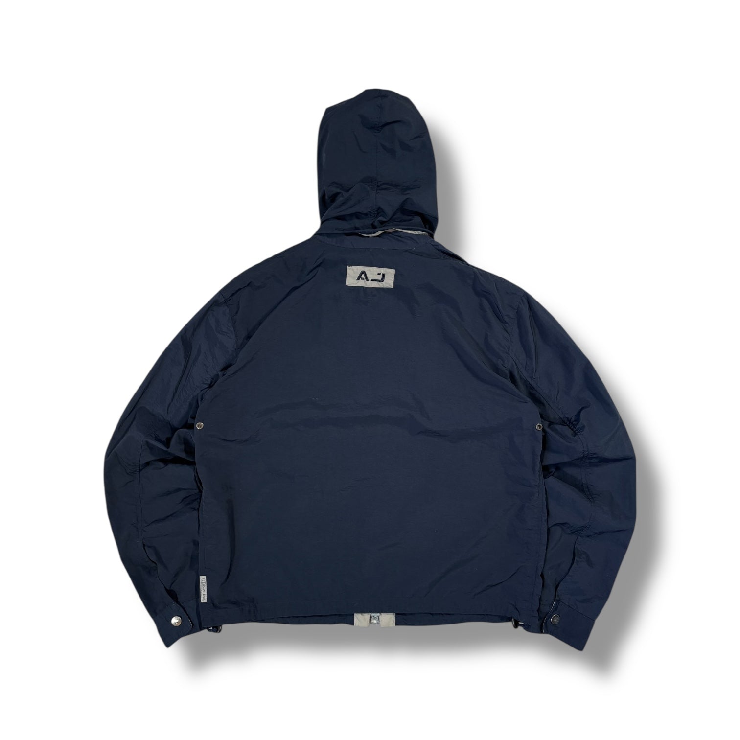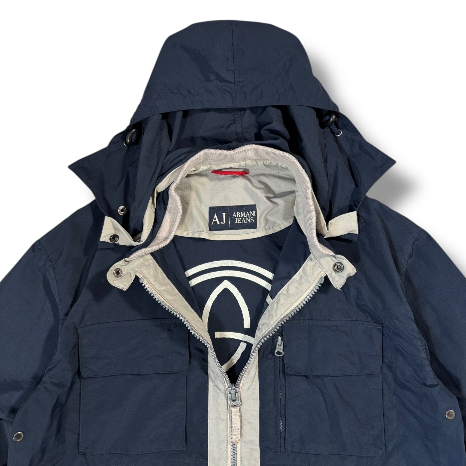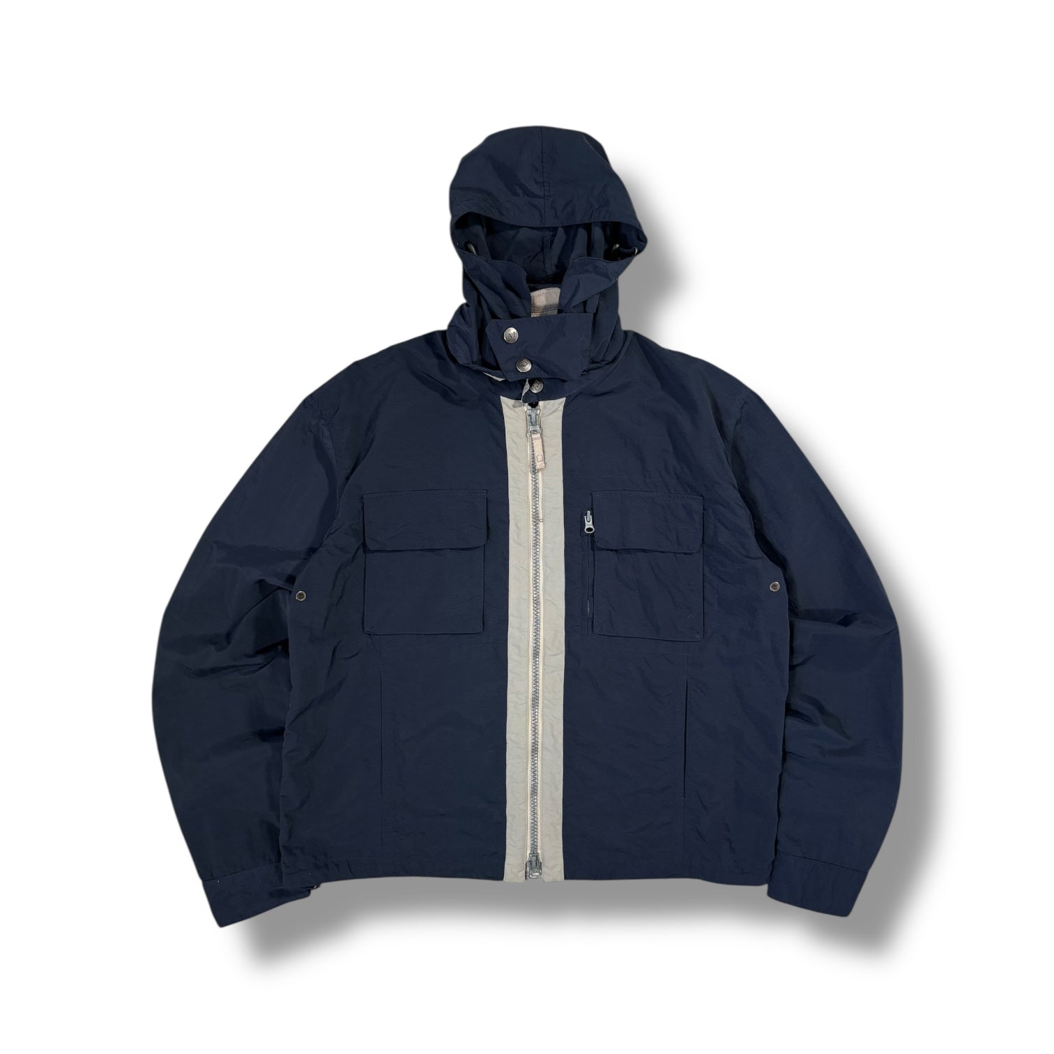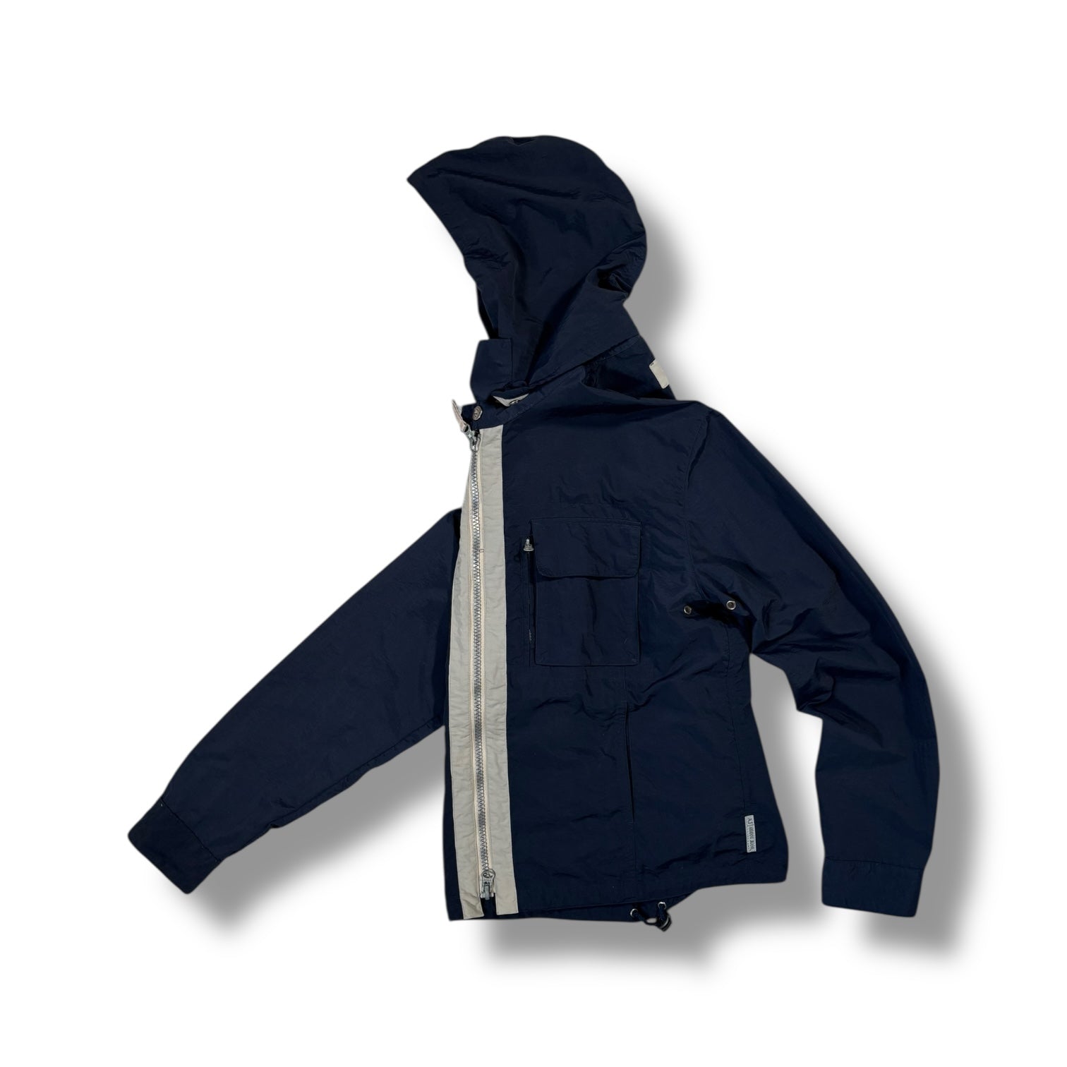 Navy colourway with a contrasting off-white front that runs vertically through the centre zip closure. This piece features a detachable hood with adjustable drawcords and snap buttons at the collar. The front includes four symmetrical flap pockets—two on the chest and two at the waist—with snap closures, alongside a vertical zip pocket for added utility. Snap-button tabs at the cuffs and hem, while the back showcases a tonal patch detail and a branded tag.