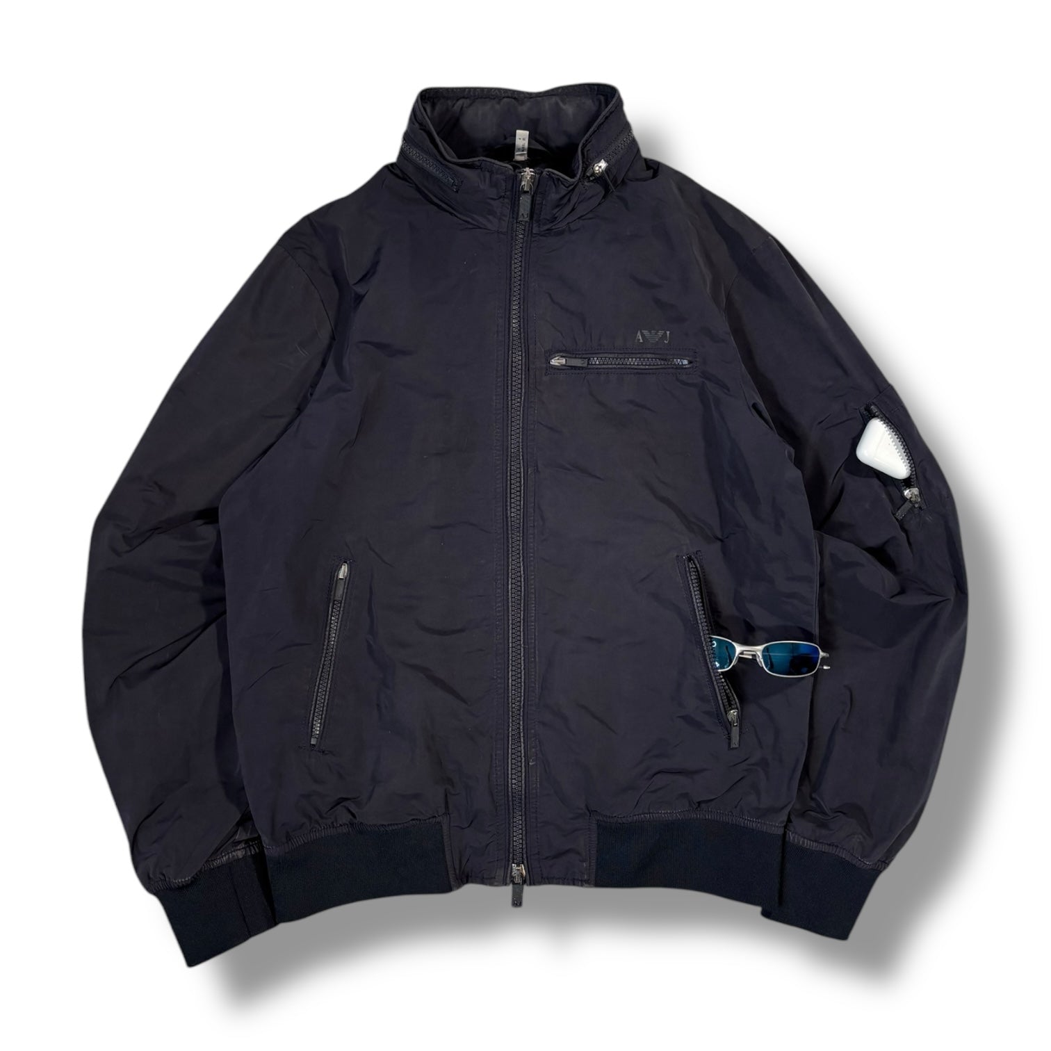Dark navy colourway, the jacket is lightweight. Features 4 pockets, two zipped at the bottom another zipped on the chest with a zipped stash pocket on the arm. Front zipper is dual zipped, hood can be stashed under the collar using the zipper.