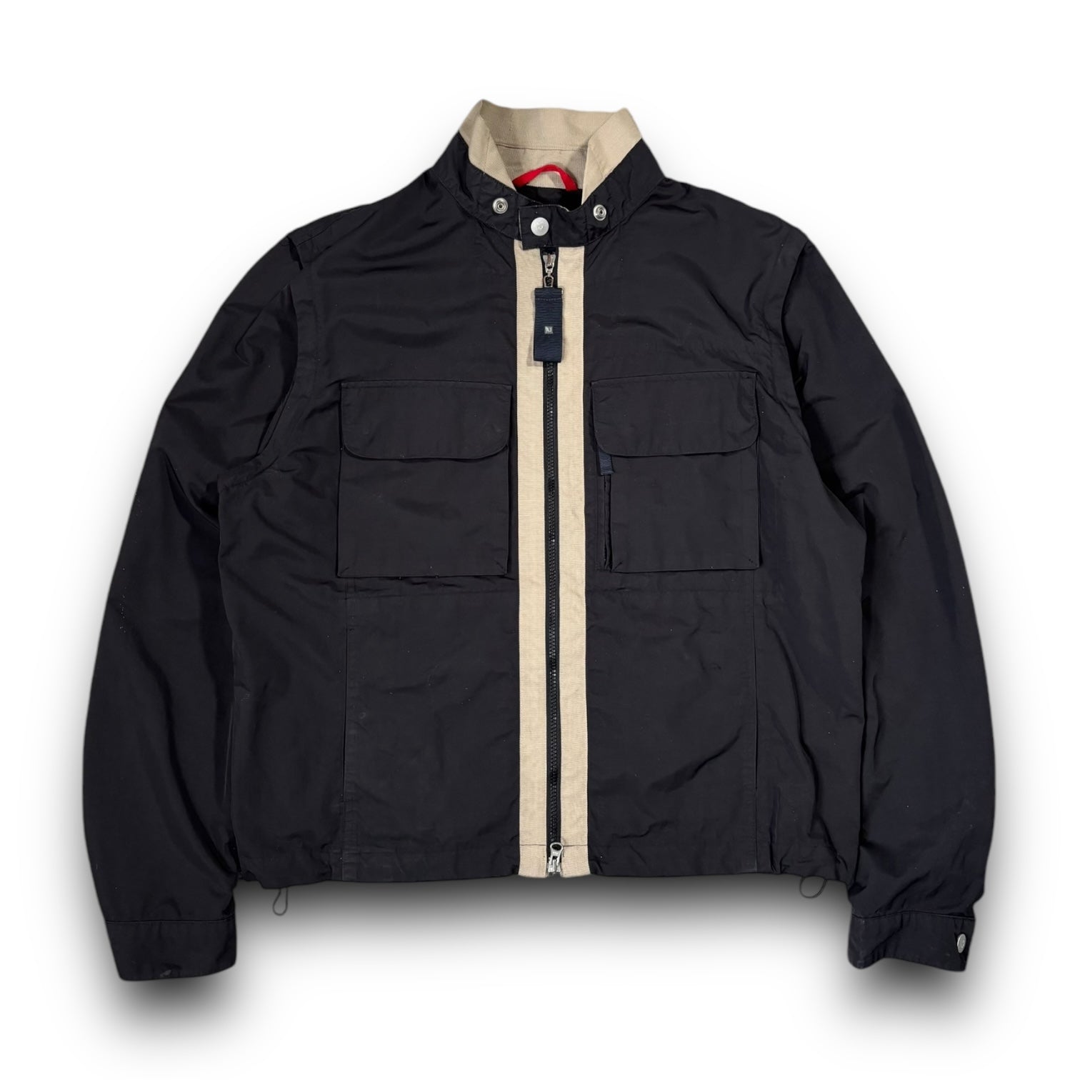 Black colourway, the jacket is lightweight. Features 5 front pockets two open at the bottom another 2 button popper pockets on the chest with a zipped stash pocket underneath. Front zipper is dual zipped and the hem is fully toggle adjustable.