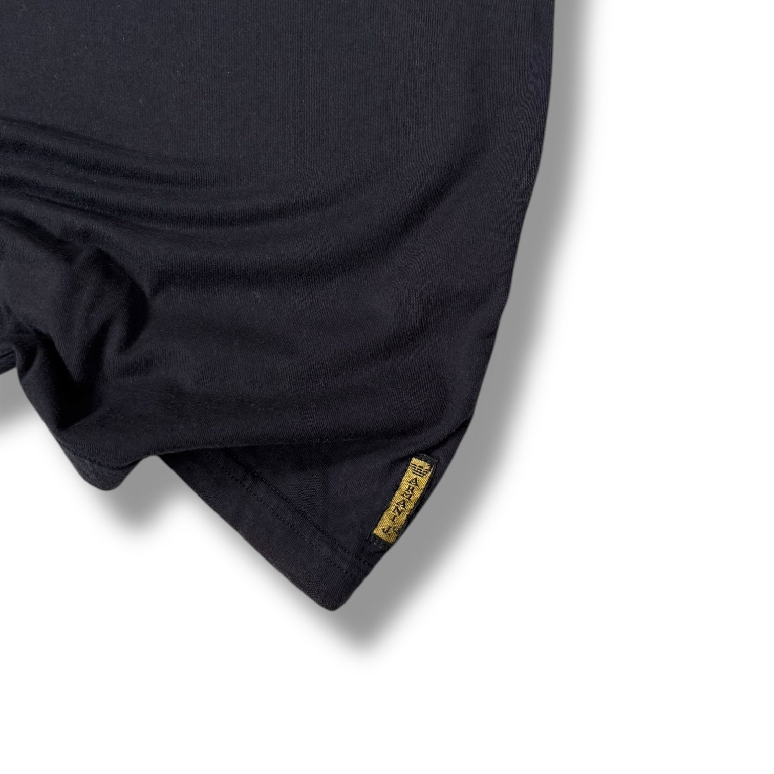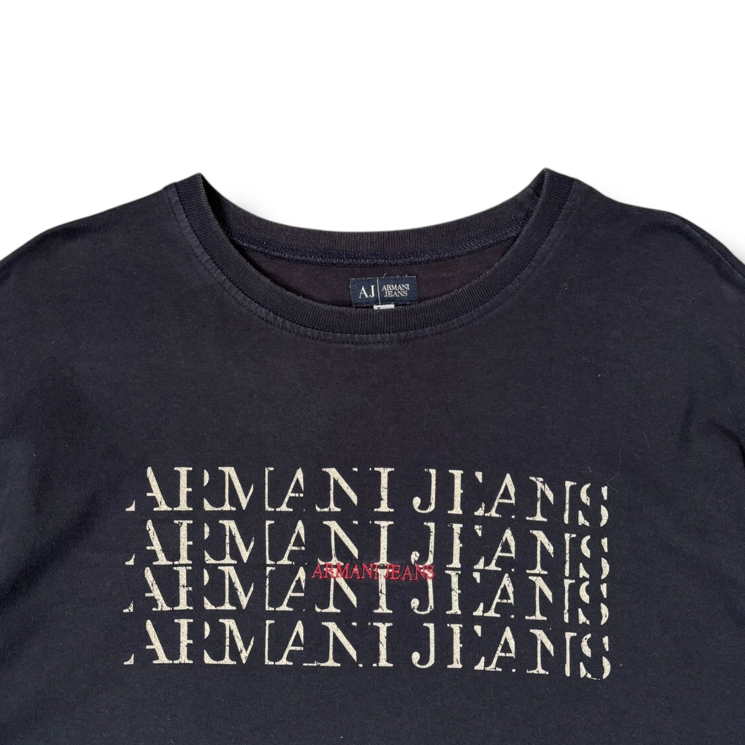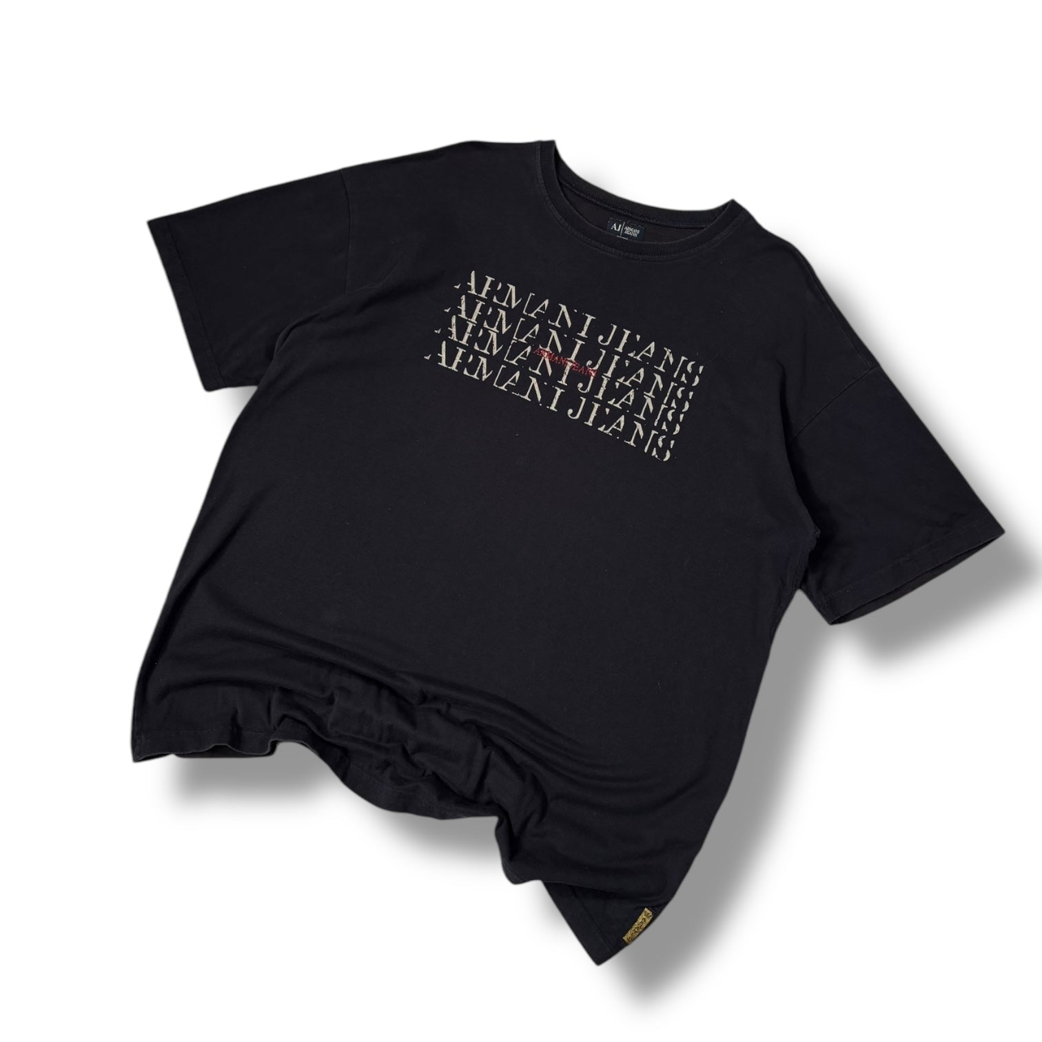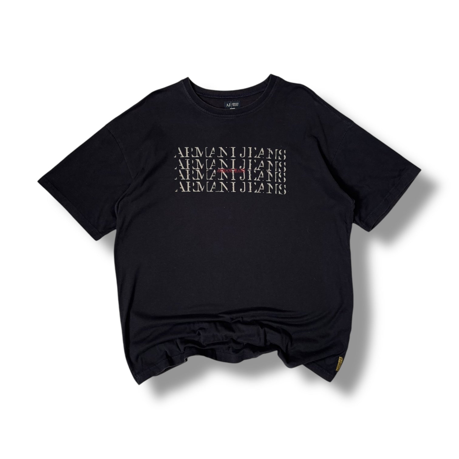 Black colourway. Small Armani tag at the bottom, Armani Jeans graphic print on the front with an embroidered logo in the middle.