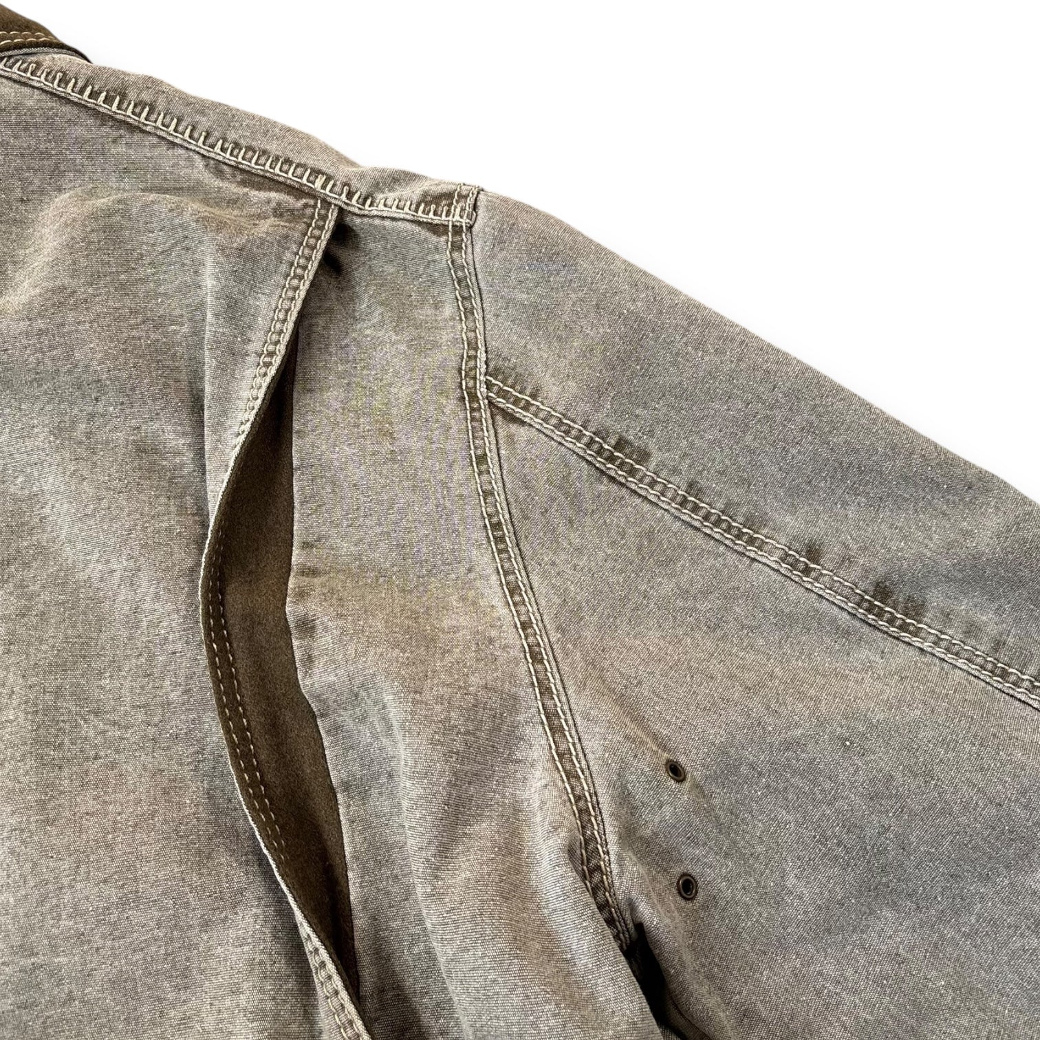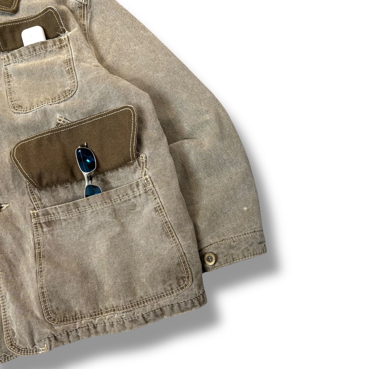Taupe colourway with a weathered wash and contrast olive collar detail. The piece features a total of five external pockets—three on the front, including a flap chest pocket and two angled flap pockets at the waist, and two vertical side-entry pockets on the back near the hem. Interior reveals a contrasting tartan check lining with olive trim. Stitching is reinforced and prominently visible, button cuffs and dual underarm ventilation eyelets.