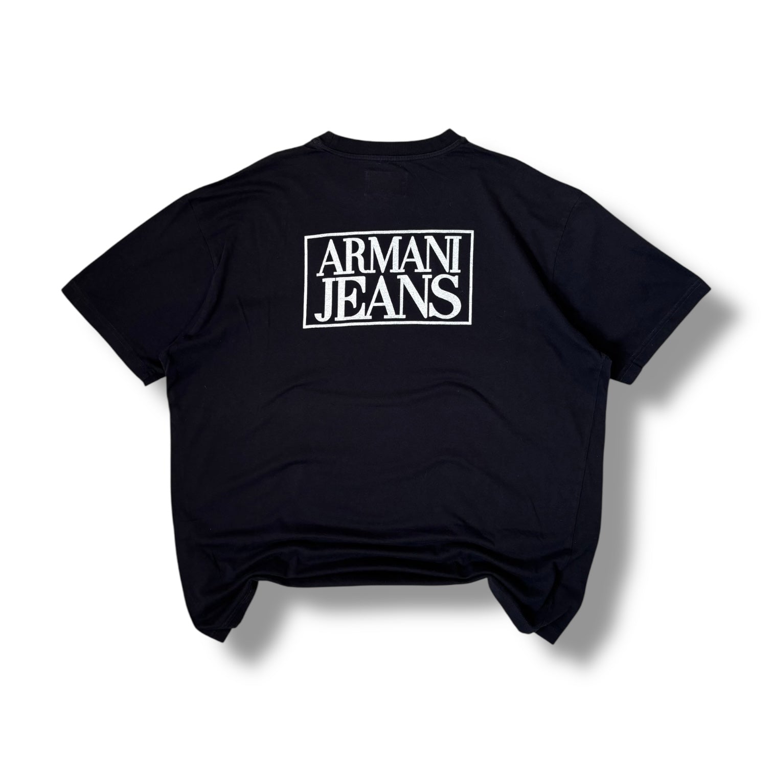 Dark navy colourway featuring a bold white Armani Jeans print on both the front and back. Features short sleeves and ribbed crewneck.