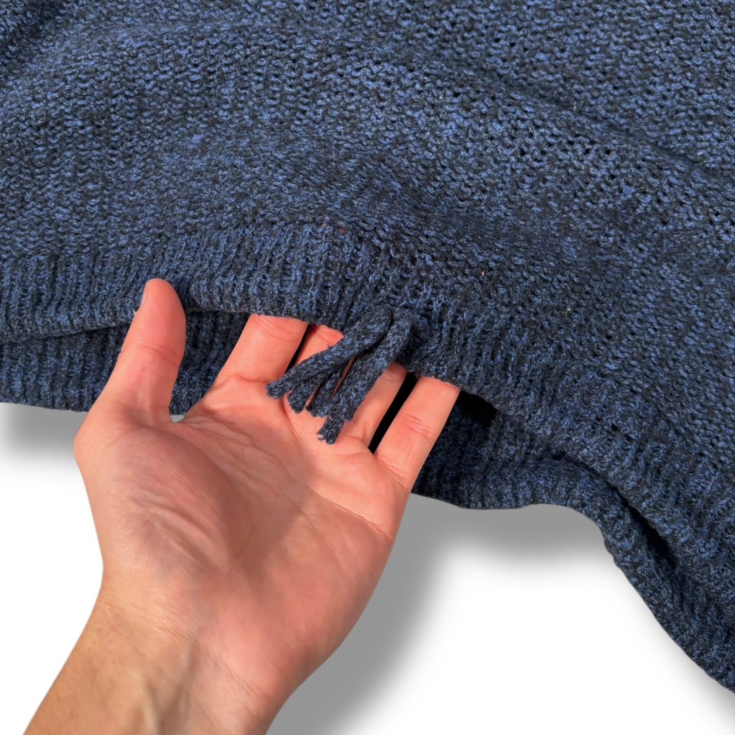 Navy colourway with a subtly heathered texture throughout, featuring a deep funnel neck and a chunky knit construction. A tonal drawstring is concealed at the hem. Branding is present on both the left sleeve and lower front. The silhouette is slightly cropped and boxy.