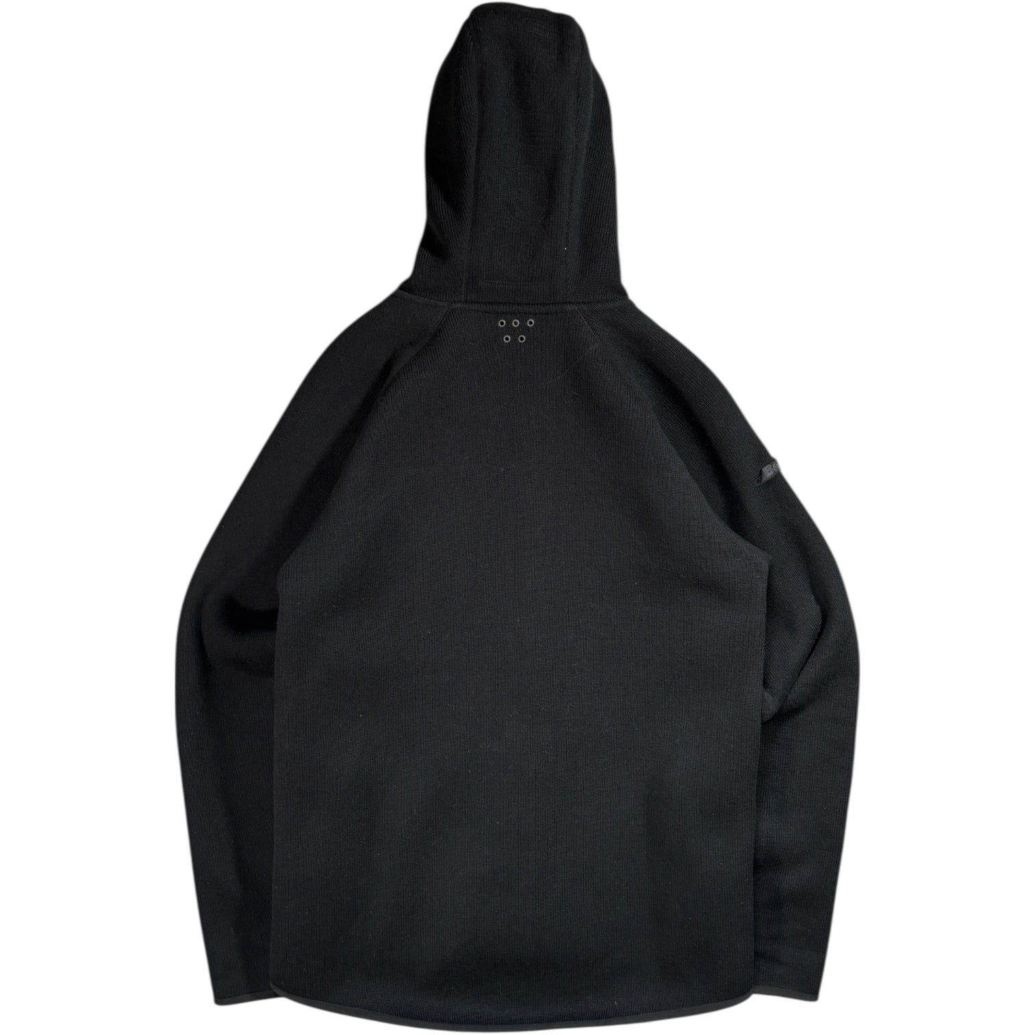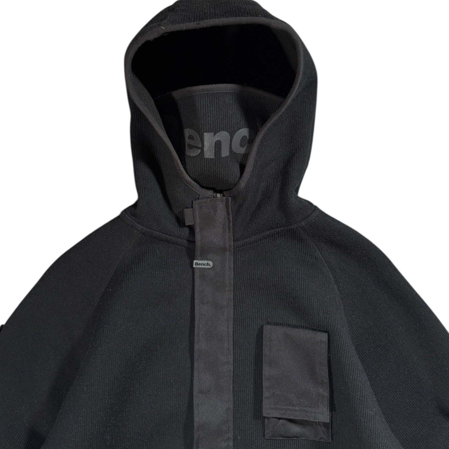 .Black technical hooded jacket with high collar and concealed full zip closure