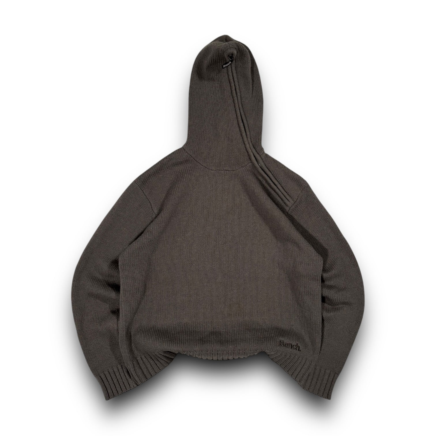 Brown colourway, heavyweight knit made from lambs wool. Asymmetrical zip hood that spans the length of the whole hood. Features a small bench logo at the bottom of the hoodie and thumbs holes in the cuffs.