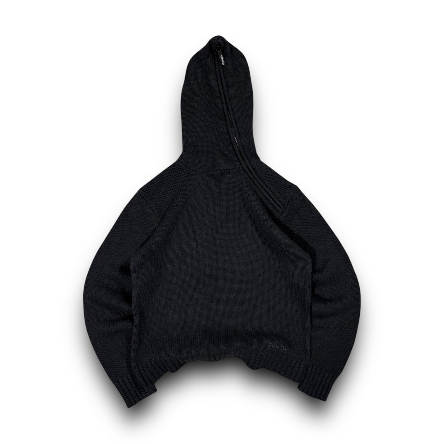 Black colourway, heavyweight knit made from lambs wool. Asymmetrical zip hood that spans the length of the whole hood. Features a small bench logo at the bottom of the hoodie and thumbs holes in the cuffs.
