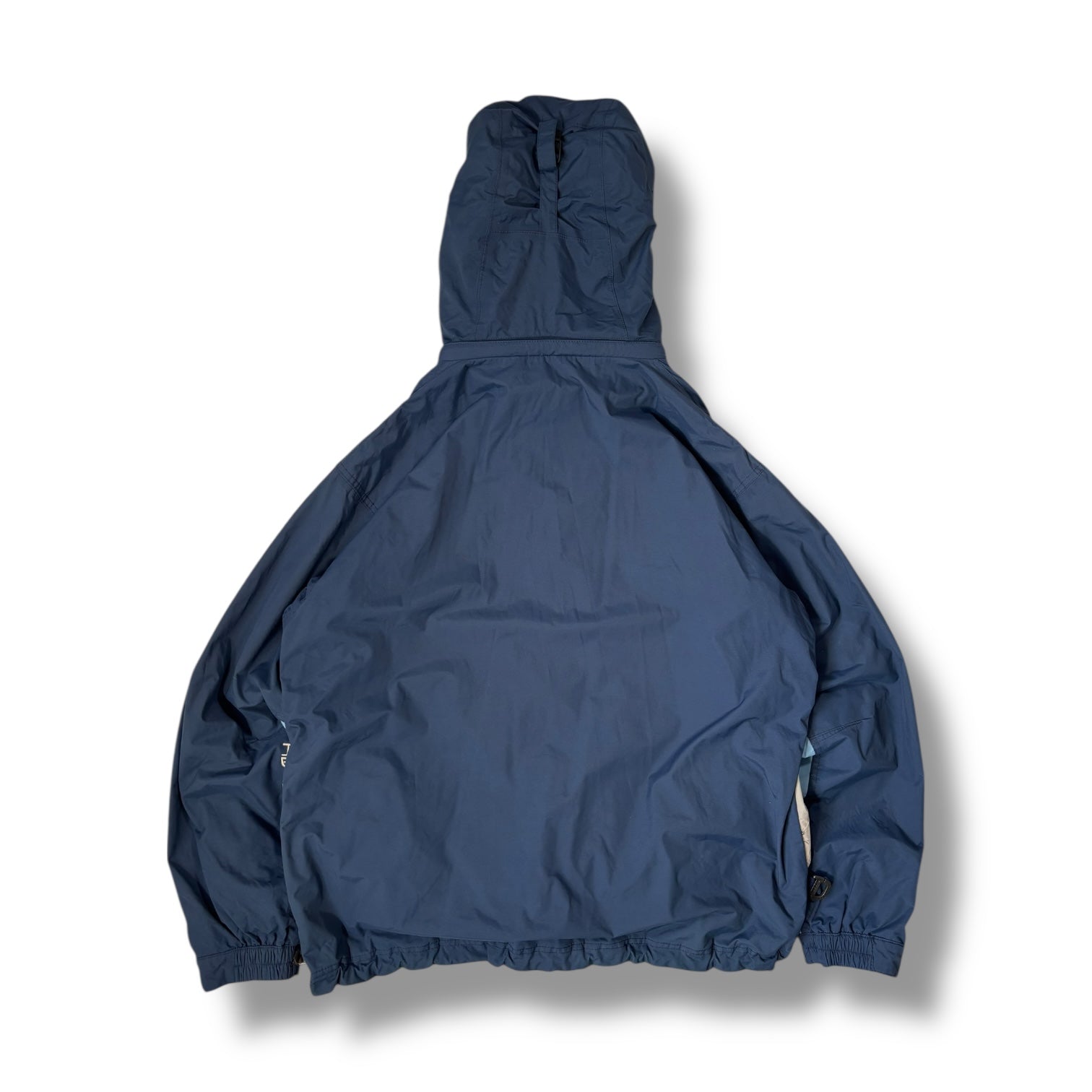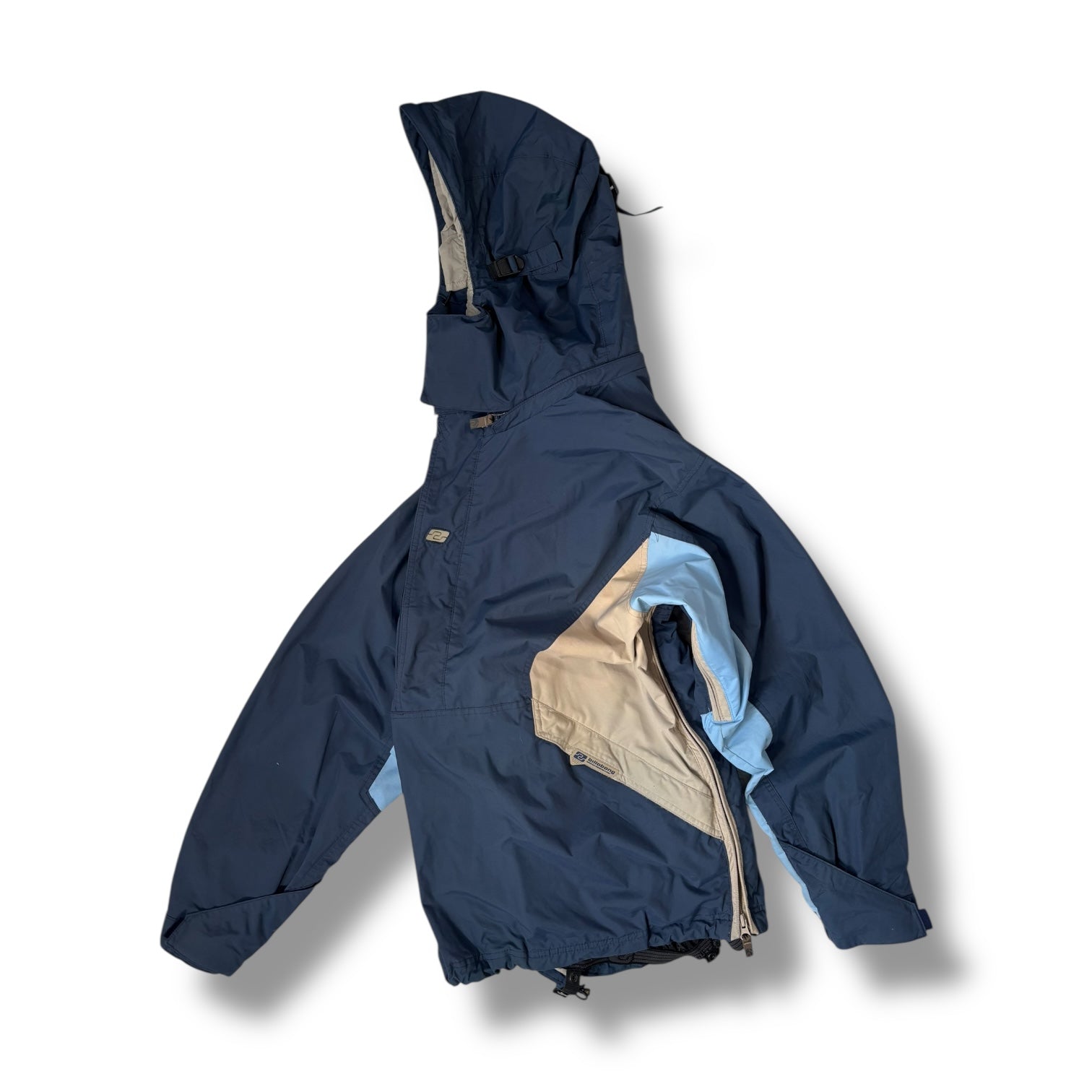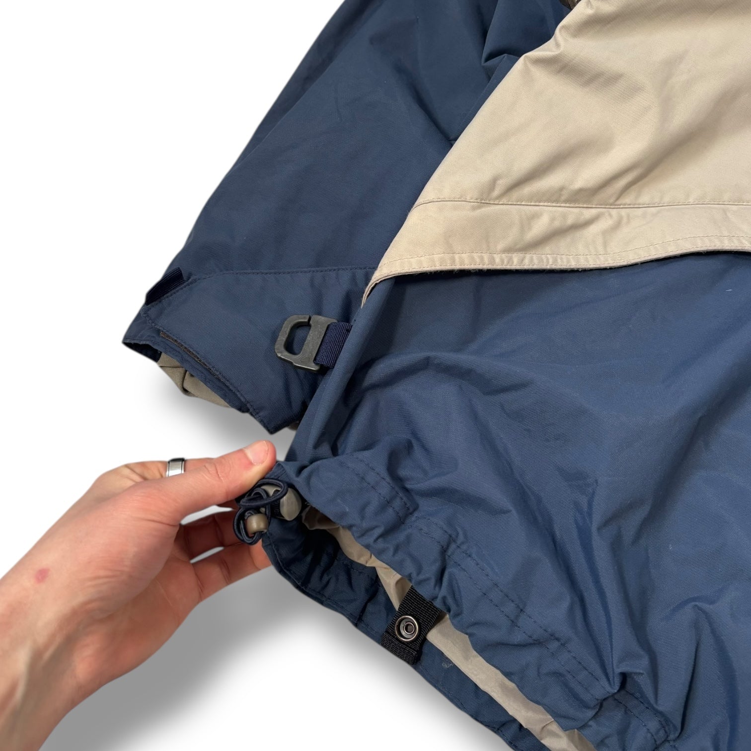 Navy and beige colourway with light blue contrast panels along the underarms and inner lining. This piece features a high-collar hood with adjustable toggles, a half-zip closure with a storm flap, angular beige panels with zipped hand pockets concealed beneath. The hem includes an adjustable drawcord. Additional ventilation is provided by zippered openings running along the sides.
