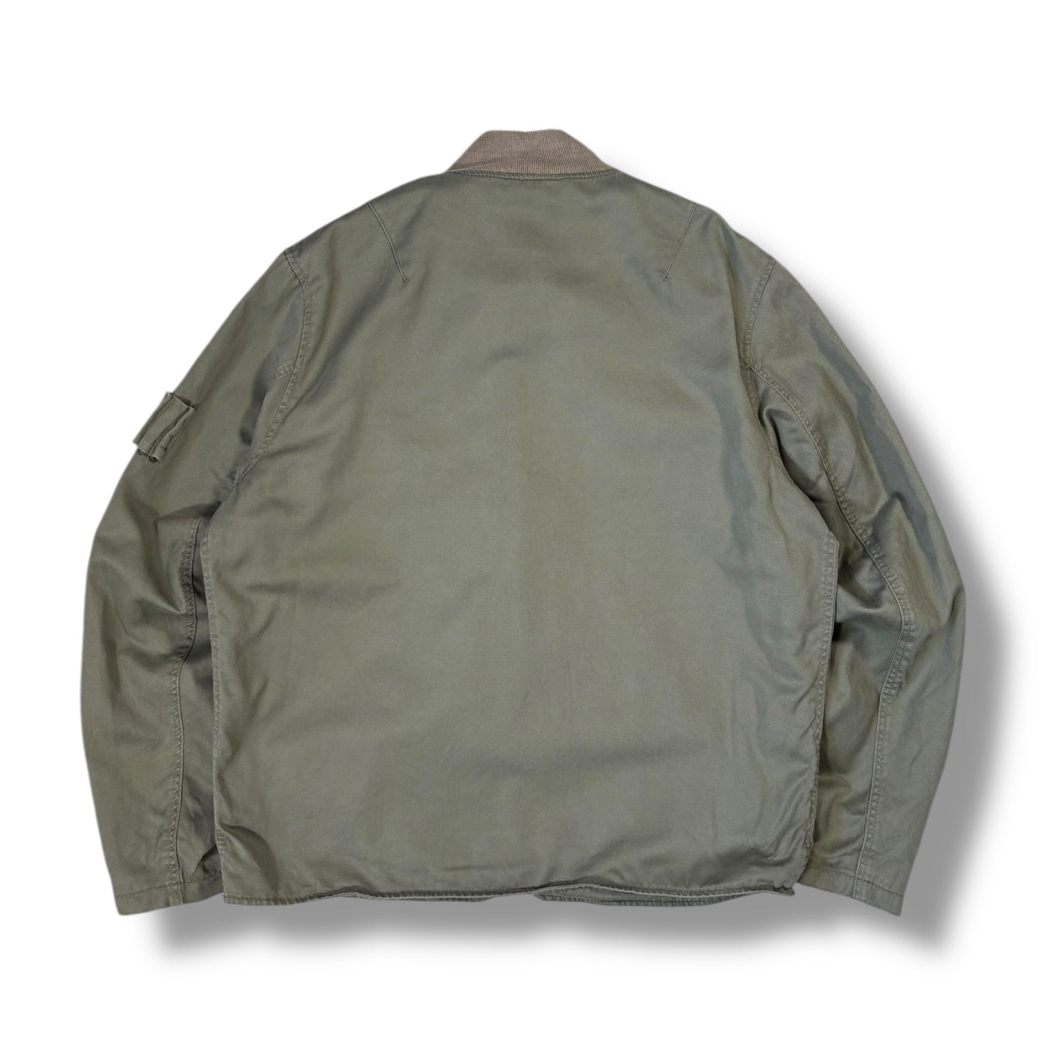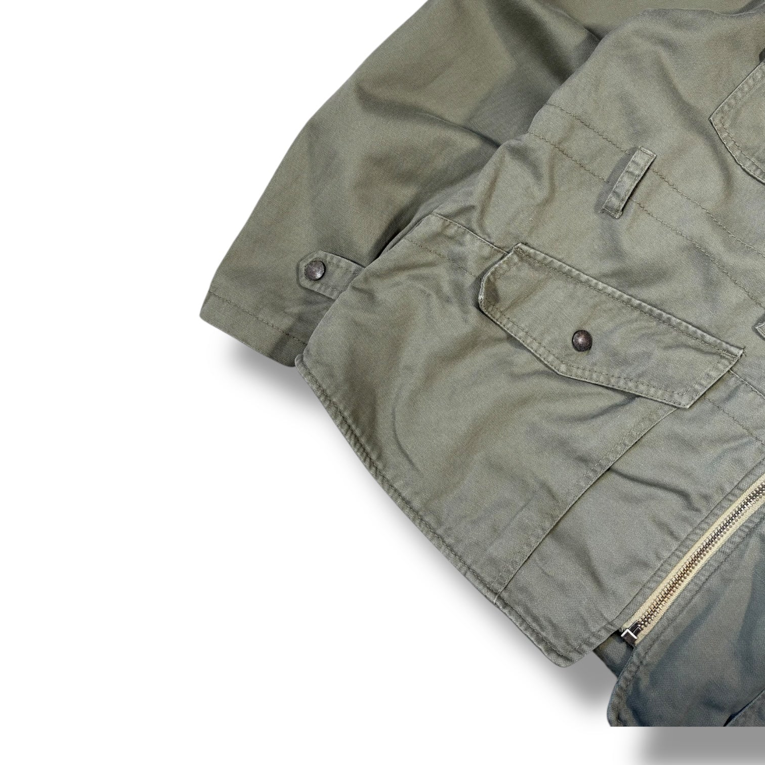 Khaki colourway, medium weight cotton material. Front 4 pockets are open using popper buttons, cuffs can also be adjusted this way. Ribbed neck collar with button fastening flap.