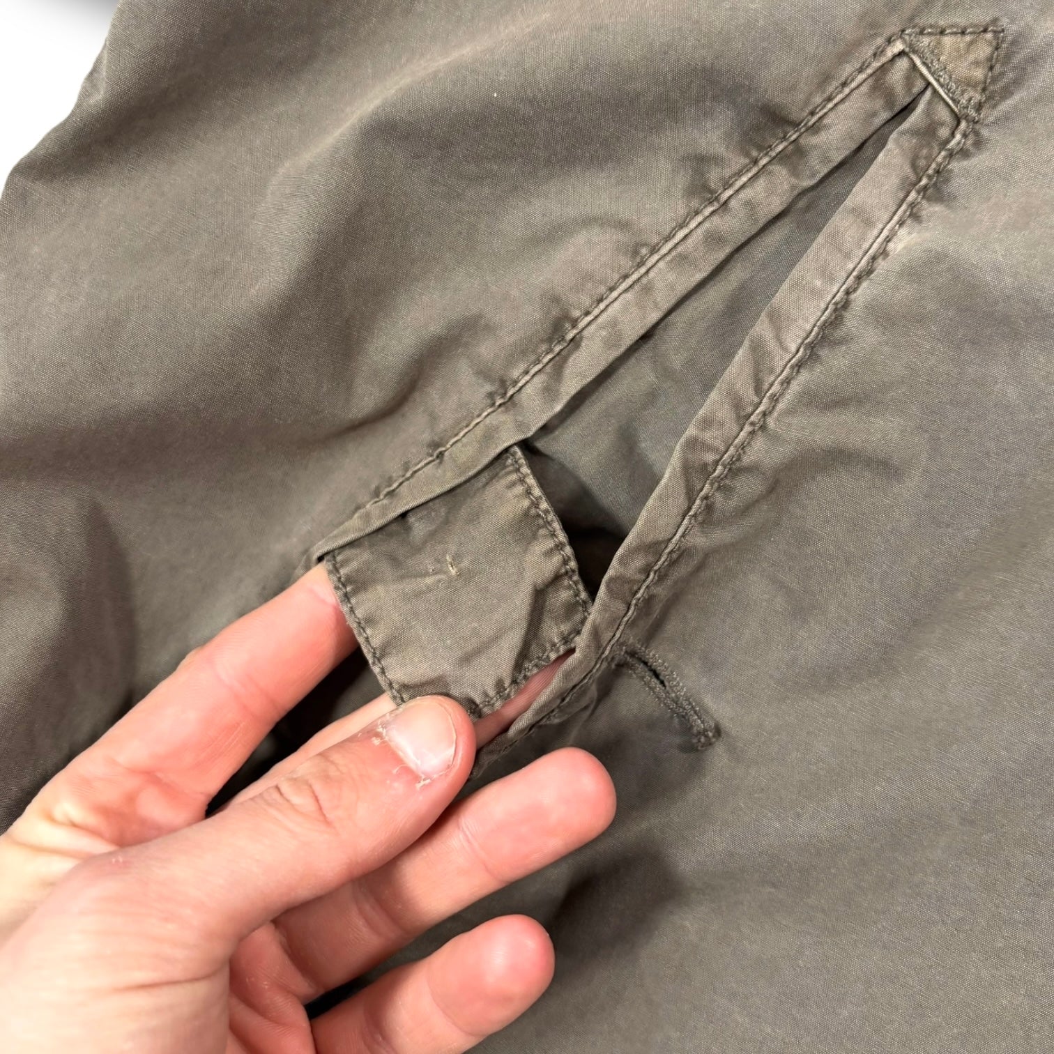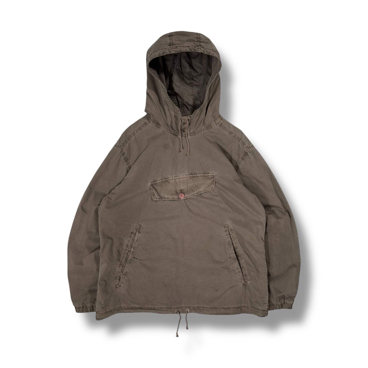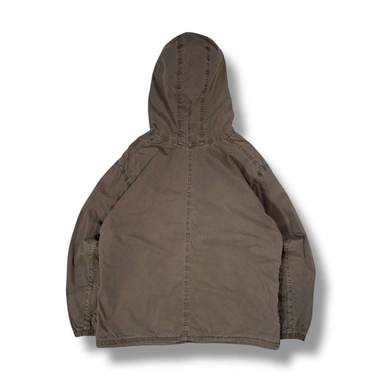 Brown colourway, It features a large button-secured chest pocket with a hidden inner compartment, two angled side-entry hand pockets with concealed button closures, and an adjustable drawcord hem for added fit customization. The hood includes a drawstring for protection against the elements. Subtle stitching details and reinforced seams.