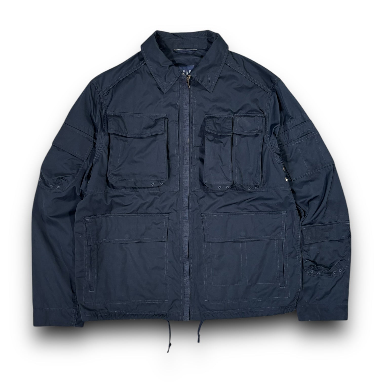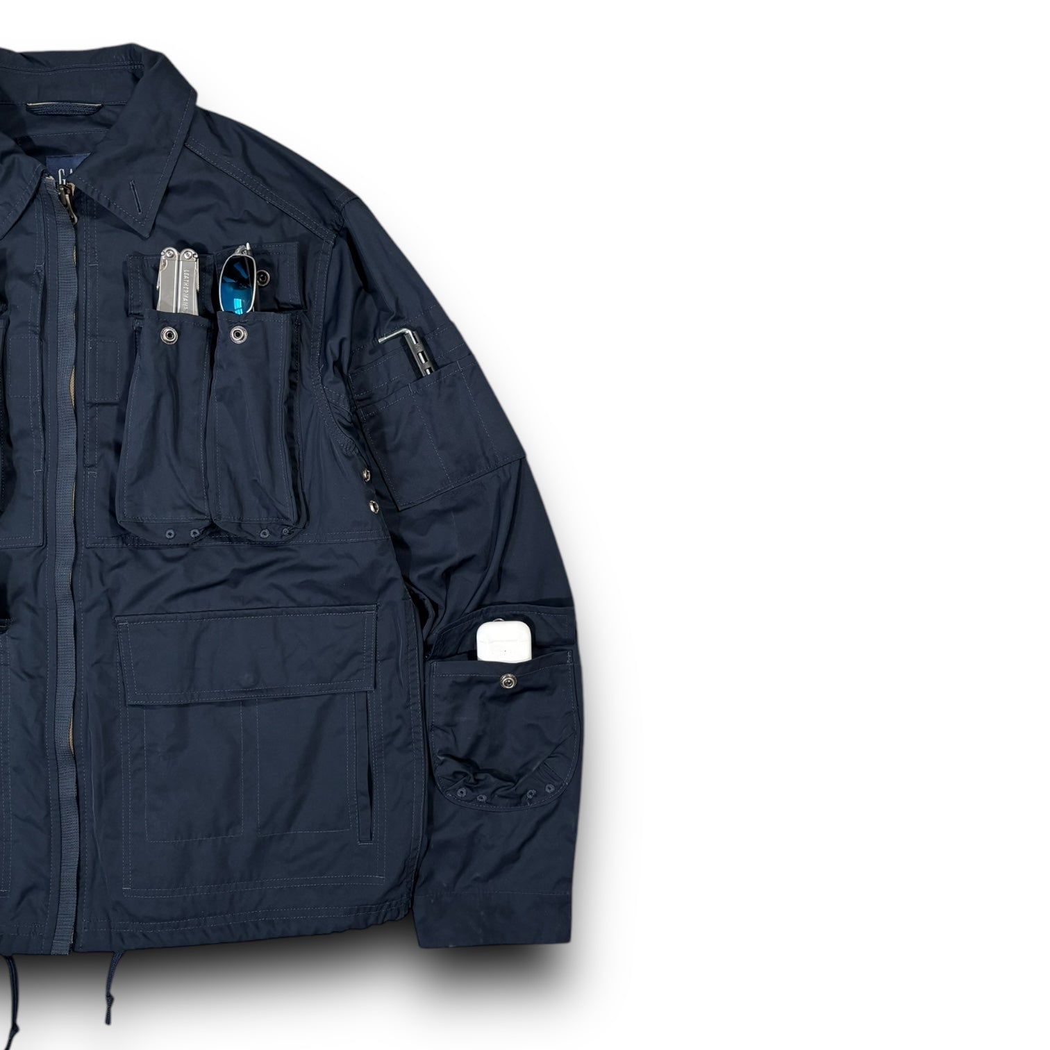Navy colourway, waterproof material. Drawstring adjustable hem. Three 3D chest pockets with another two larger pockets below these with hidden slit pockets at the side. Another three pockets located on the arms.