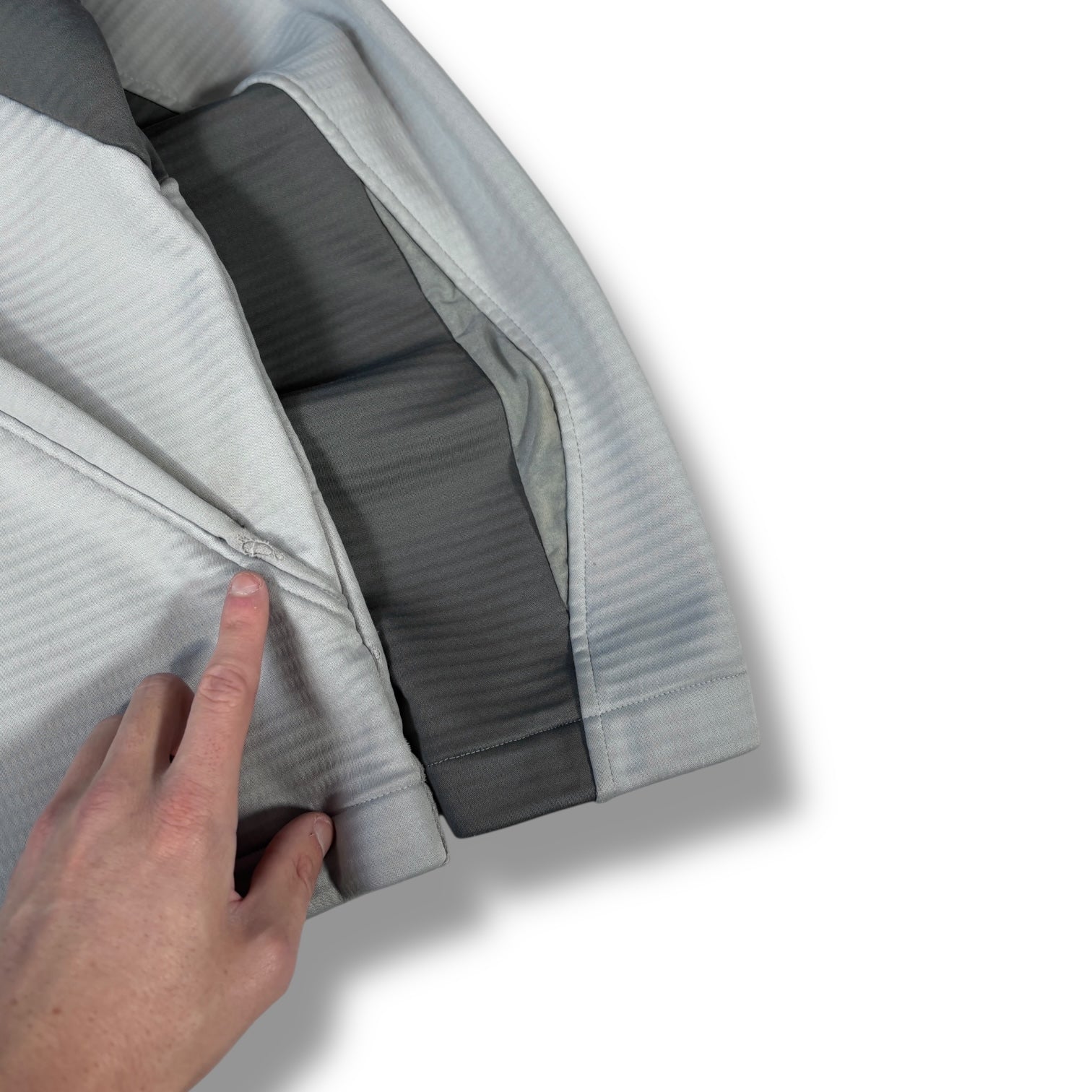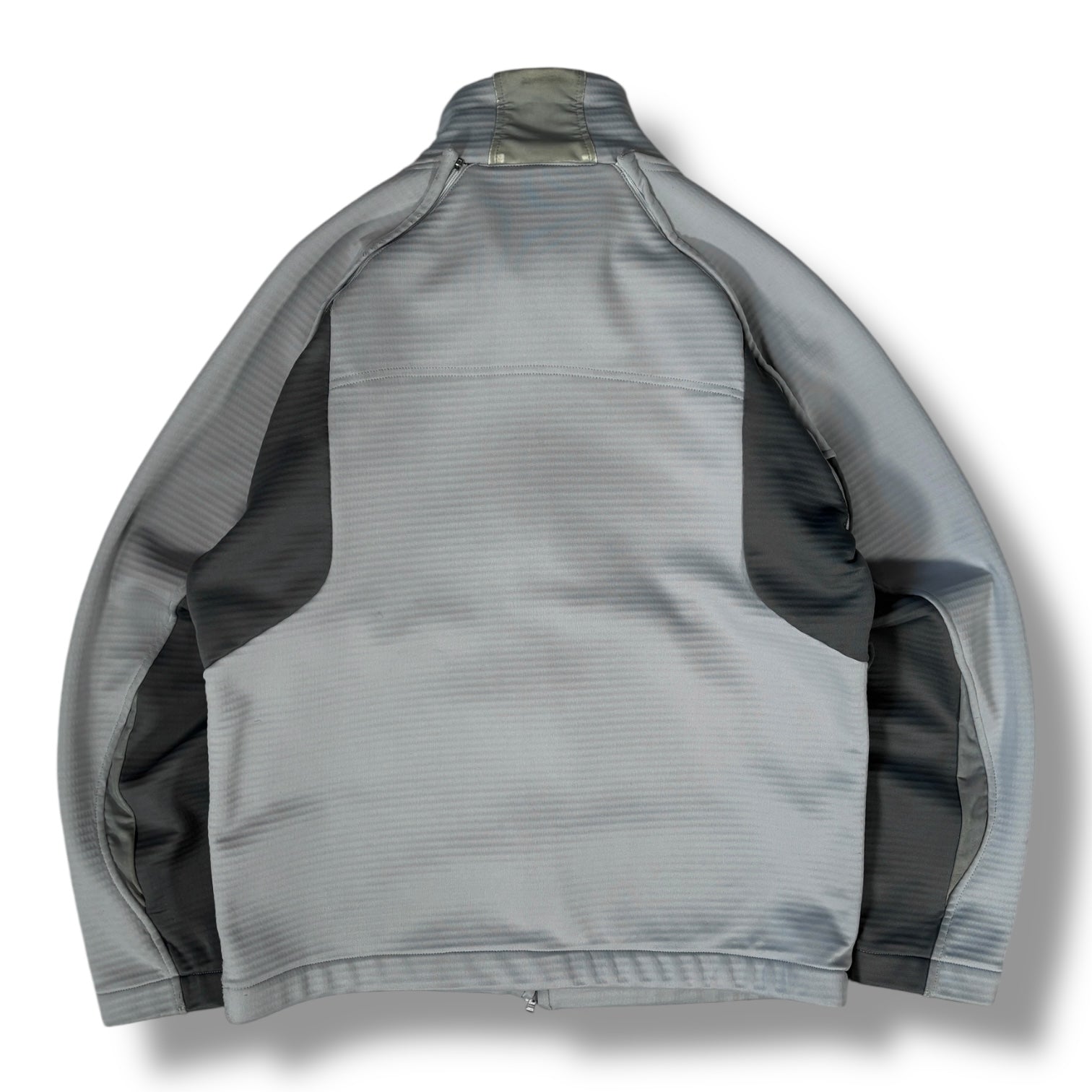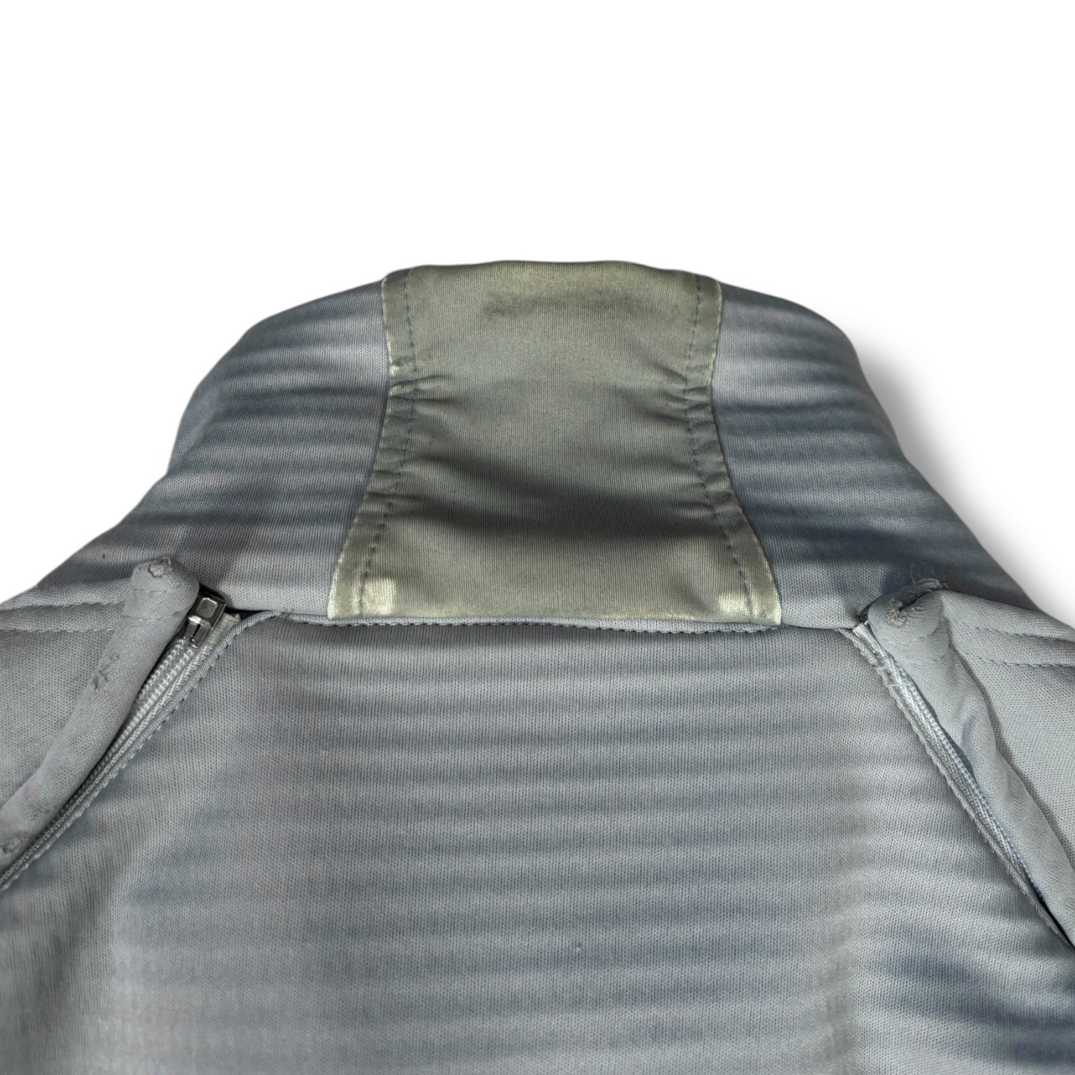 Light grey colourway with contrasting dark grey panels under the arms and down the sides. Constructed from a subtly striped technical fabric, it features a full front zip and two zippered hand pockets with angular construction. The sleeves are removable via concealed zippers at the shoulders, allowing conversion into a sleeveless silhouette. Finished with a high collar and tonal stitching throughout.