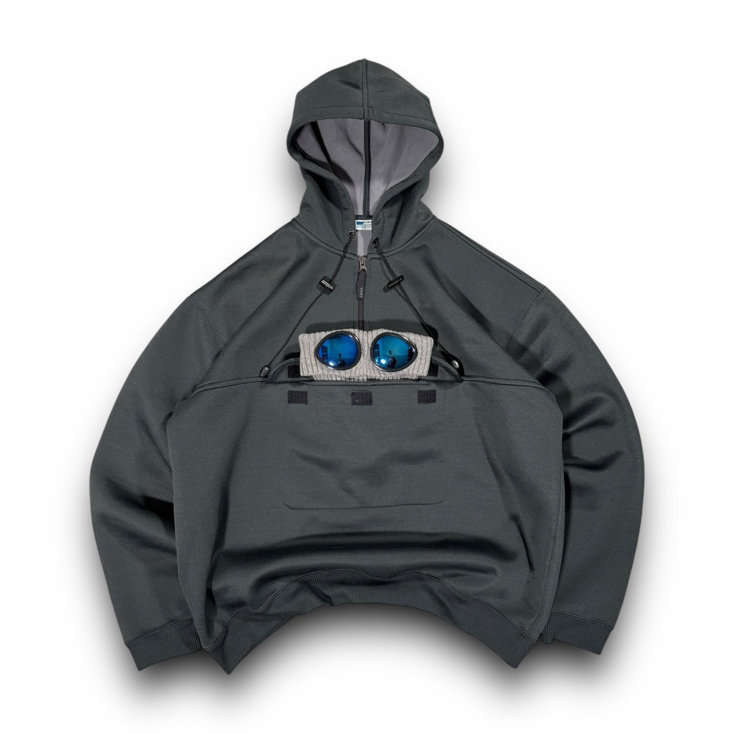 Dark grey colourway, the hoodies interior is completely thermally lined. Toggle adjustable hood, the hem is elasticated to create a boxy fit. Pocket pouch at the front is opened with 3 Velcro patches.