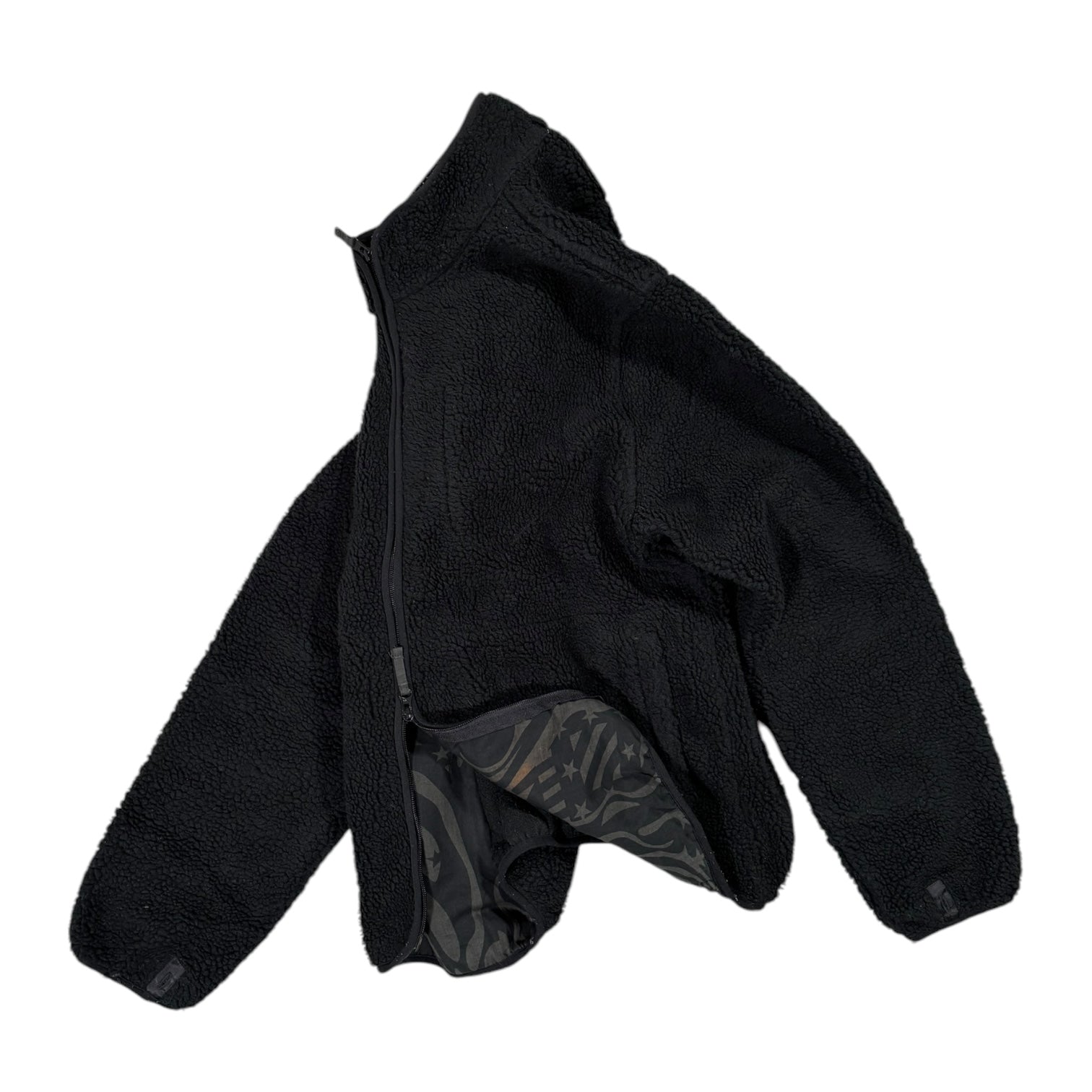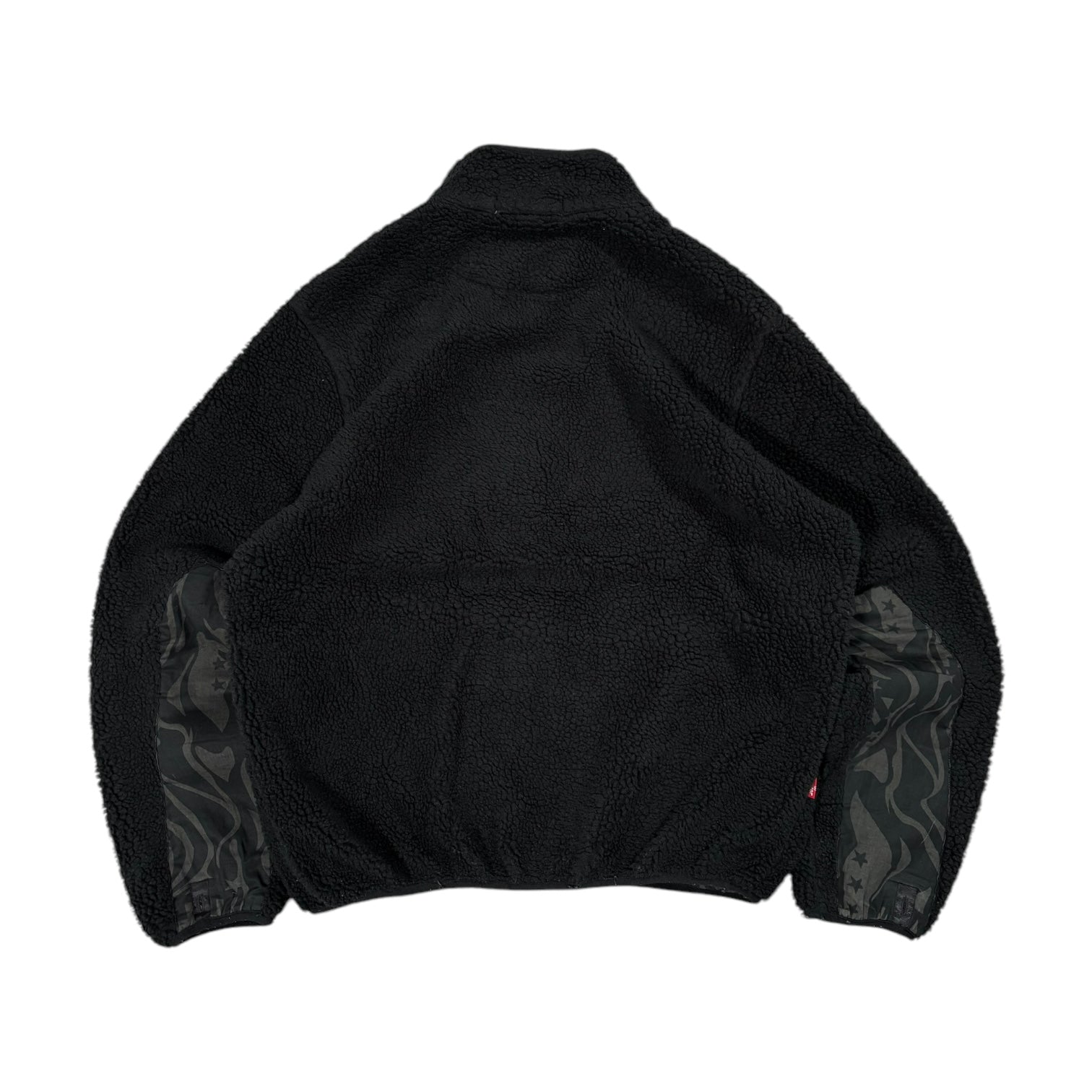 Black colourway, thick Sherpa fleece. Hem is fully elasticated creating a boxy fit. Elbow pads on both arms with the same lining as the interior. Double front zipper, two open pockets at the front of the fleece