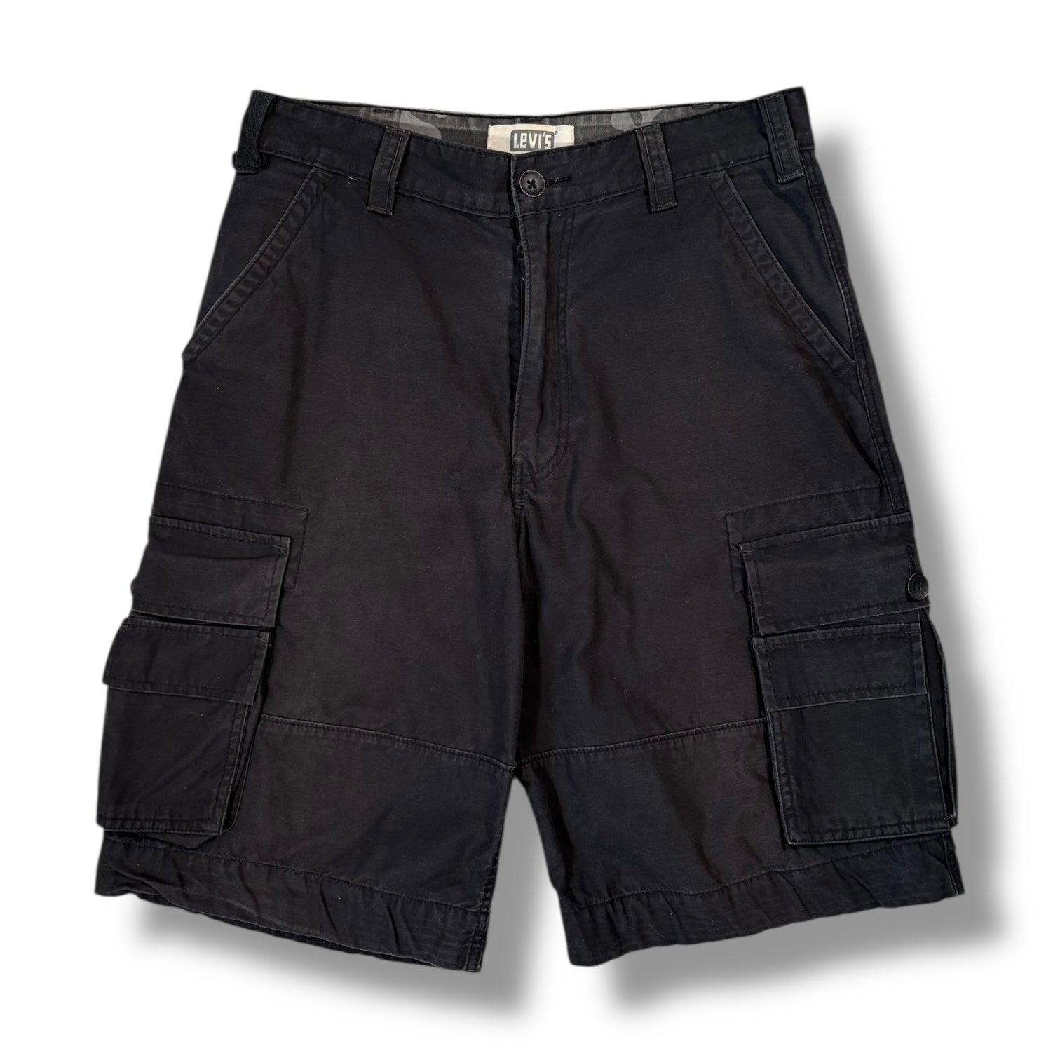 Black colourway, a thick heavyweight material. Features 2 open slit pockets, 4 pockets located at the bottom, with another 2 buttoned back pockets.