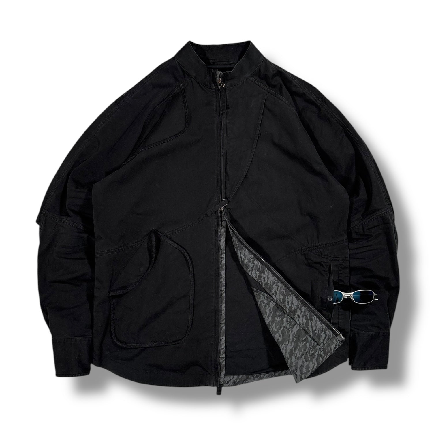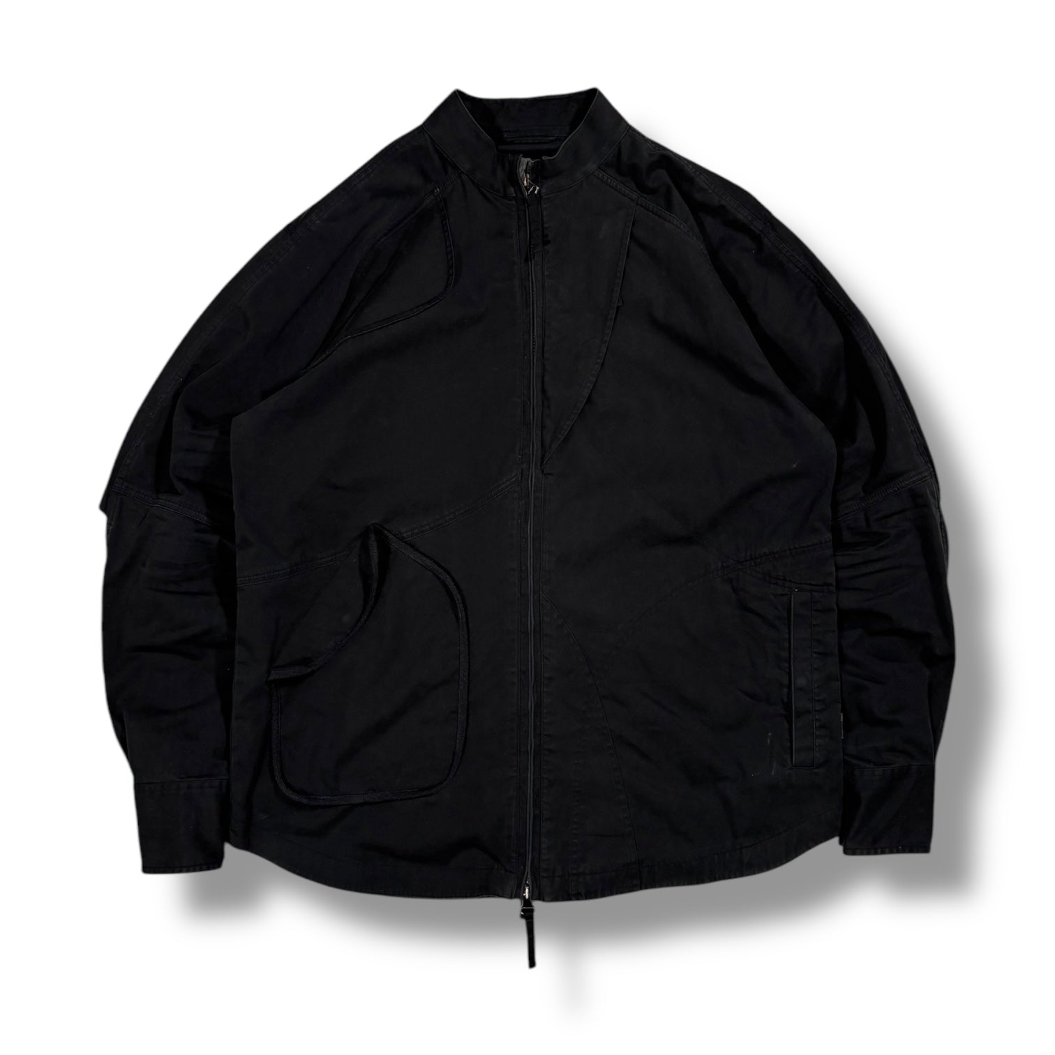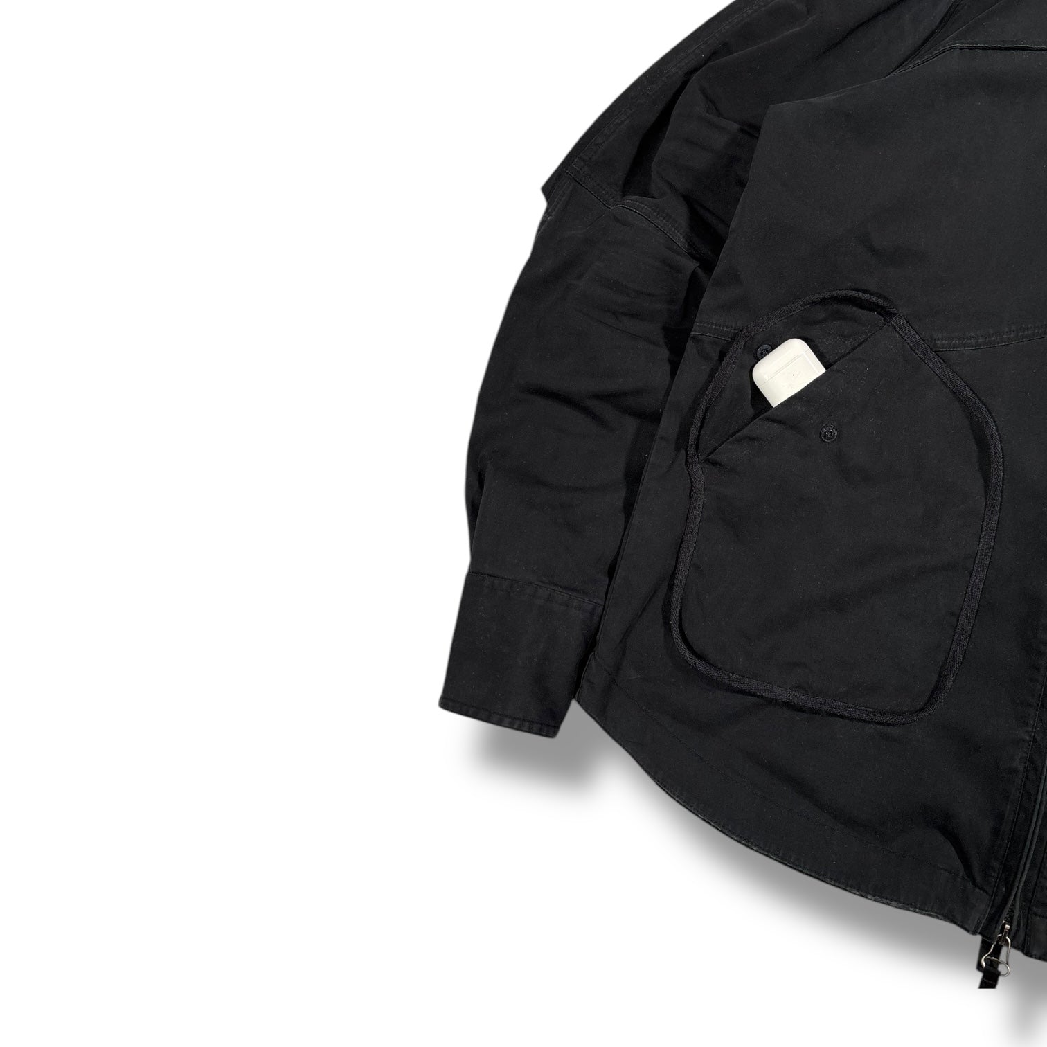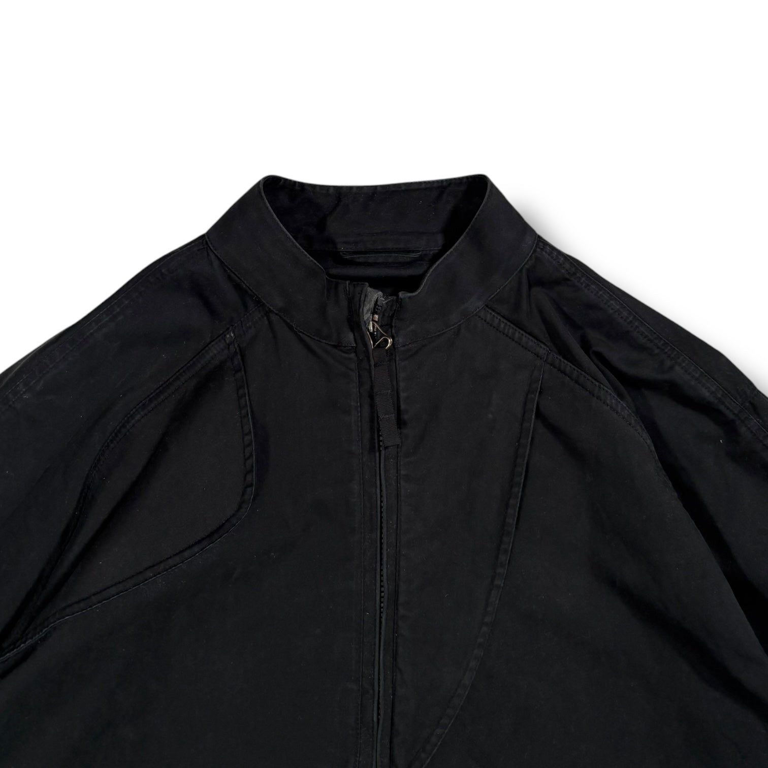 Black colourway, the jacket is lightweight with a cotton material. Two front button pockets at the bottom and another zipped hidden pocket on the chest. Dual front zipper, cuffs can also be adjusted using poppers.