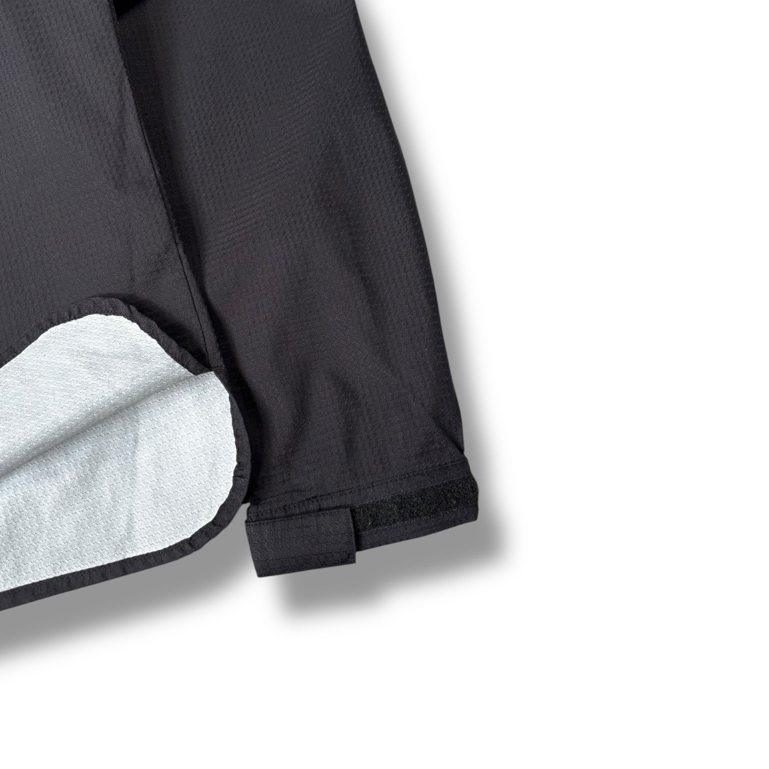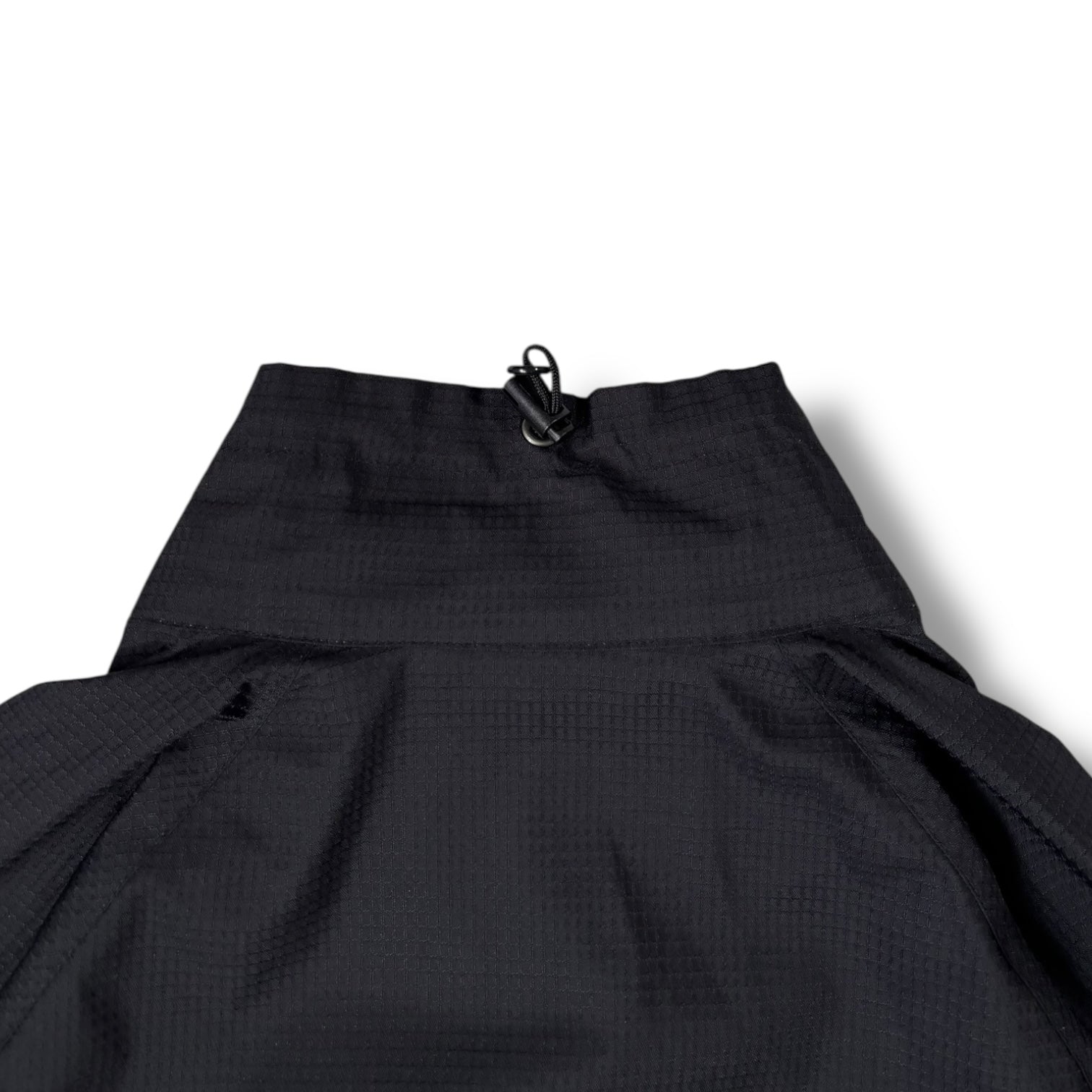 Black colourway with a subtle ripstop texture throughout the shell, this piece features a full zip front and stand-up collar with integrated adjustable toggle at the back. Twin zippered chest pockets, each finished with branded pull tabs. The interior is lined with a lightweight mesh for ventilation, while hook-and-loop adjustable cuffs. Additional detailing includes a vented back yoke with a hidden mesh panel and inner storm flap.