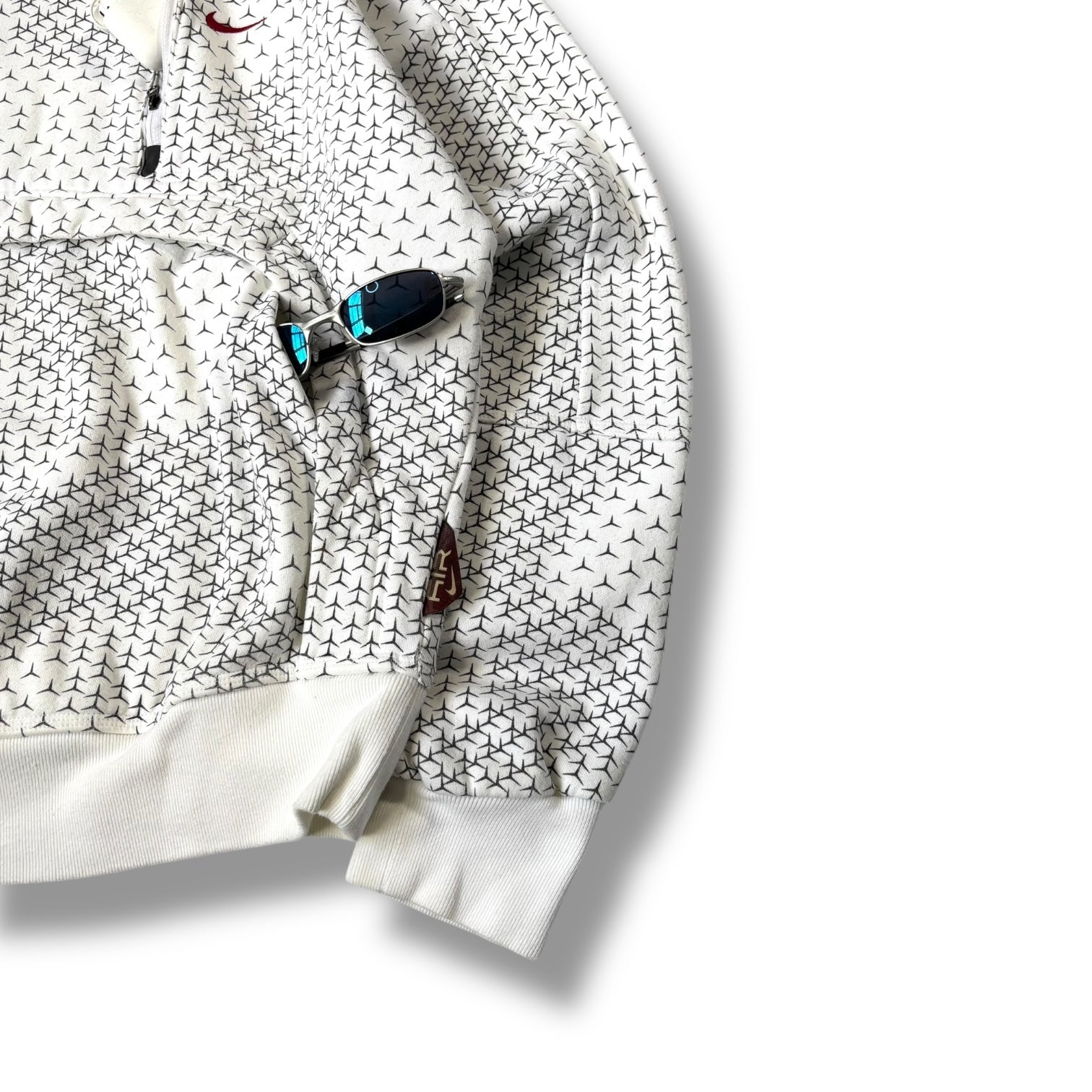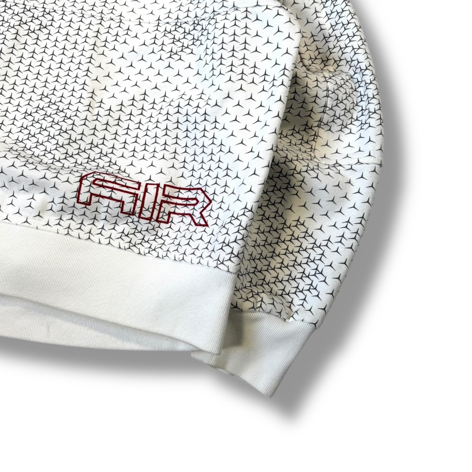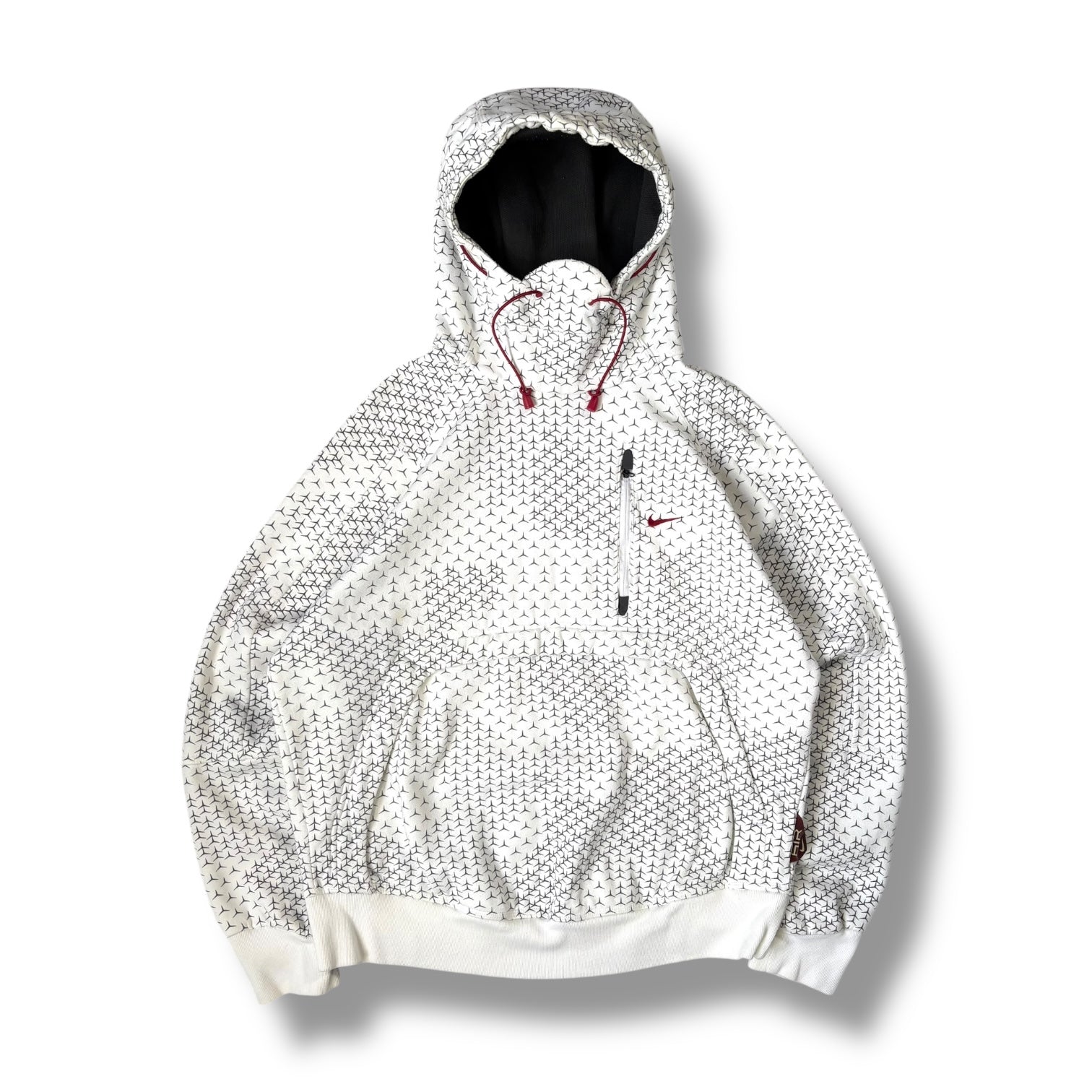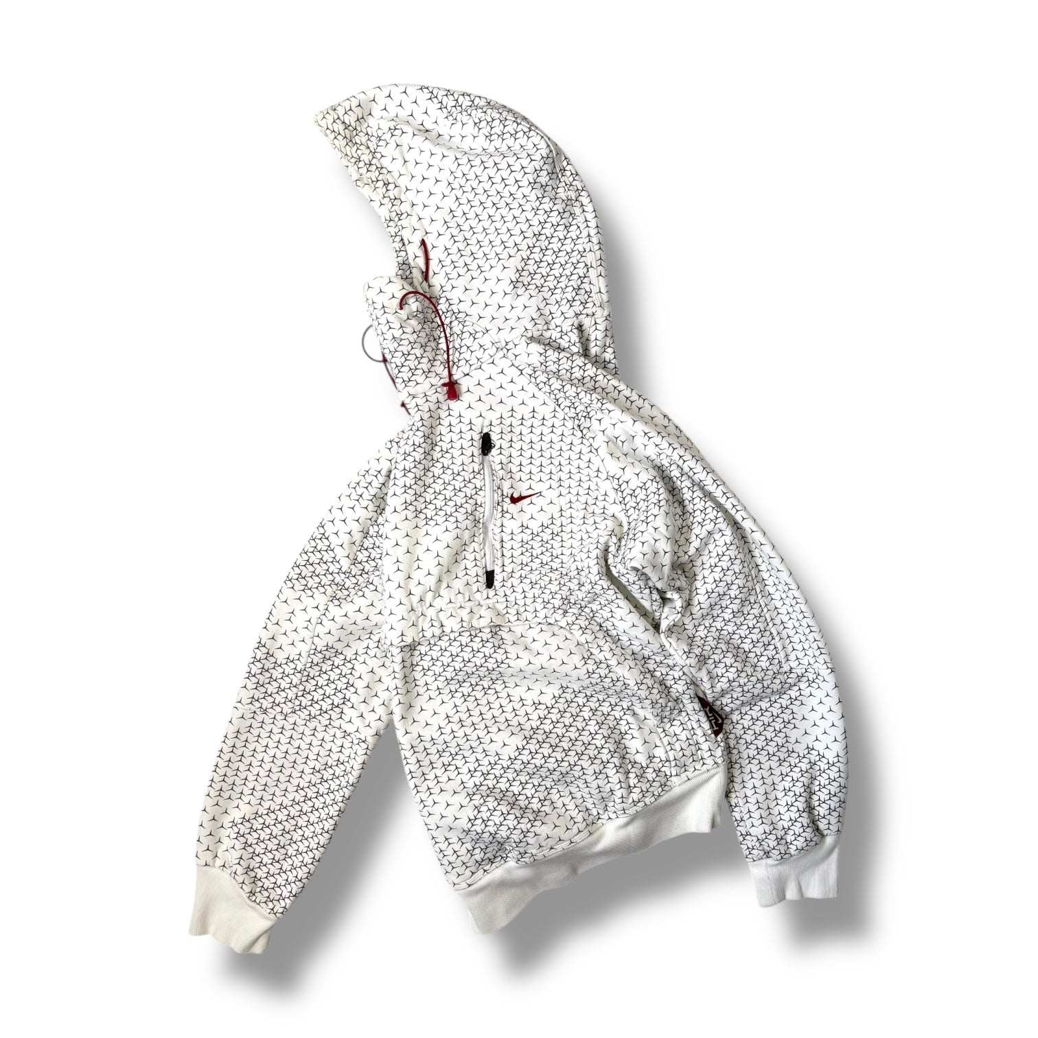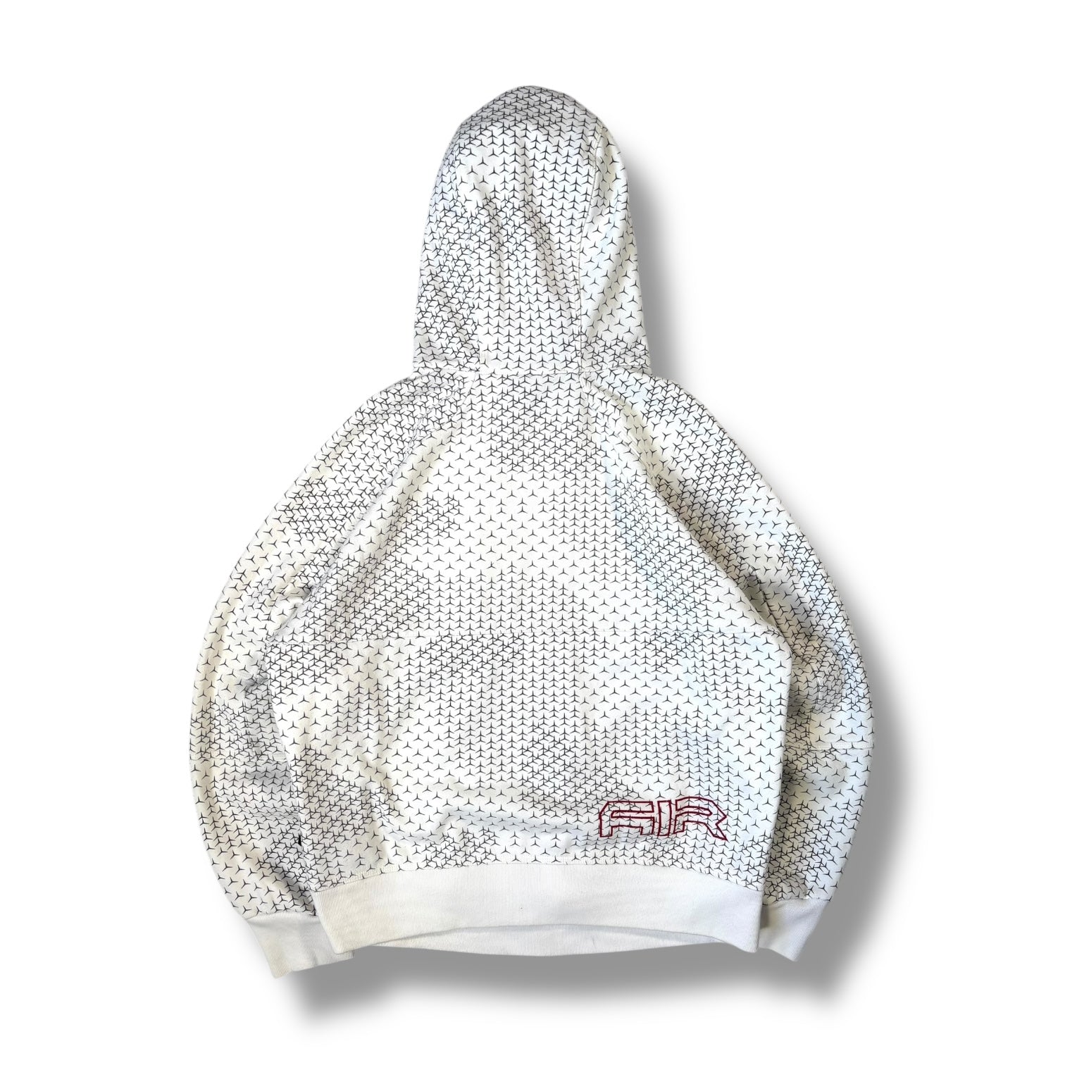 White colourway base featuring an all-over black geometric print. It includes a front kangaroo pocket for convenient storage along with a vertical zip pocket on the chest. The hood is fully adjustable with bright red drawcords, and the cuffs and hem are ribbed for a secure fit. A subtle embroidered detail on the front and a bold “AIR” graphic at the back hem.