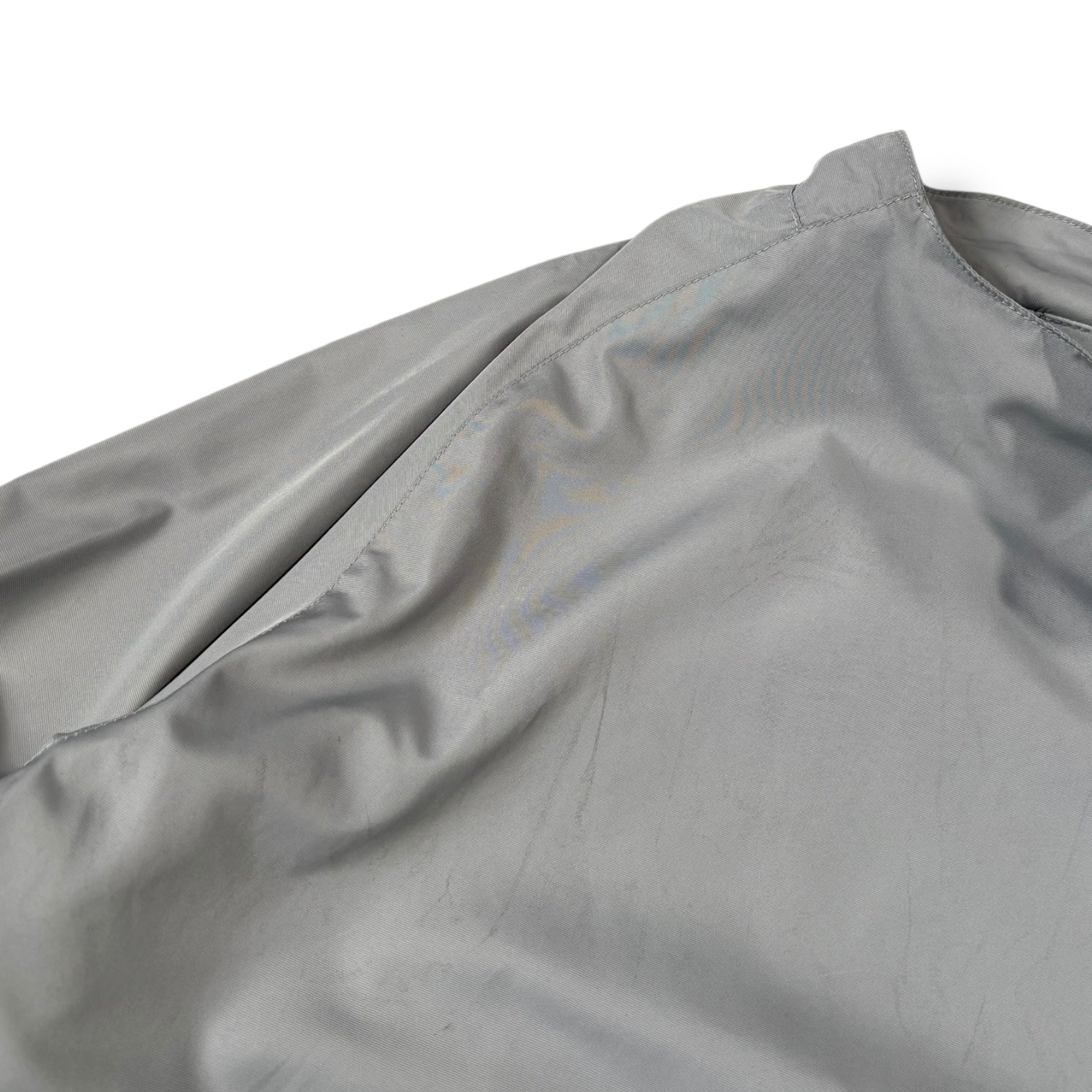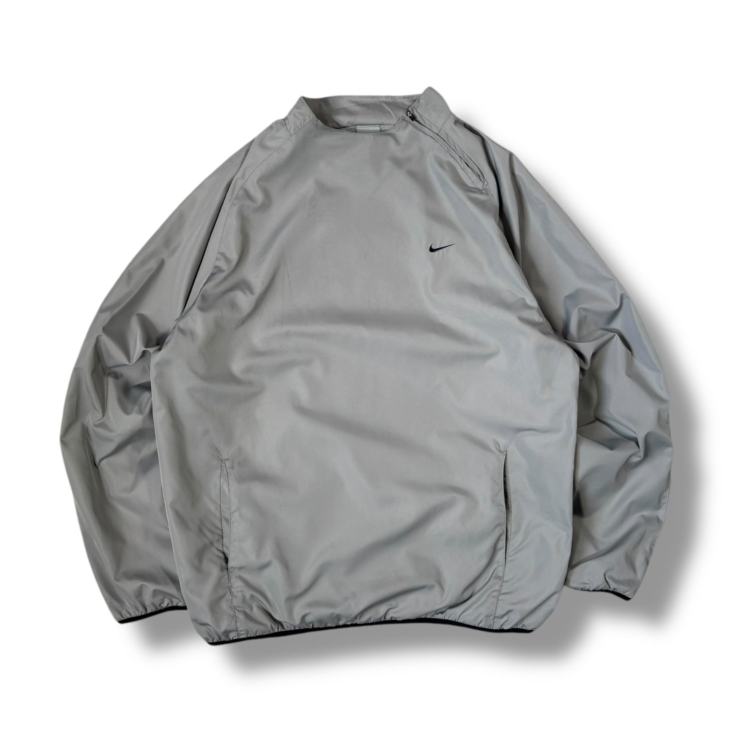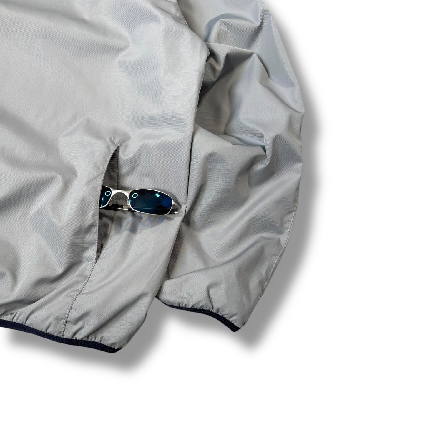 Grey colourway, light weight track jacket material. Asymmetrical zip at the neck. Embroidered swoosh, also features 2 open slit pockets, another pocket on the back of the jacket.