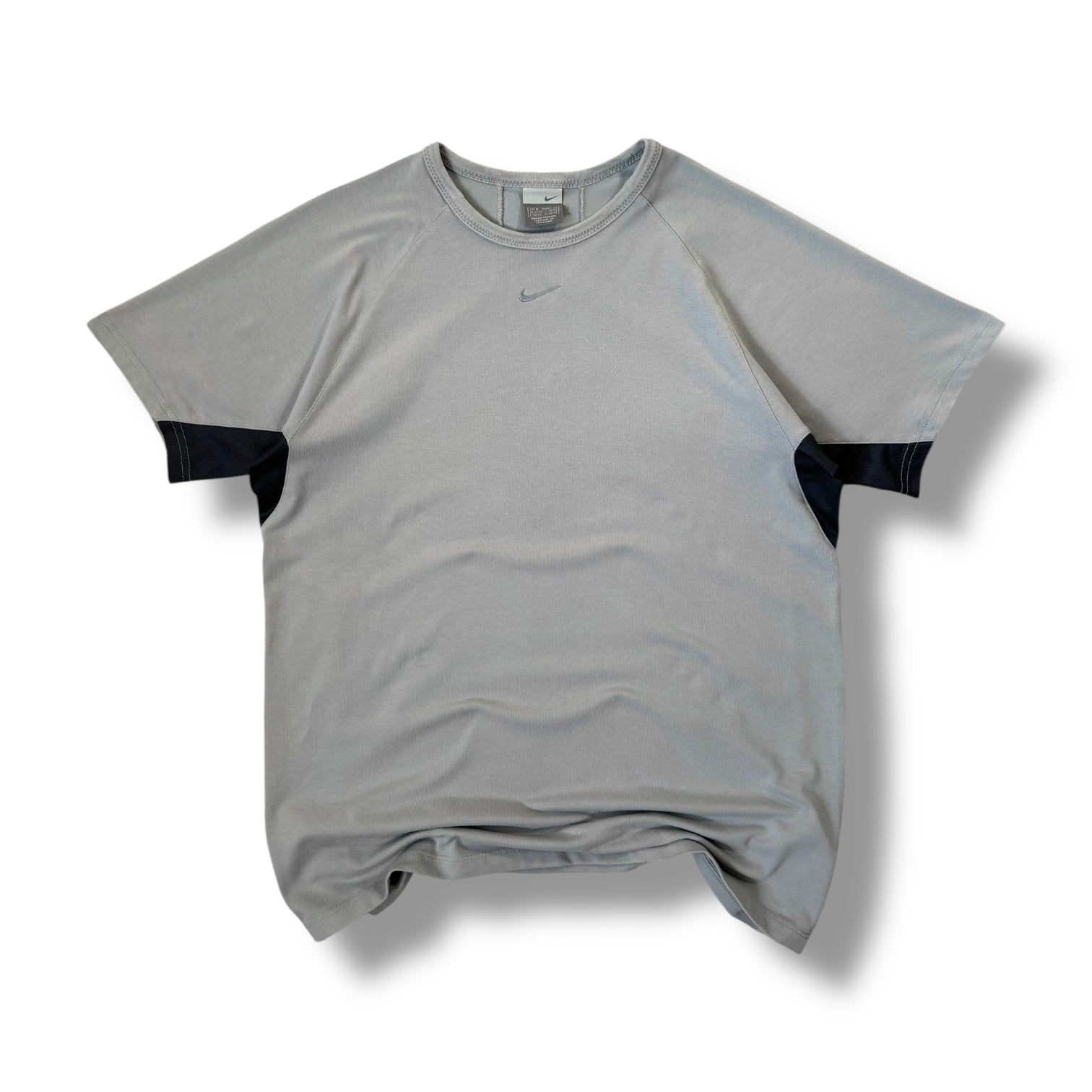 Light grey colourway with deep navy mesh-like panels under the arms, tonal stitching throughout, while the back includes two parallel reflective stripes.
