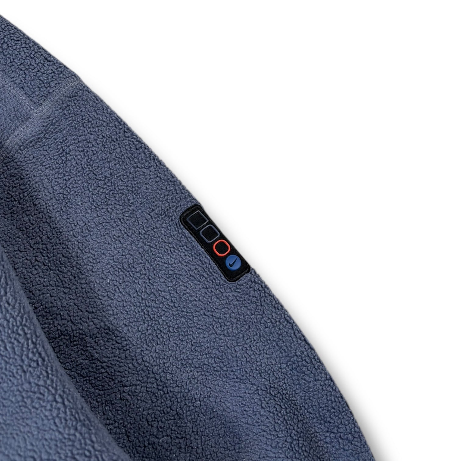 Blue-grey colourway with a contrasting red interior lining and black trim at the collar and cuffs. Features a half-zip front and a loose, oversized silhouette. Nike logo on the left sleeve in vertical red and on a patch at the upper right arm. The back shows tonal seam detailing.