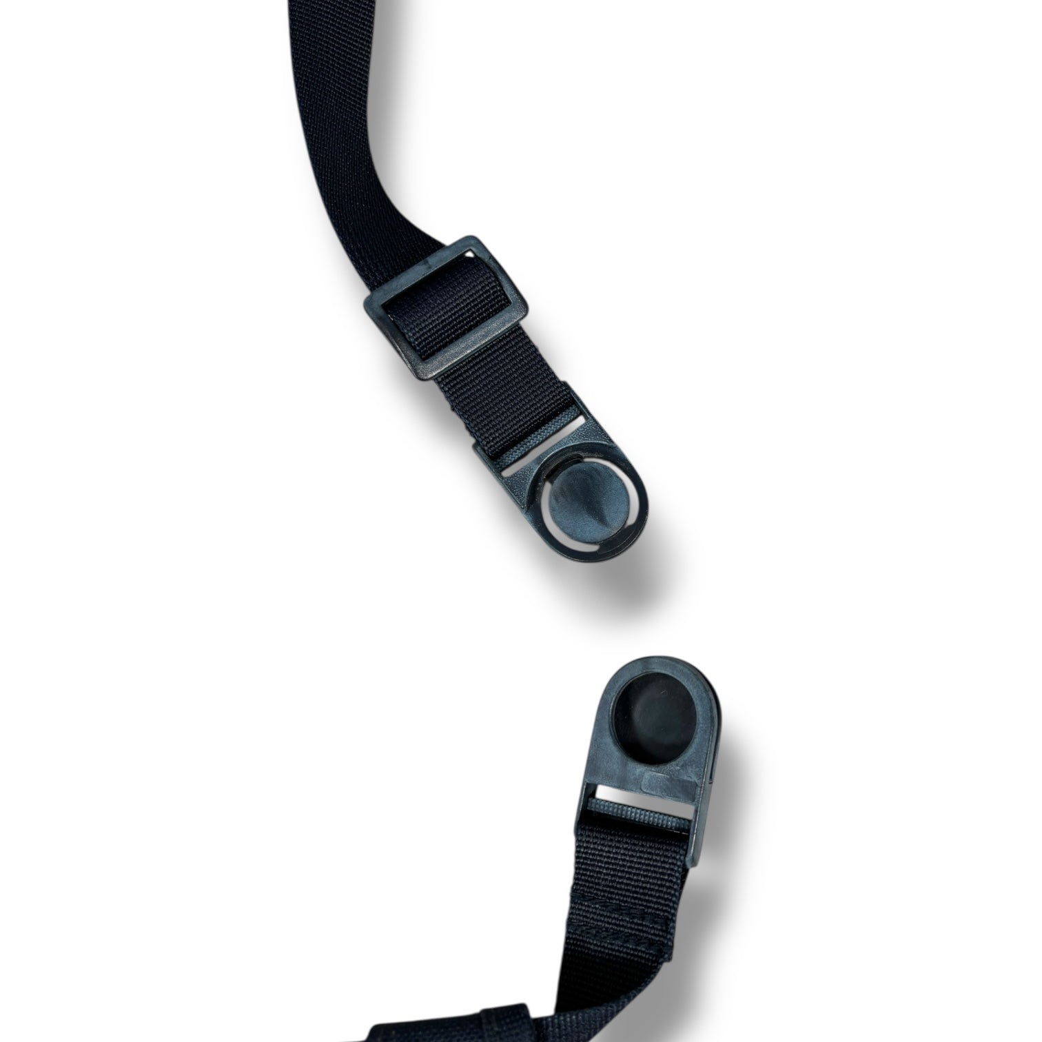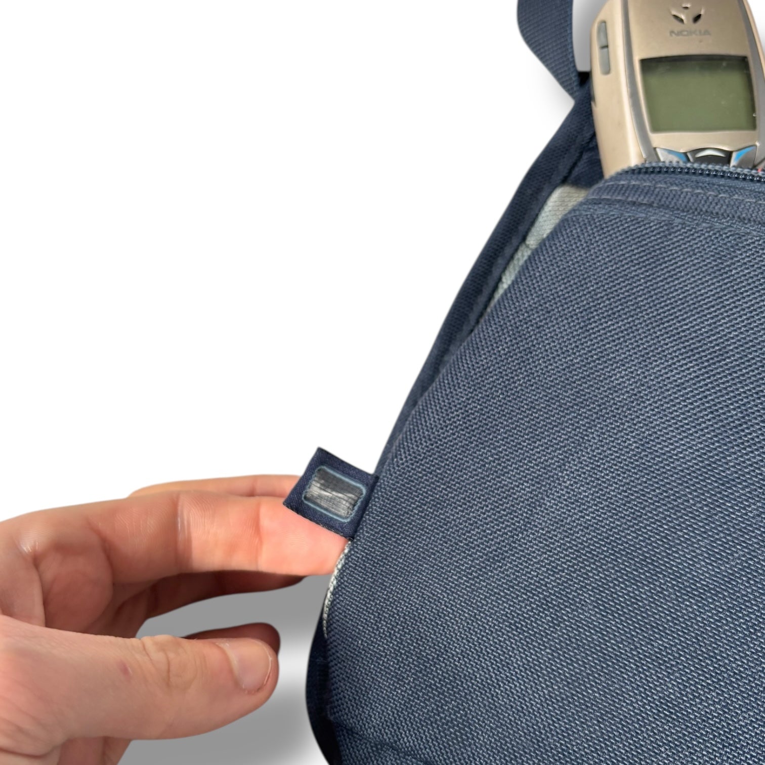 Navy colourway featuring a single main compartment secured by a curved zip closure. The front section includes a secondary zip pocket, and mesh side panels are stitched into each side. The rear features an open-top slot pocket with a stitched tab at the centre. An adjustable strap runs through dual top loops and fastens at the side with a circular snap buckle.