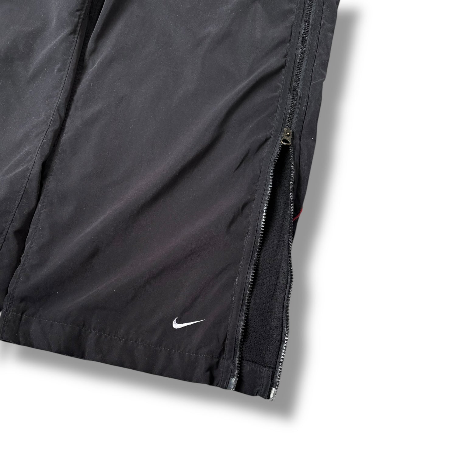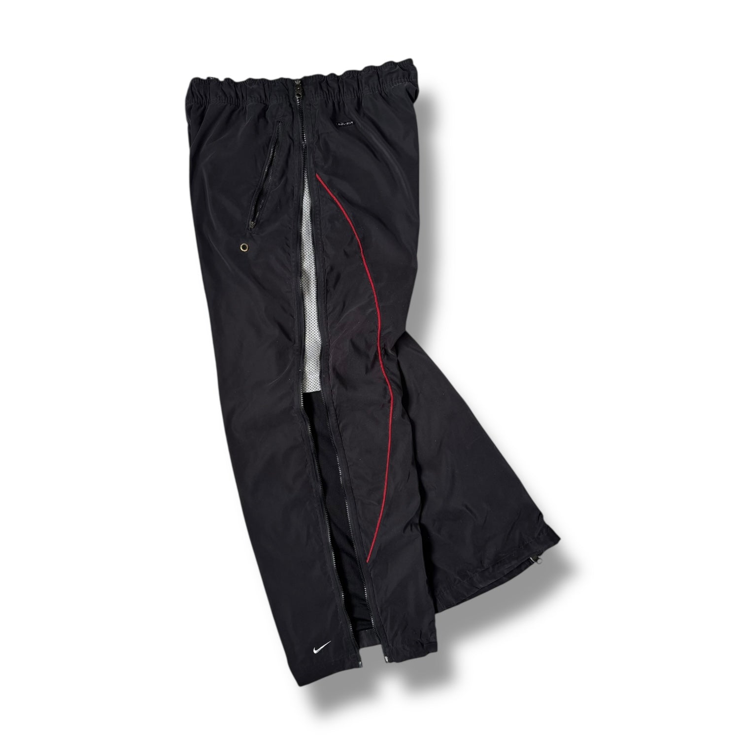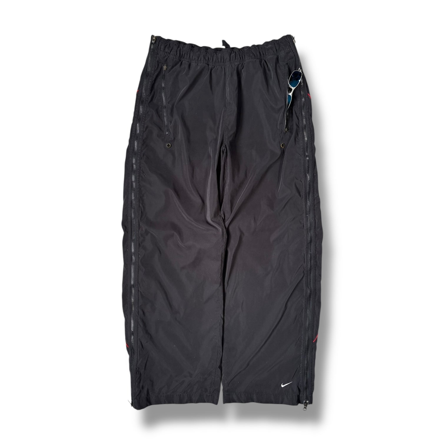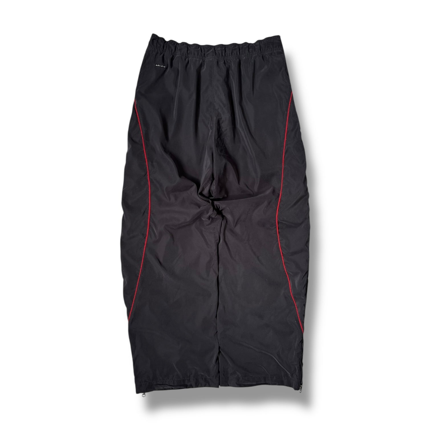 Black colourway with a lightweight, water-resistant finish and a relaxed silhouette. Features include zippered side pockets, full-length side zips for ventilation or easy removal, and subtle ventilation grommets at the front. The elastic waistband is adjustable with an inner drawcord, while red piping along the sides adds a bold accent. Mesh lining enhances breathability, and zippered hems allow for customizable fit and styling.