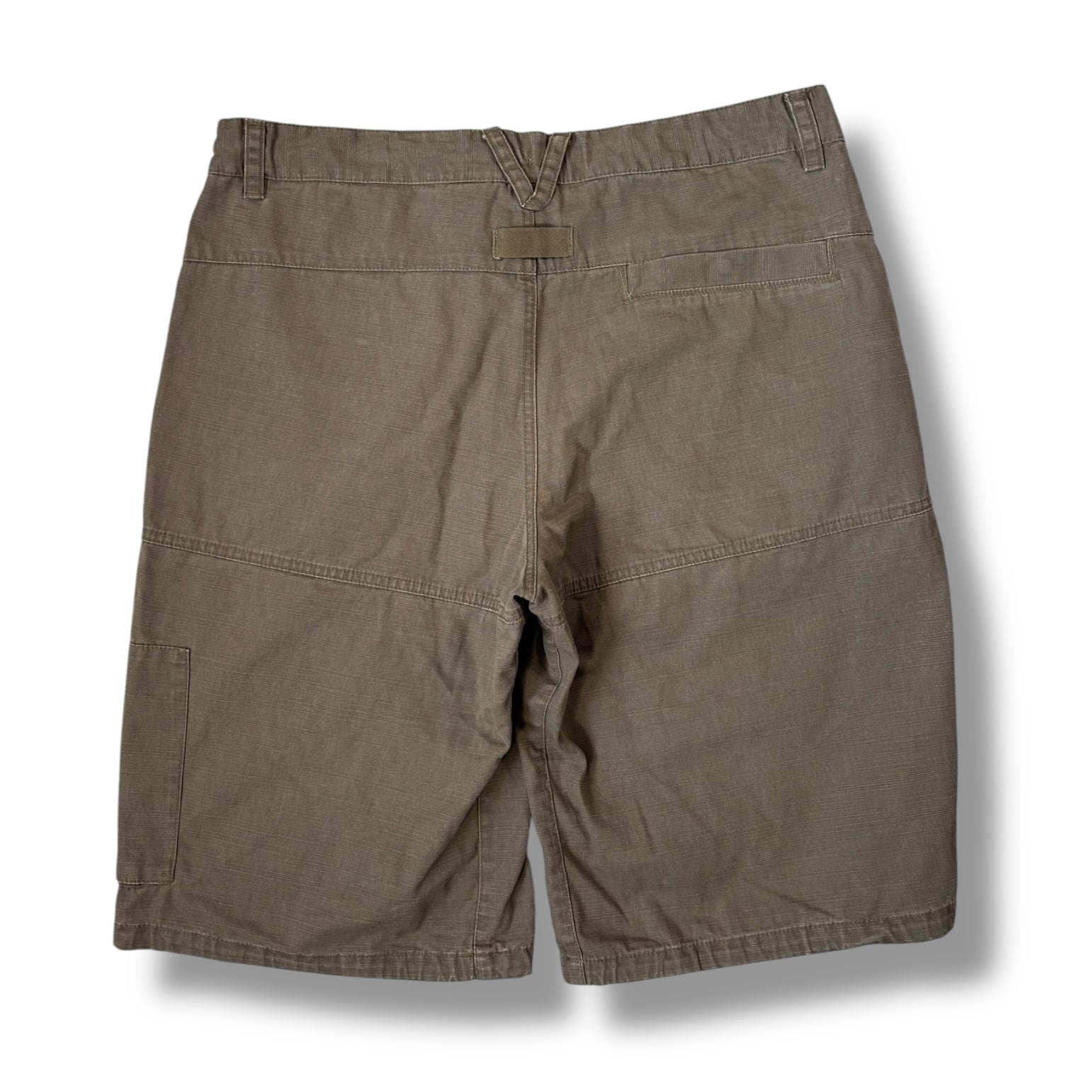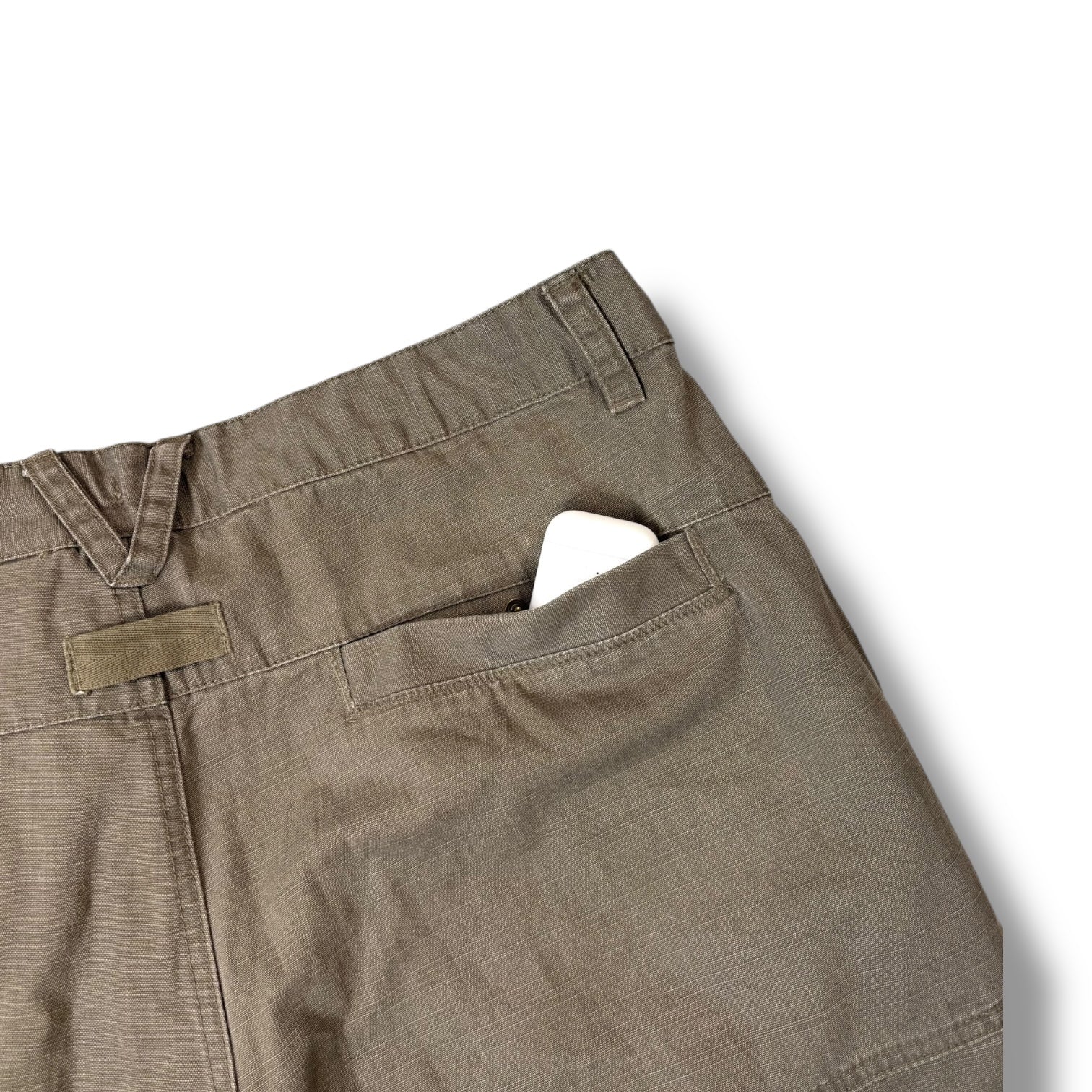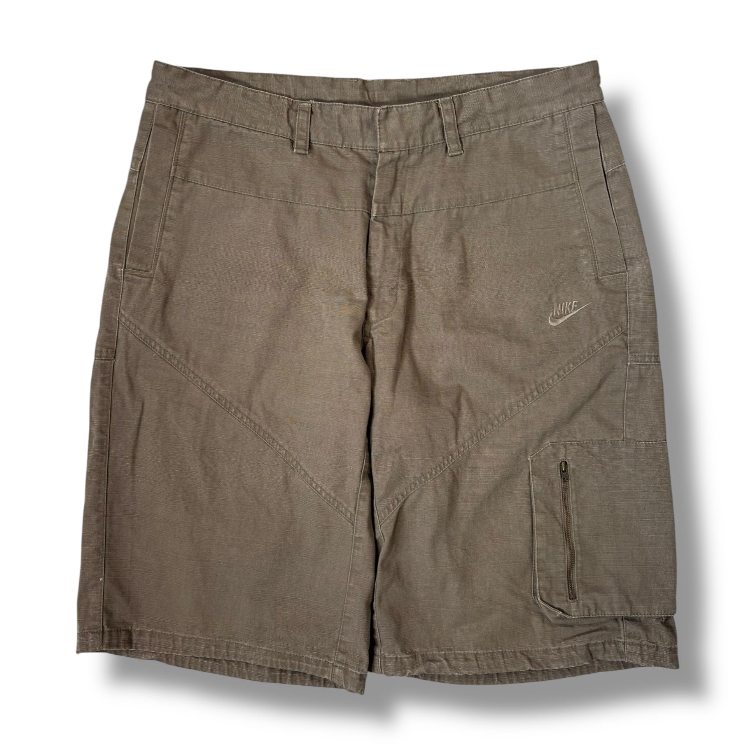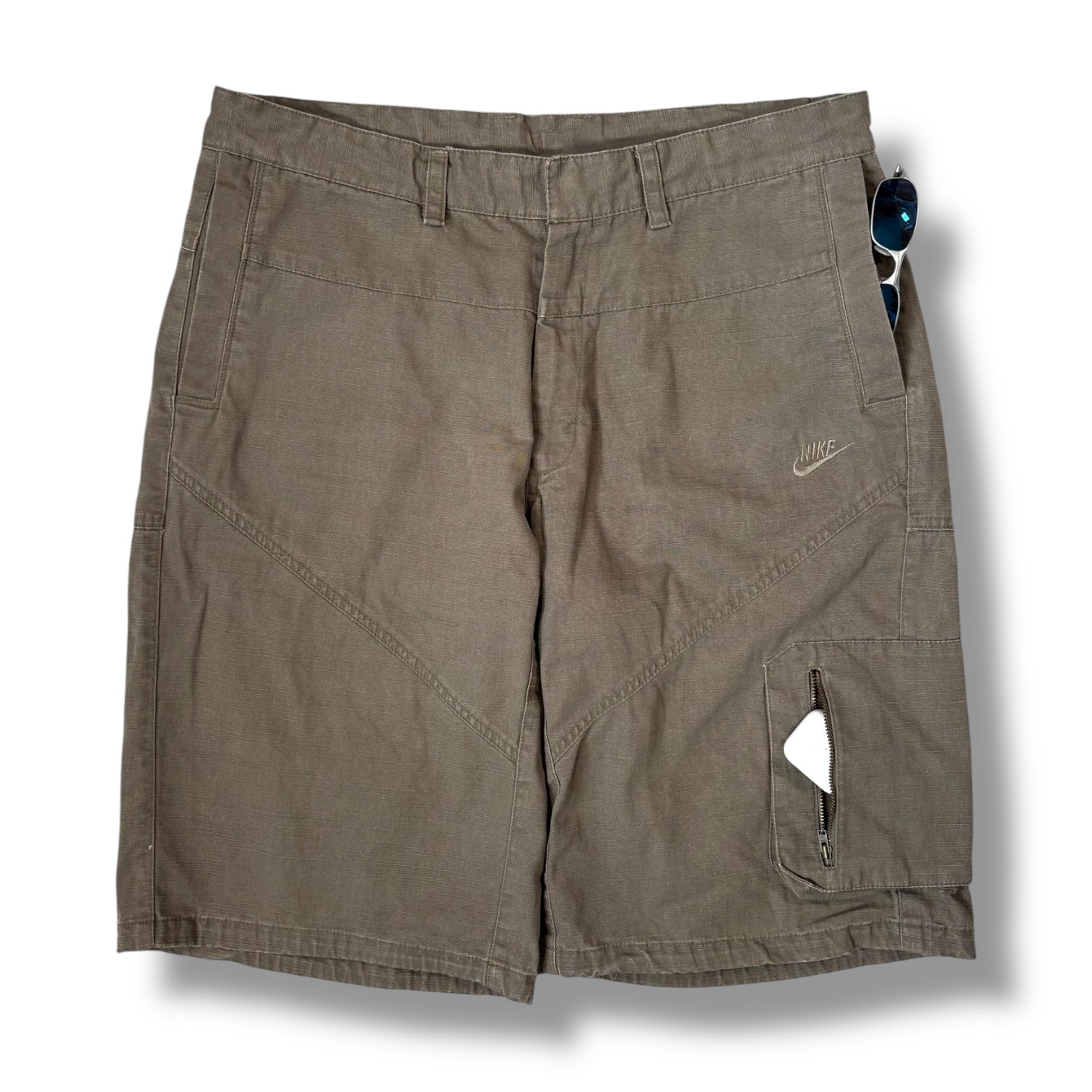 Brown colourway with a durable ripstop texture, this piece features a relaxed fit with a slightly structured design. It includes two standard front pockets, one of which is embroidered with a tonal Nike logo, and a zippered utility pocket on the lower right leg. The waistband has belt loops and a built-in drawstring for secure adjustment. Rear detailing includes a single welt pocket and a V-notch at the center back with a small velcro tab accent.