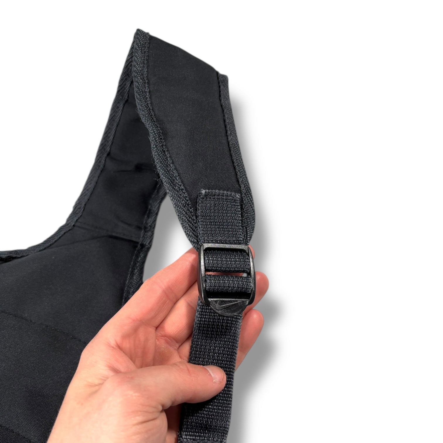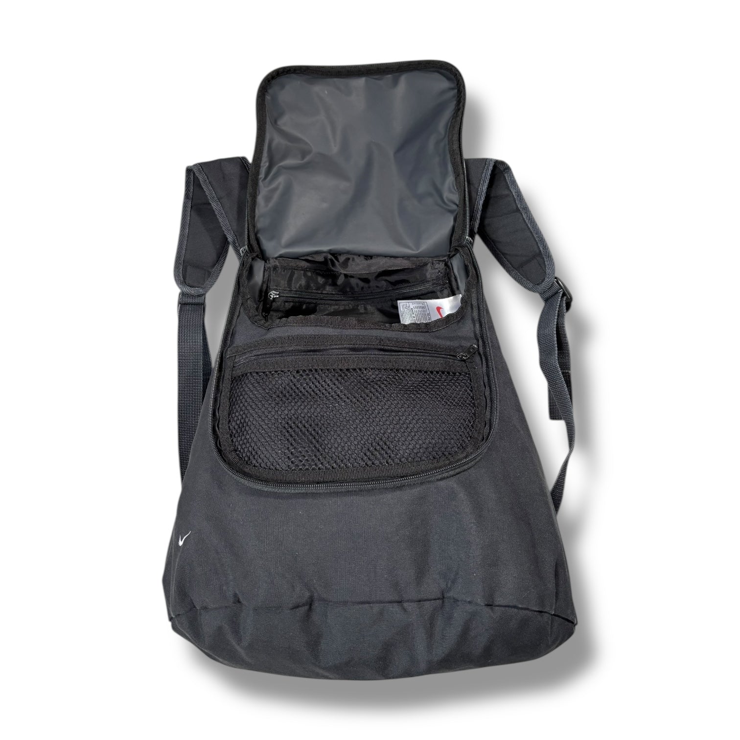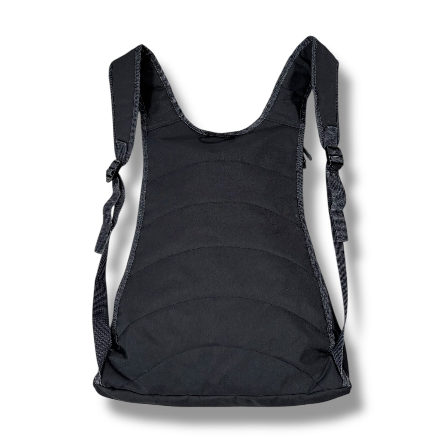 Black and grey colourway featuring a structured silhouette with padded shoulder straps. The front showcases a large zippered pocket with a mesh outer layer and an additional upper zip pocket for quick-access items. Inside, a dual-compartment layout includes internal zip storage for organization. Adjustable straps and a lightly reinforced back panel ensure a secure fit.