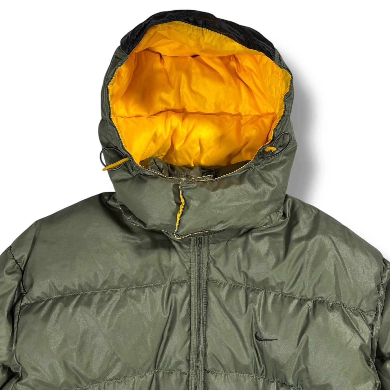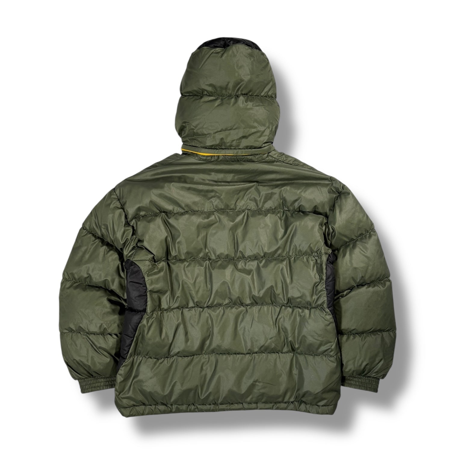 Dark green colourway, the jacket is lightweight but heavily insulated with down. Toggle adjustable hem and hood, the hood can also be removed using a zipper. 2 front zipped pockets, peaked hood and adjustable cuffs.