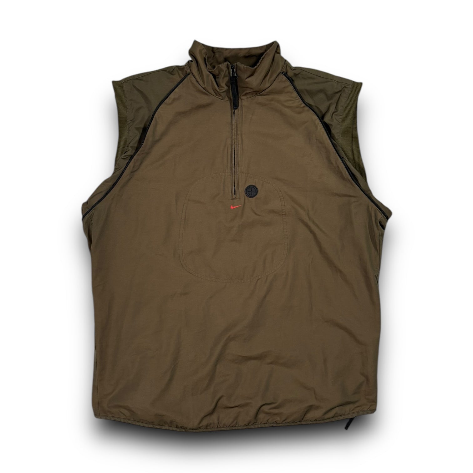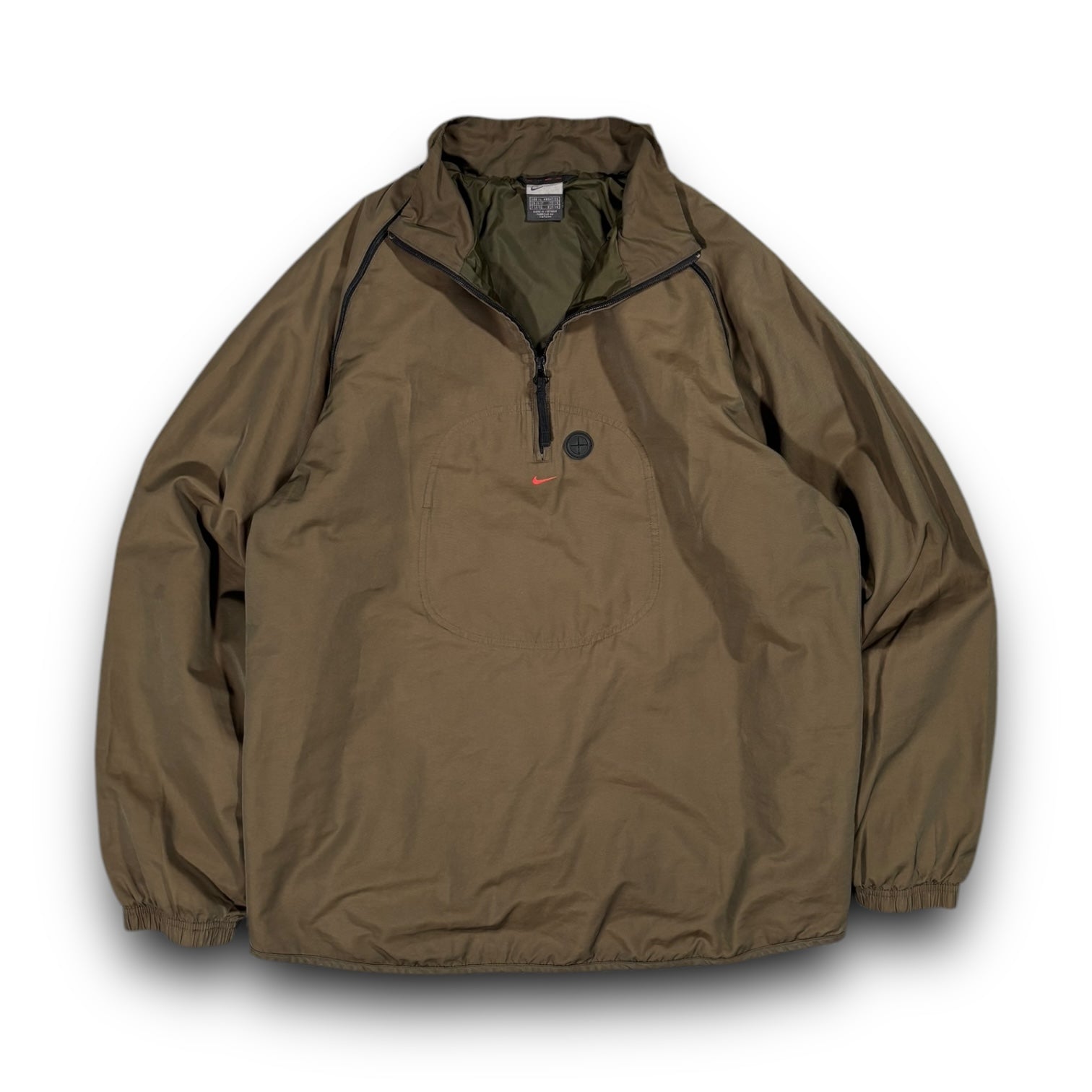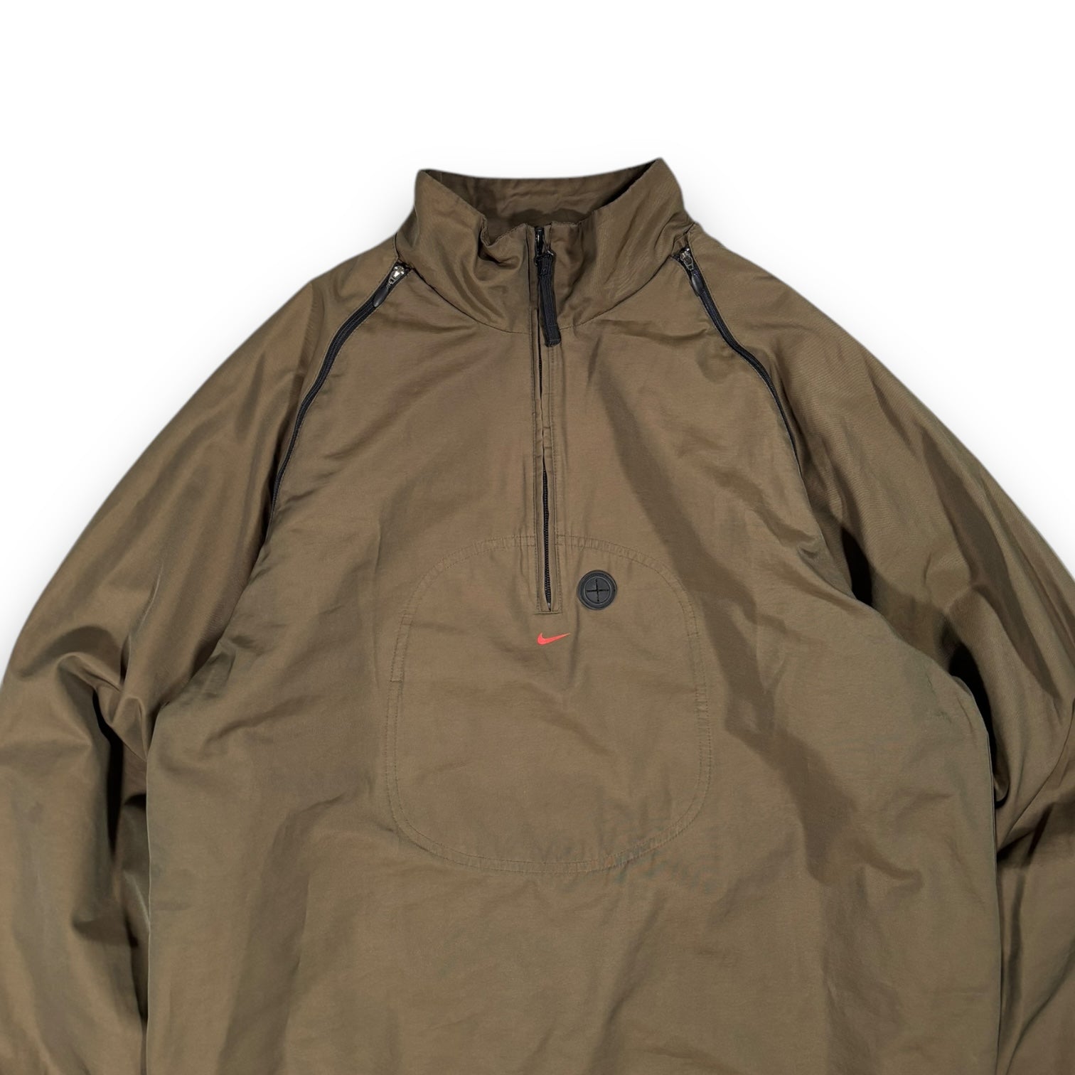 Khaki colourway, thin lighter weight material. Elasticated quarter zip, jacket can also be converted Into a gilet using the zips around the arms. Small hole leading to pouch on the inside of the jacket that is used for an MP3 Device. On the back there is ' -. .. -.- . ' which is Morse code for 'Nike'.