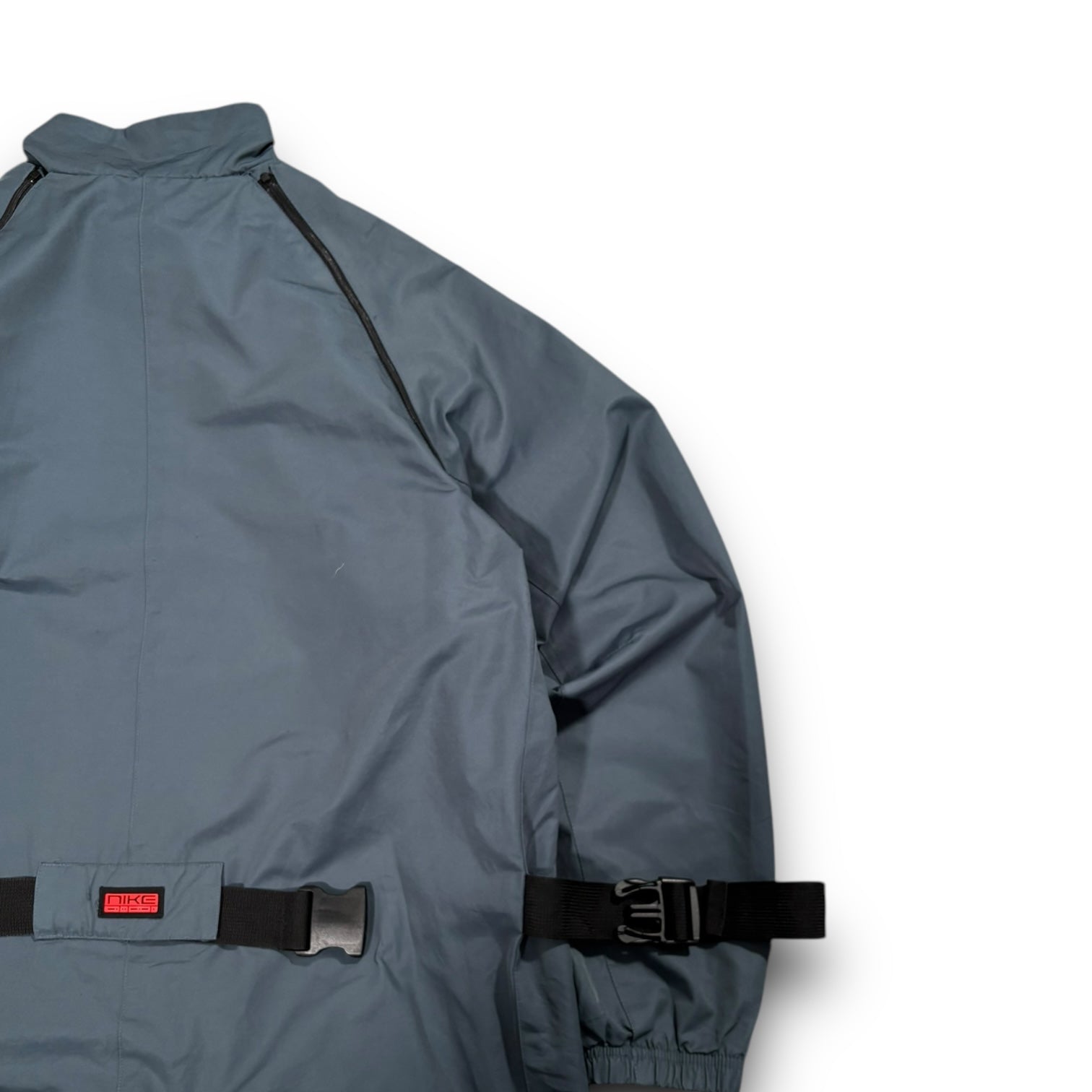Slate grey colourway, thin lighter weight material. Elasticated quarter zip, jacket can also be converted Into a gilet using the zips around the arms. Small hole leading to pouch on the inside of the jacket that is used for an MP3 Device. On the back there is ' -. .. -.- . ' which is Morse code for 'Nike'.
