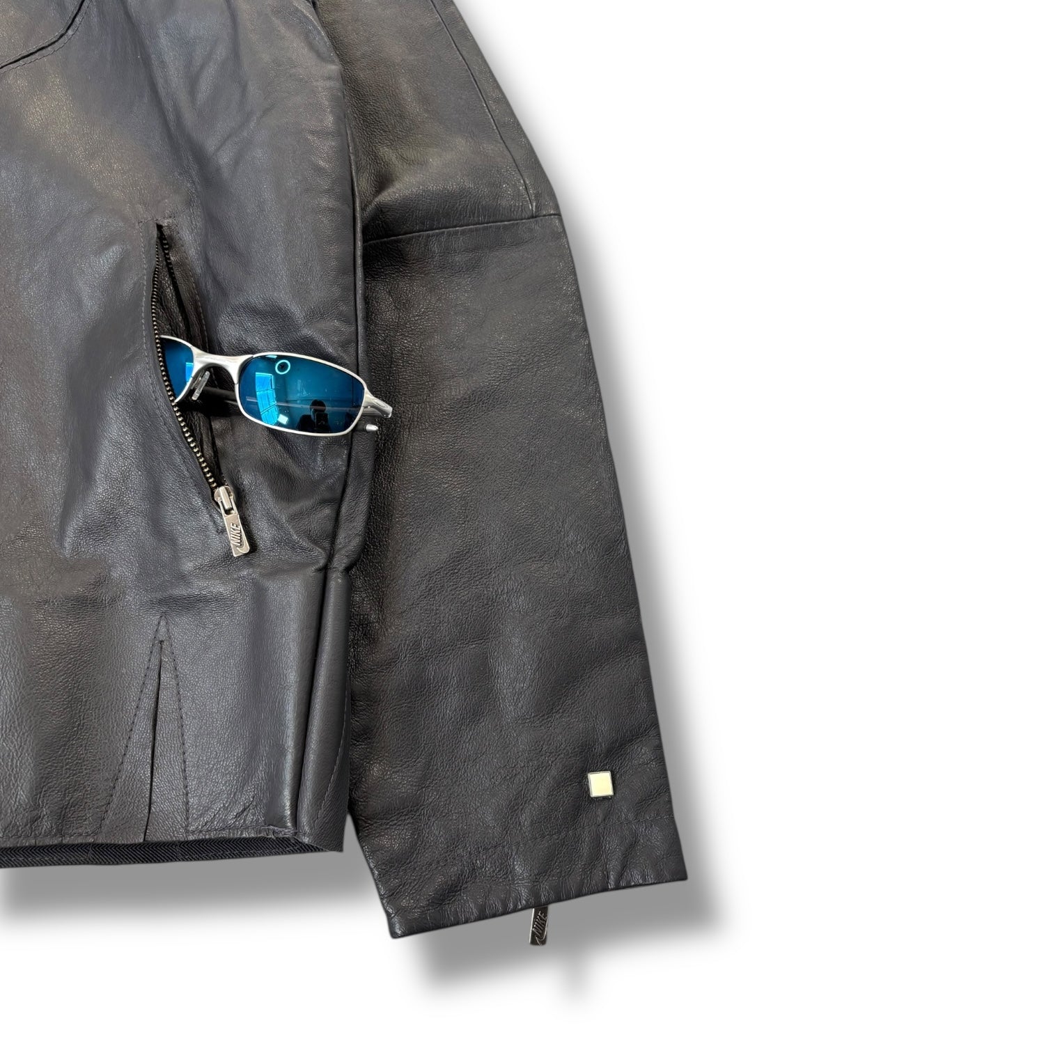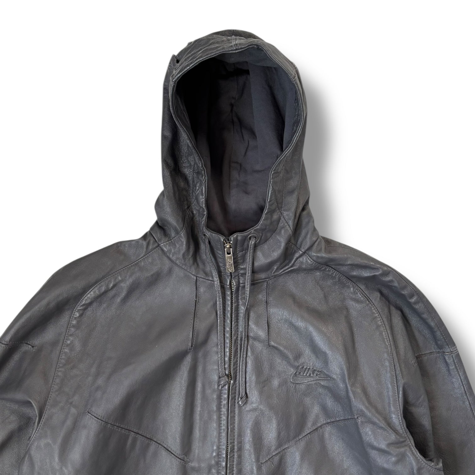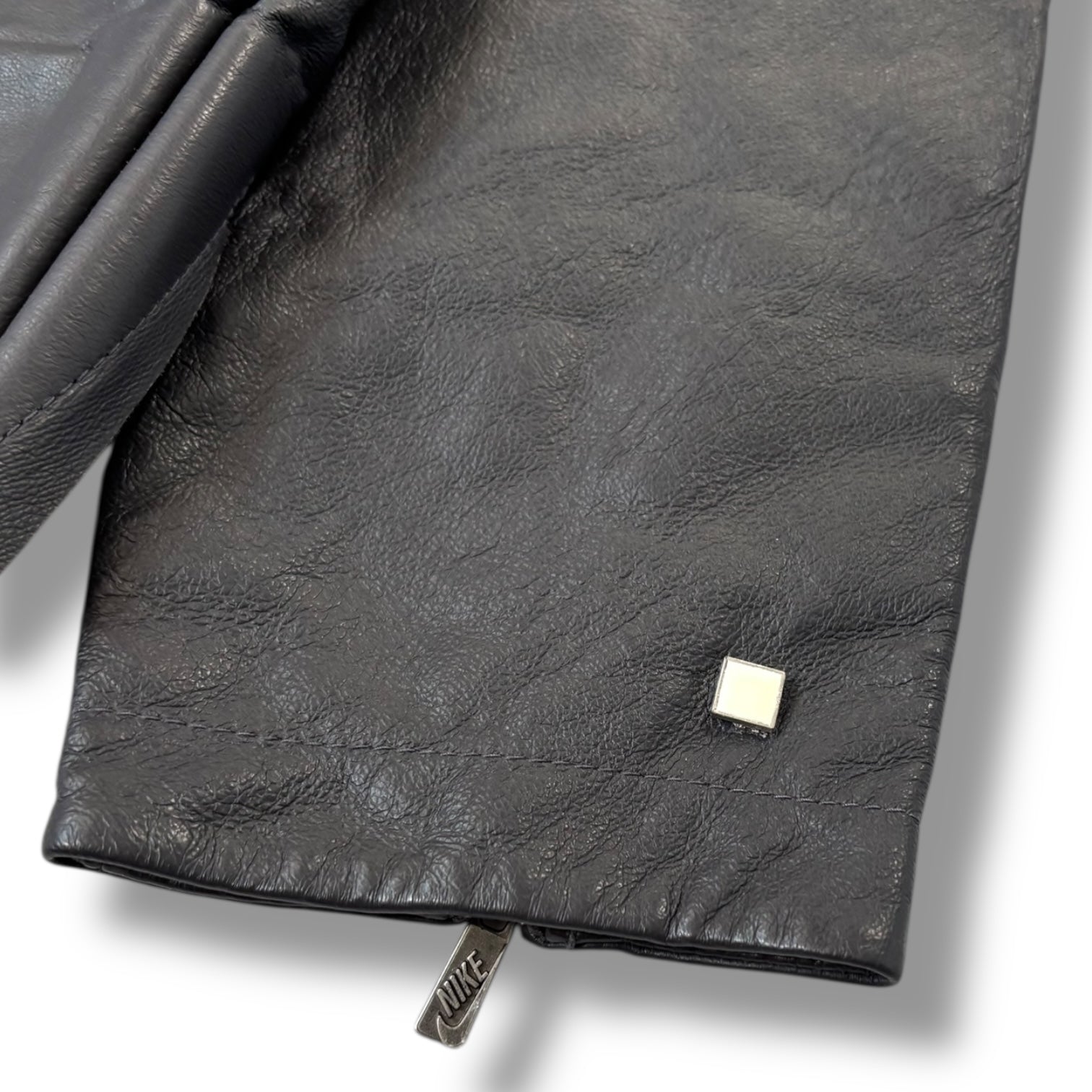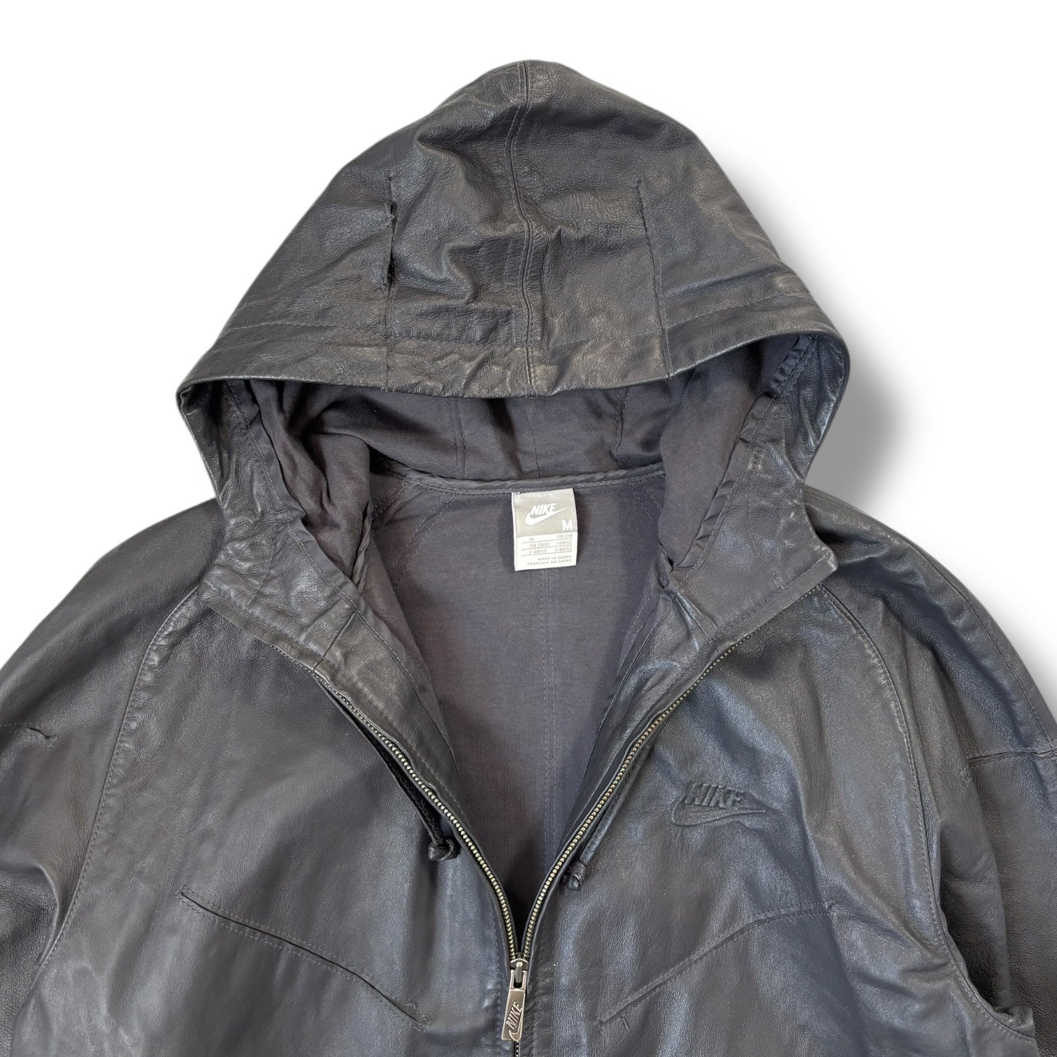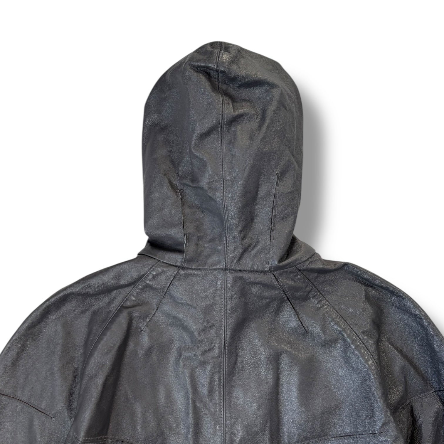 Black colourway with a matte leather-like finish, this piece features a full zip closure and a hood for added coverage. The silhouette is accented with structured paneling and subtle stitched detailing across the chest and sleeves. Two zippered hand pockets, small square metal accent at the cuff. The pleated hem panels contribute to a more dynamic fit allowing for ease of movement.