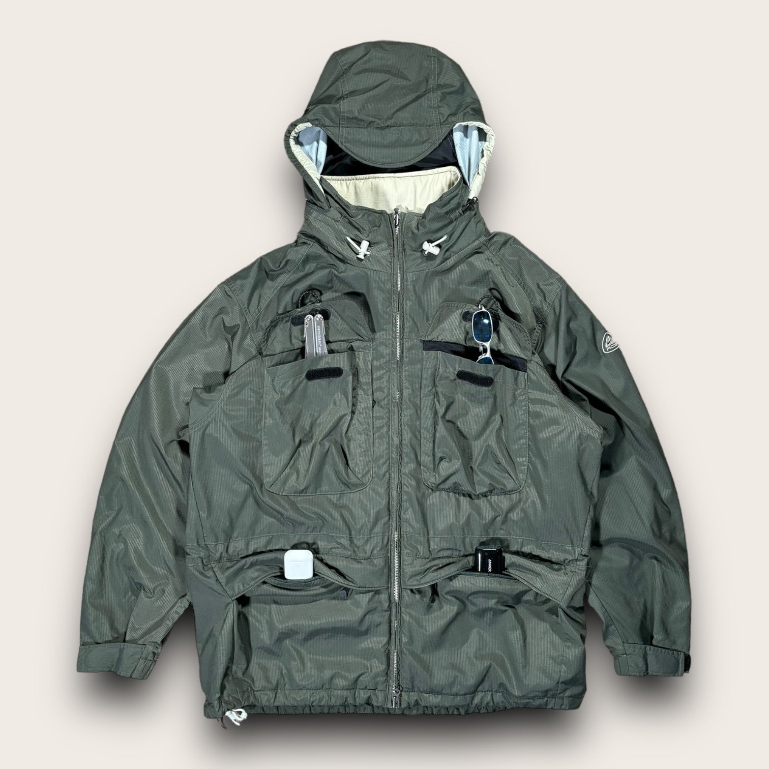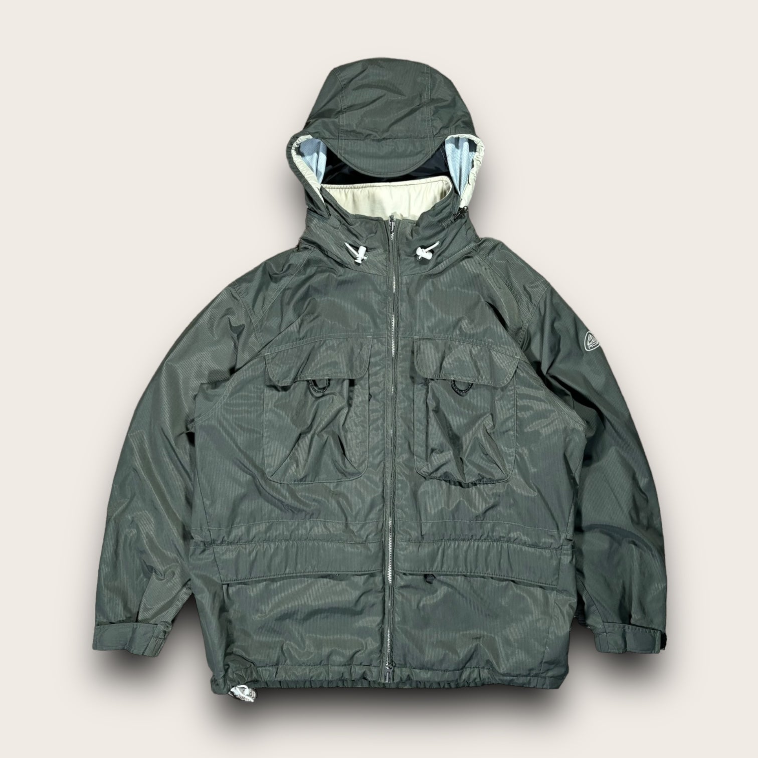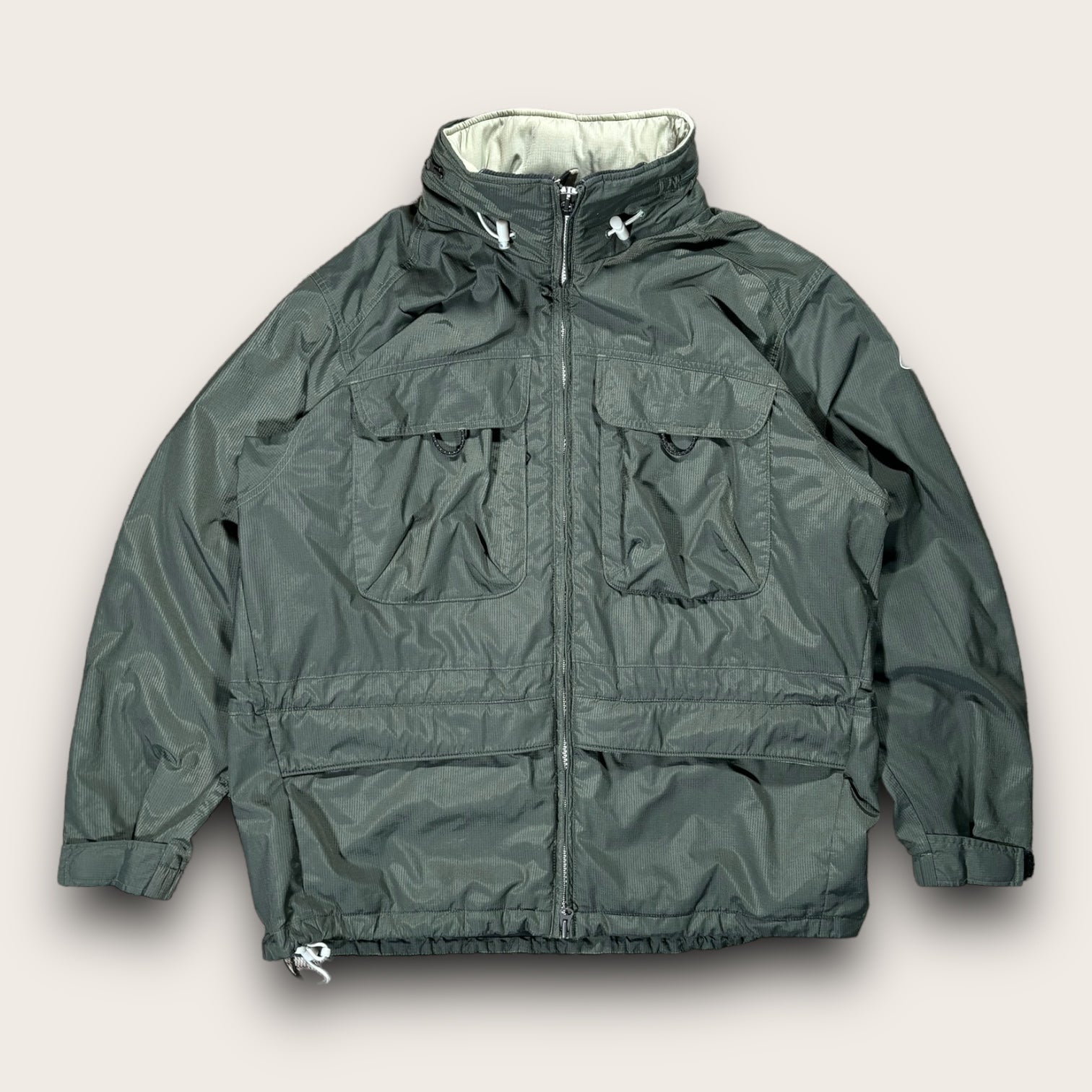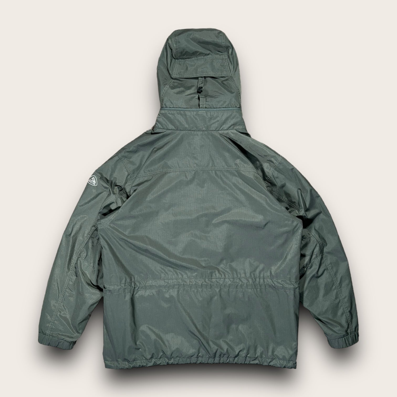 Dark Green colourway, thin lighter weight material. Elasticated toggle adjustable hem, 4 zipped pockets at the front of the jacket 2 at the bottom and another two hidden behind the 3D pockets. The hood is peaked and toggle adjustable, it can also be zipped away into the collar. The jacket features interior pockets one being for a MP3 device