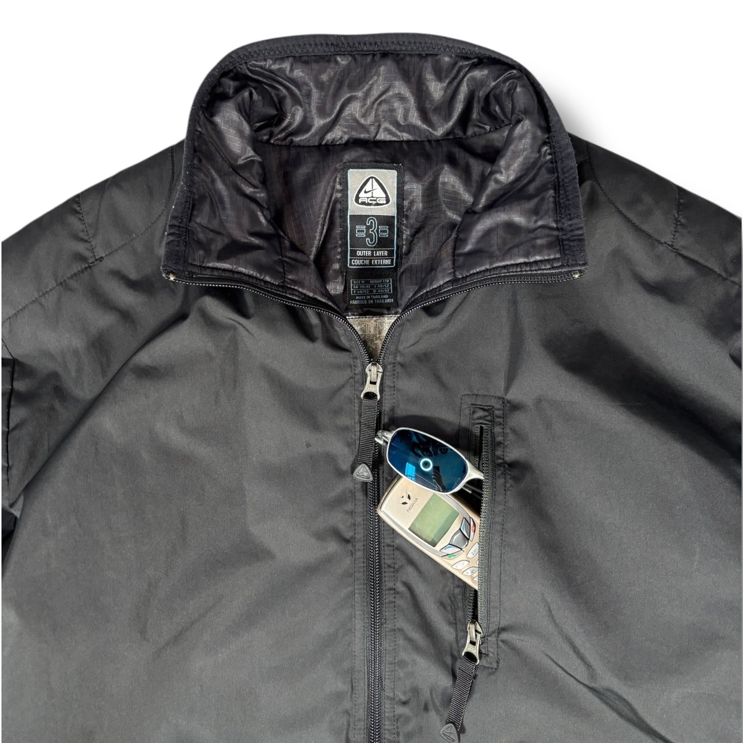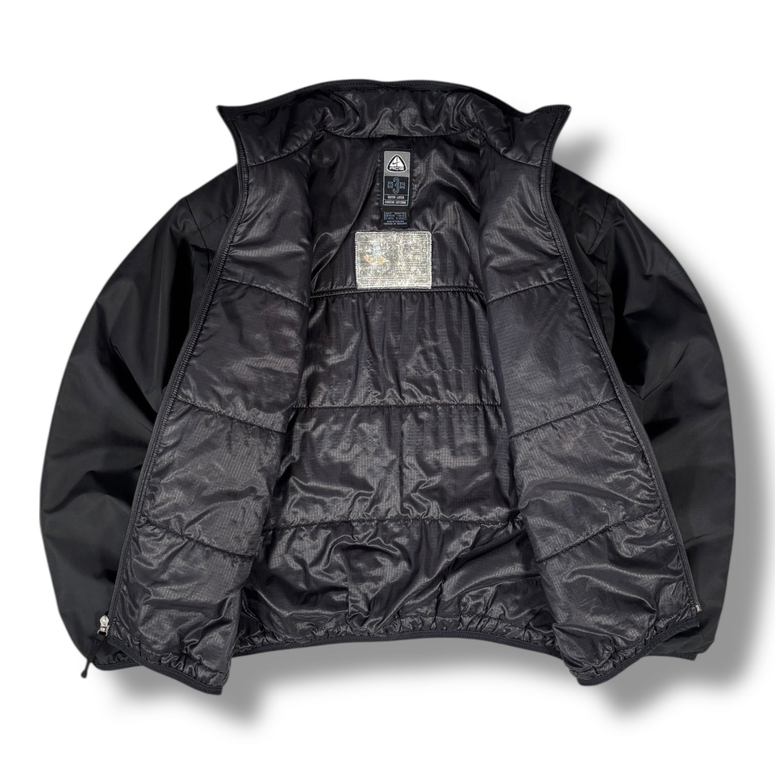Black colourway featuring a zippered chest pocket, and subtle ACG logo on the sleeve. Interior is fully lined with horizontal quilting and mesh paneling. Elasticated cuffs and hem.