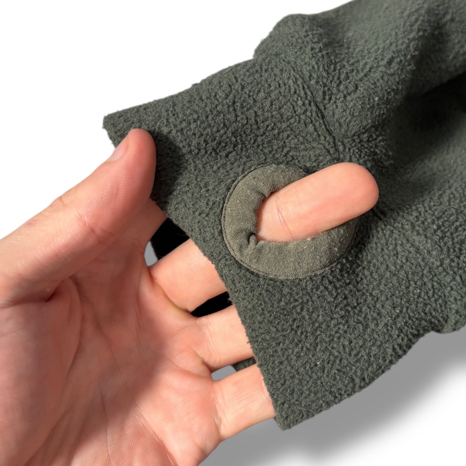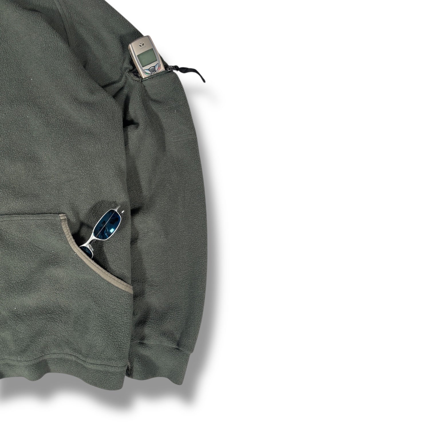 Dark green colourway with a full front zip, two hand pockets, and contrast trim along the edges. Features a drawstring-adjustable hood, zippered arm pocket on the left sleeve, and reinforced thumb holes at the cuffs. Constructed from fleece fabric.