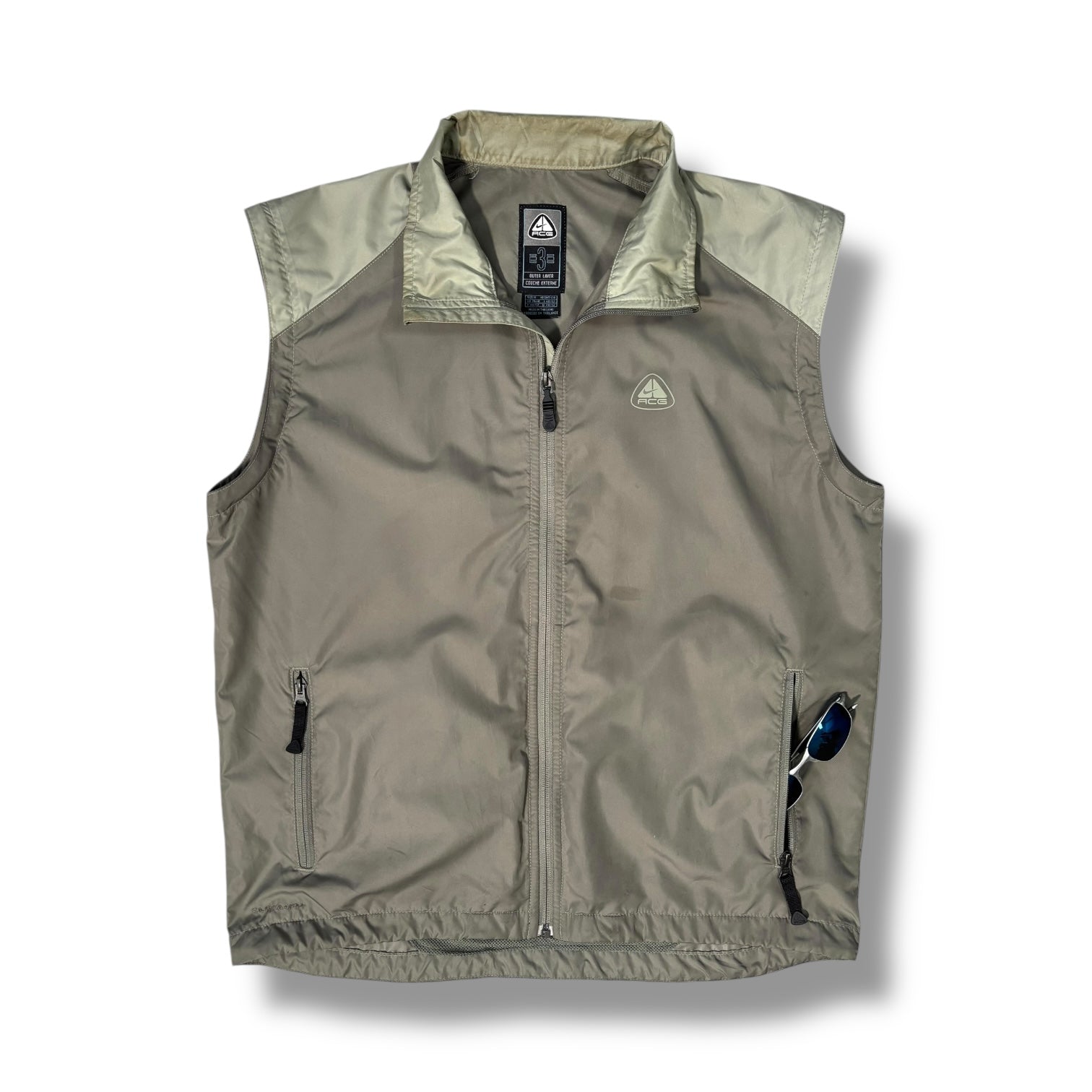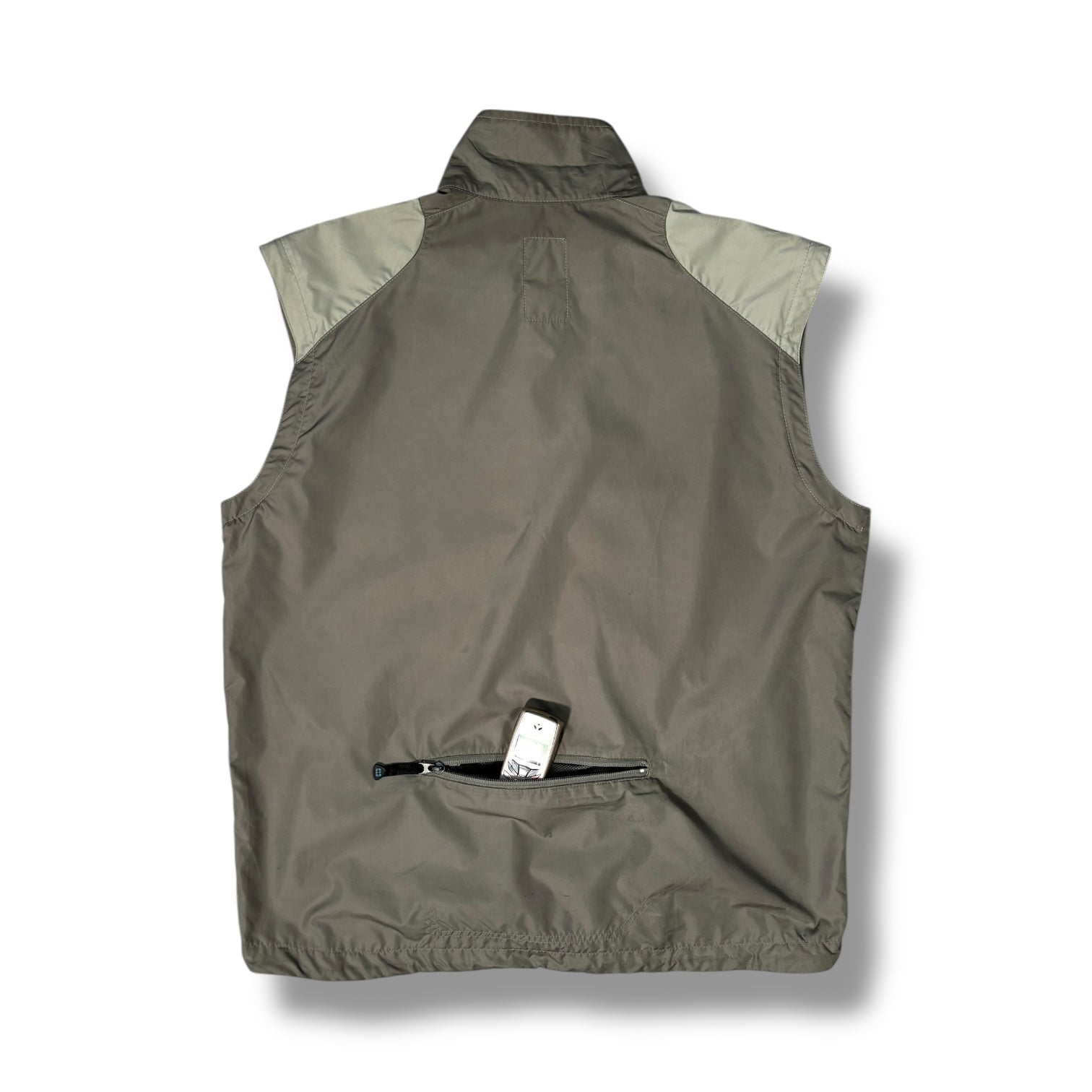 Taupe colourway with light grey contrast panels on the shoulders and inner collar. Features a full front zip closure, two front zippered hand pockets, and a horizontal zippered pocket at the lower back. The garment can be packed into the rear pocket, which has a mesh exterior when reversed. Finished with a small tonal logo on the left chest.