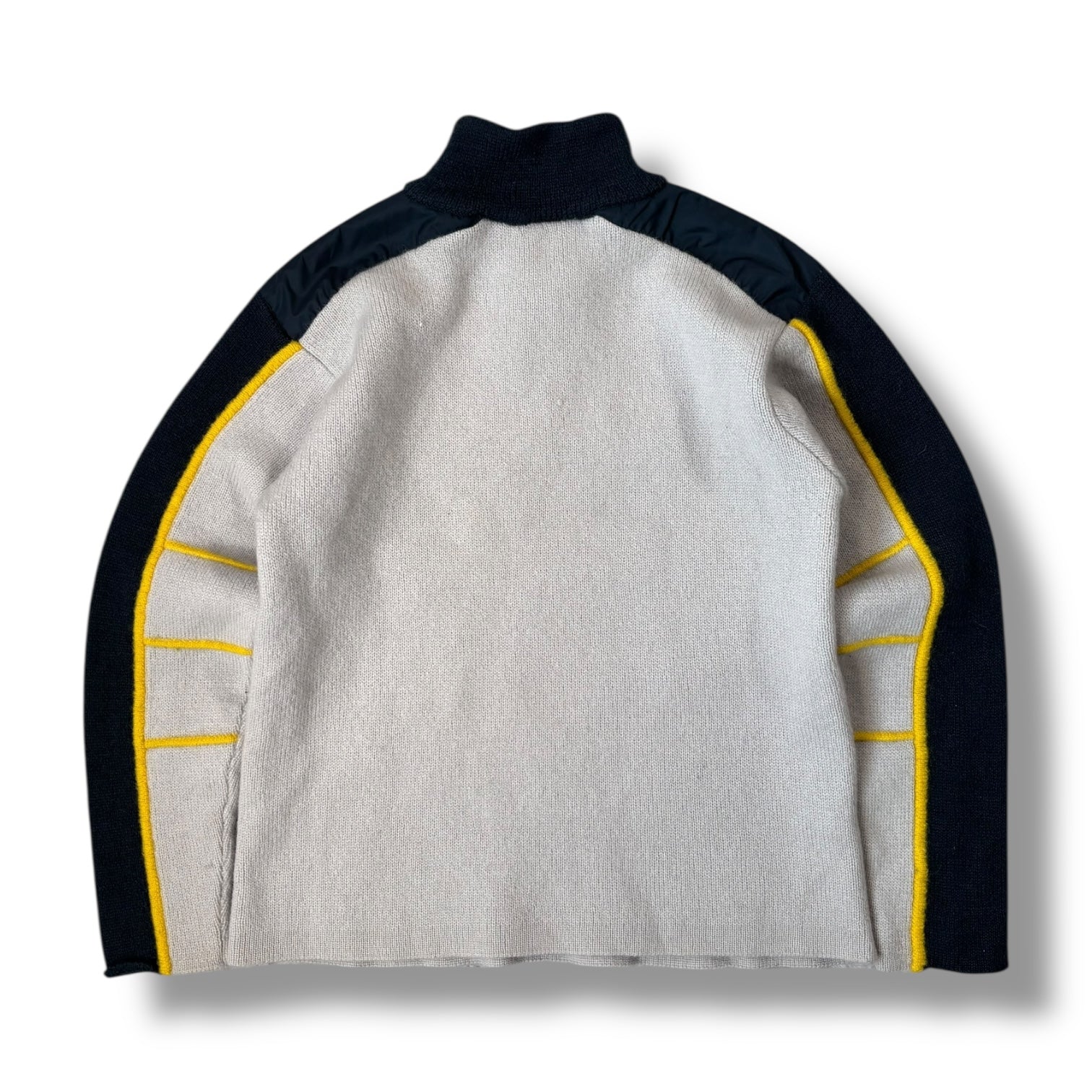 White colourway base with navy blue panels across the shoulders and chest, accented by bold yellow horizontal stripes running through the arms and torso. Features a thick ribbed high neck with a short zip closure, reinforced shoulder panels.