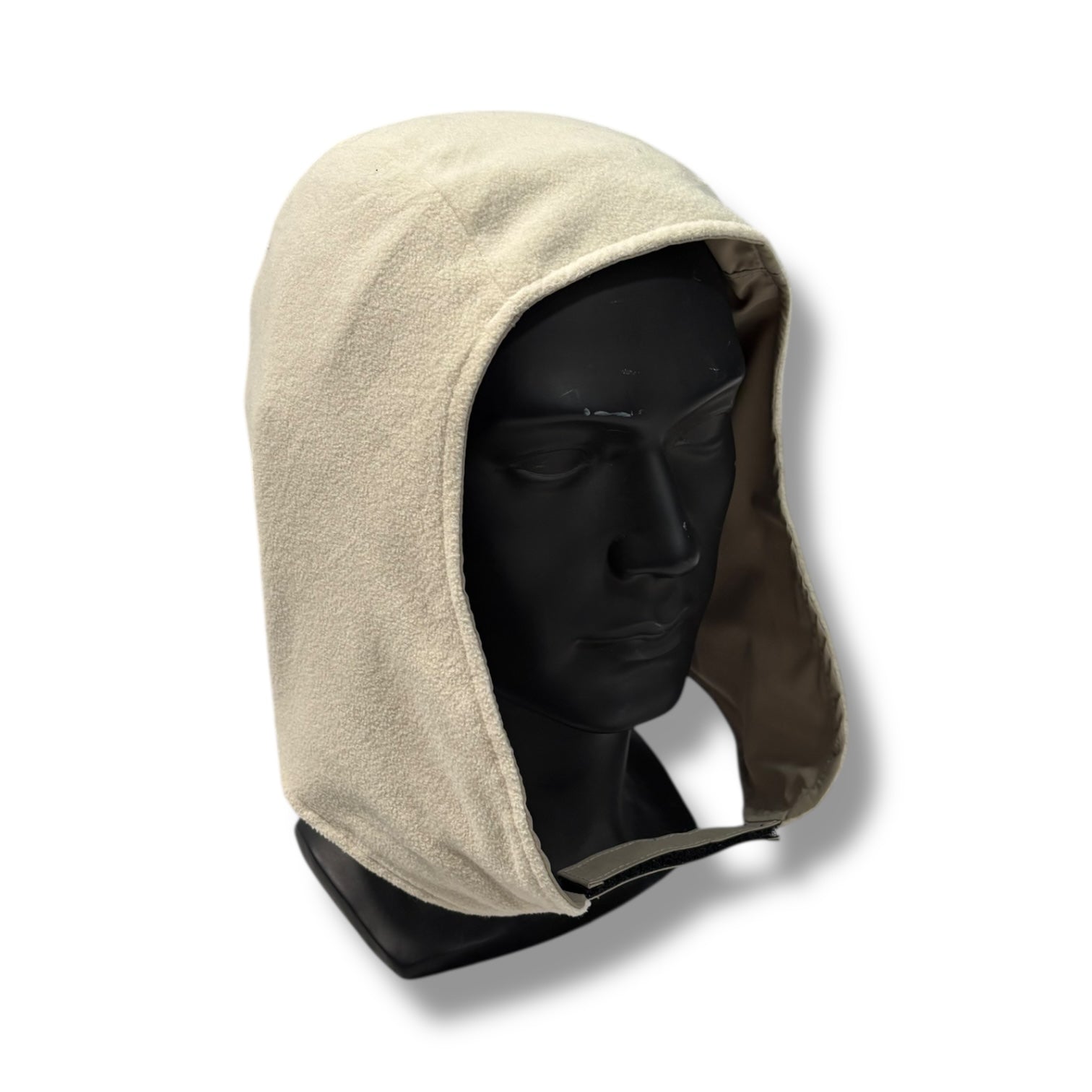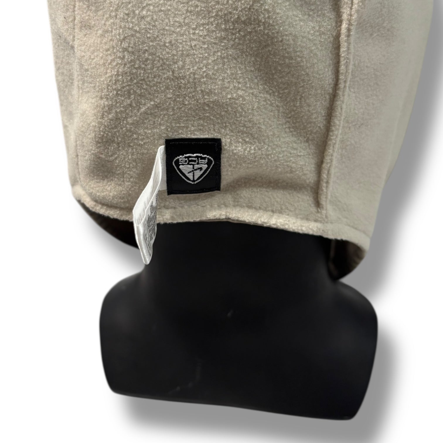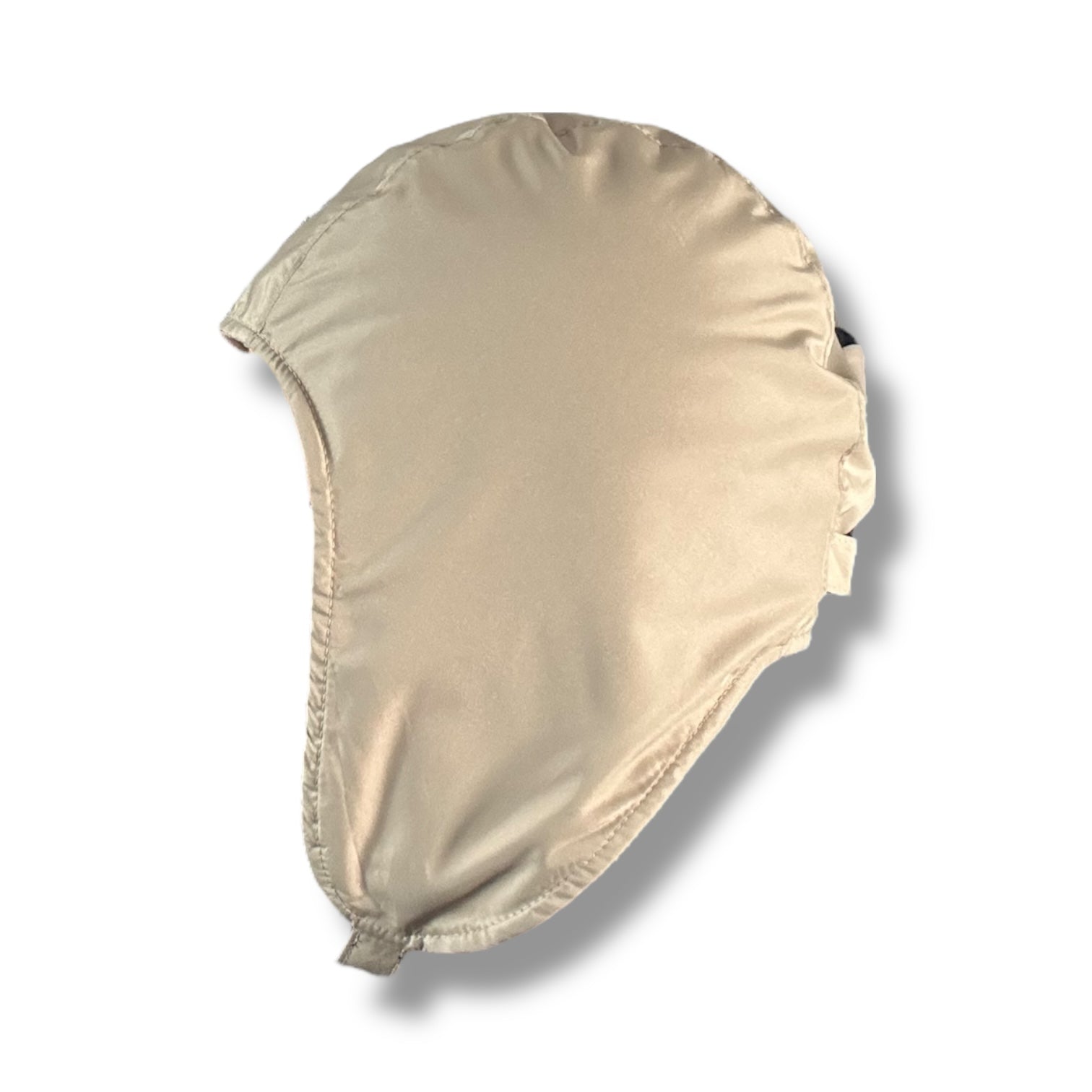 Tan colorway. This piece features a smooth synthetic outer shell with a rounded, contoured silhouette and minimal paneling. The front has a clean open face design, while the back includes an adjustable black strap with hook-and-loop closure and a stitched tab with a white swoosh. The piece is reversible the other side is fleece-lined in beige for added insulation.