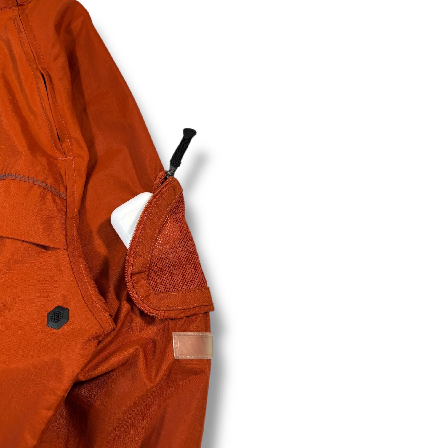 Coveted Kayak jacket in orange colourway. Jacket can be packed away into the front pocket, has a lungs logo shaped stash pocket on the sleeve, asymmetric shoulder zip with neck guard, elasticated waist hem, hexagonal plastic underarm ventilation & textured cuffs. 2 jackets available.