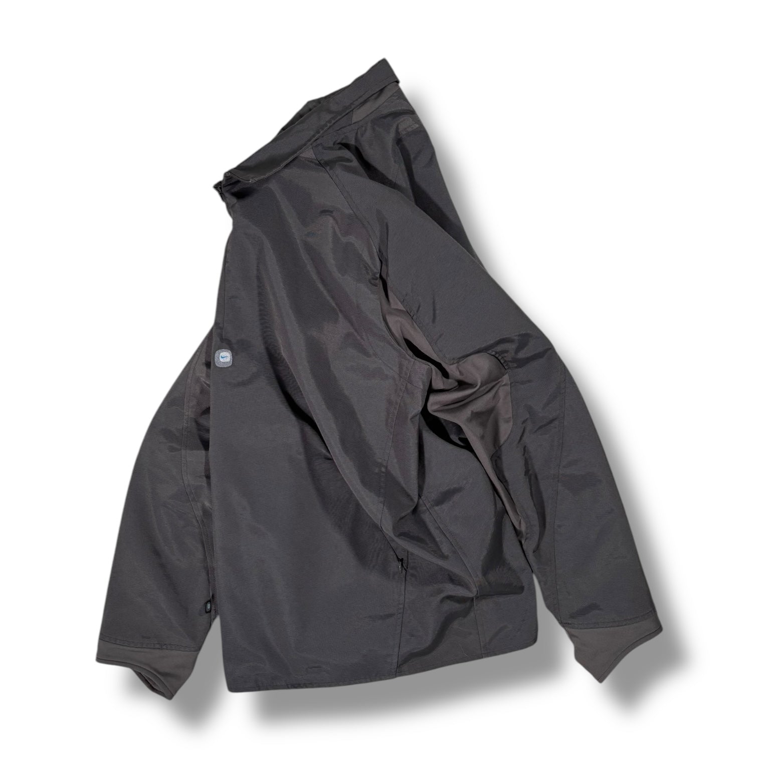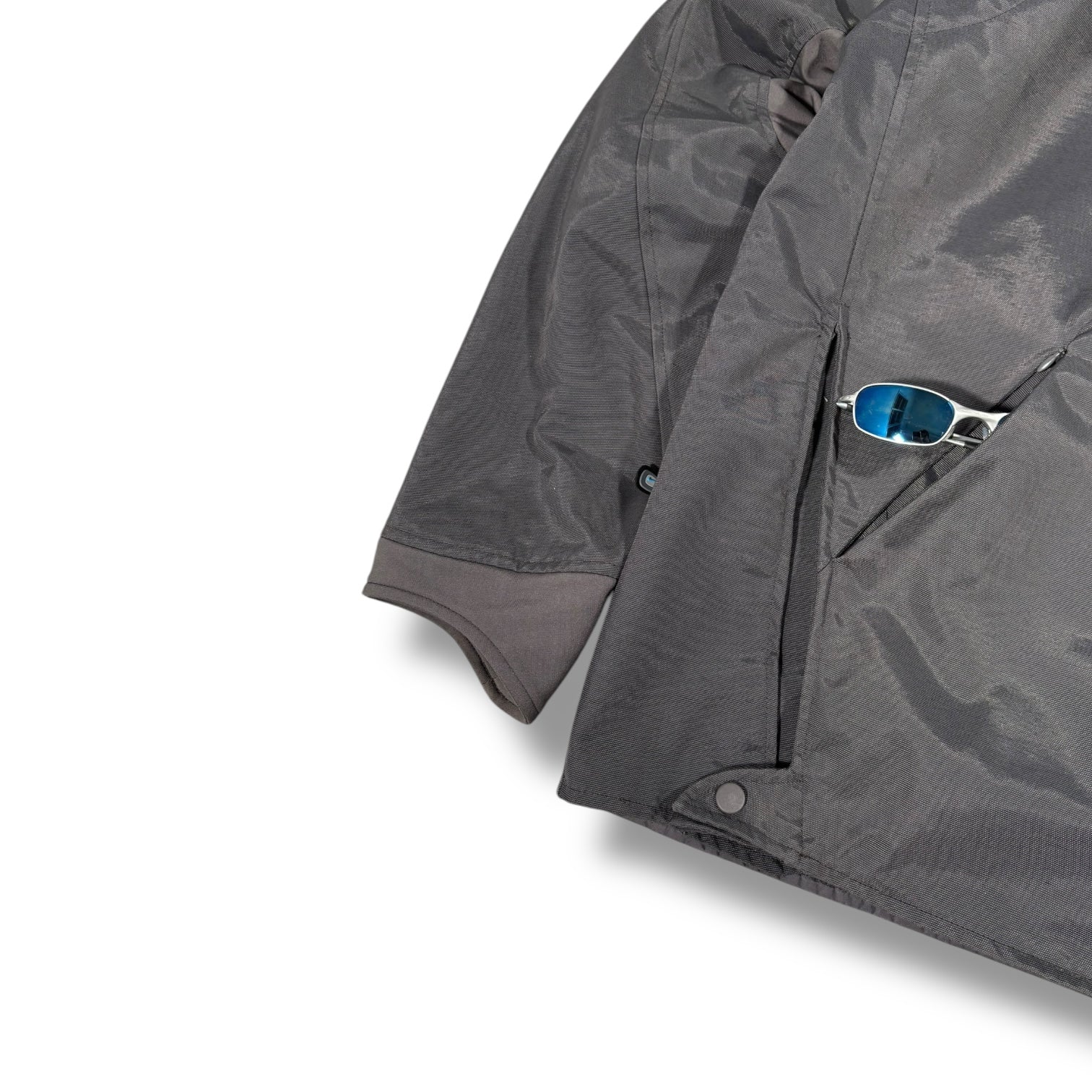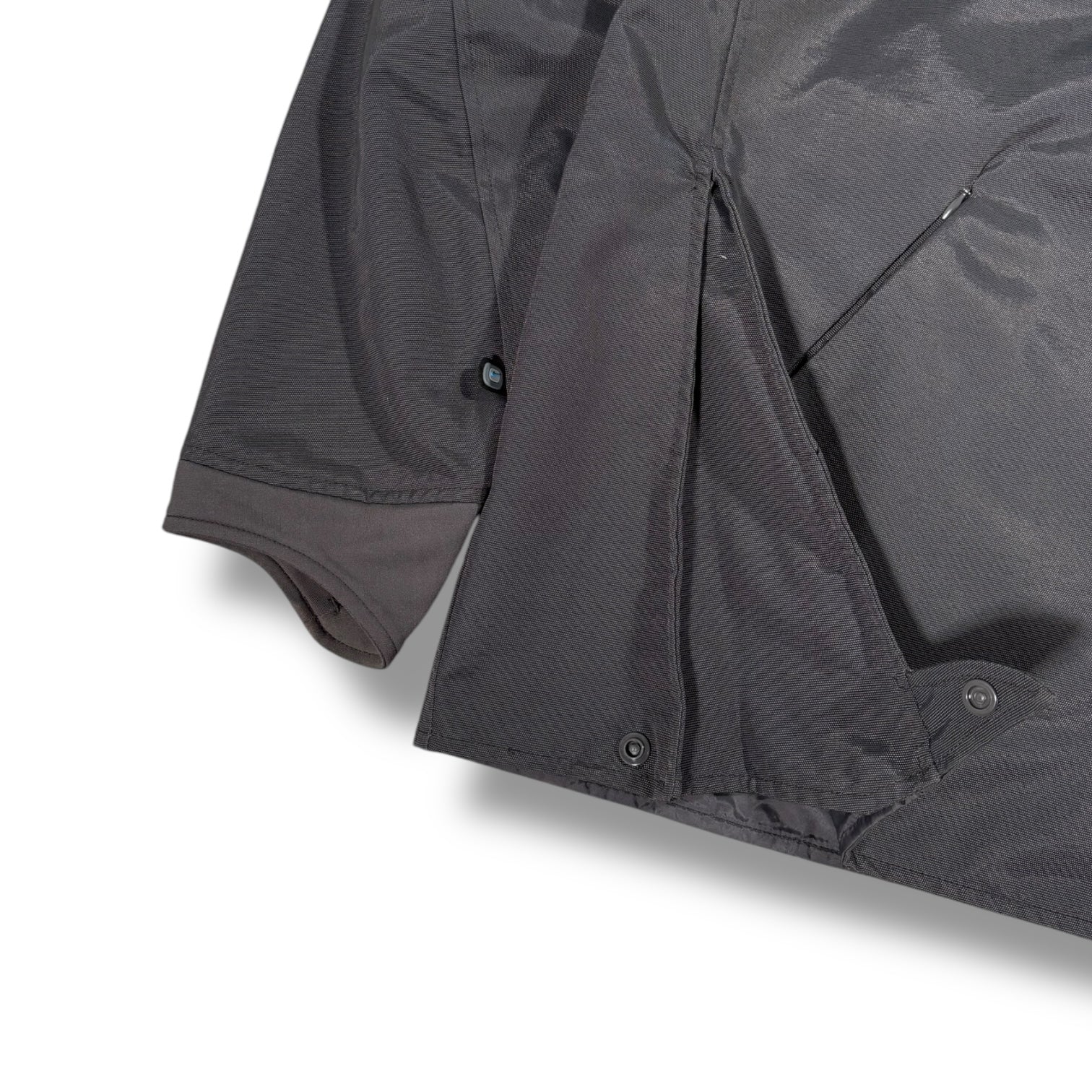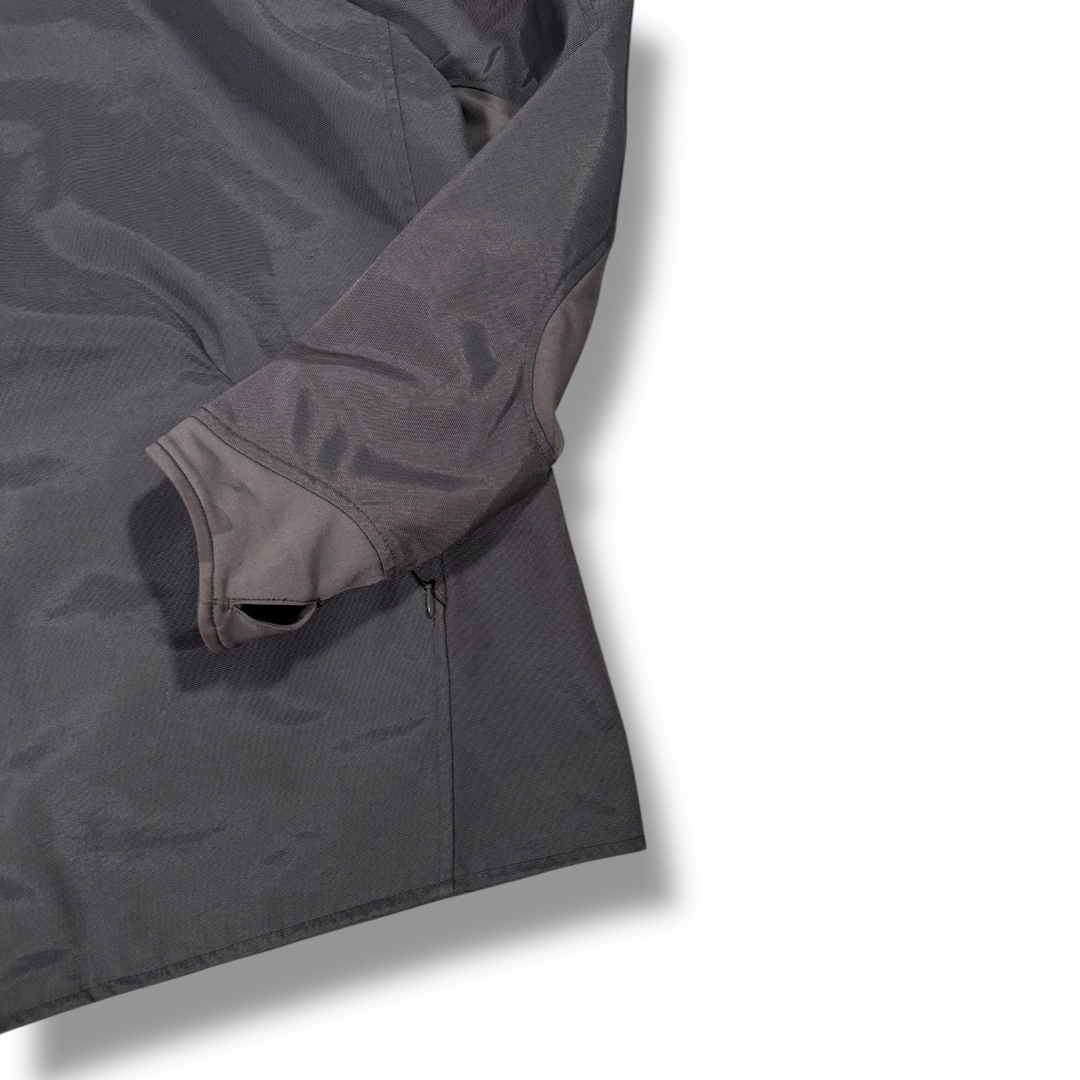 Grey colourway. Two hidden zipped slit pockets, adjustable buttoned hem. Breathable and stretchy material underneath armpit and on cuff. Cuff also has a slit opening for thumbs. Small ring in back of neck to hang the jacket.