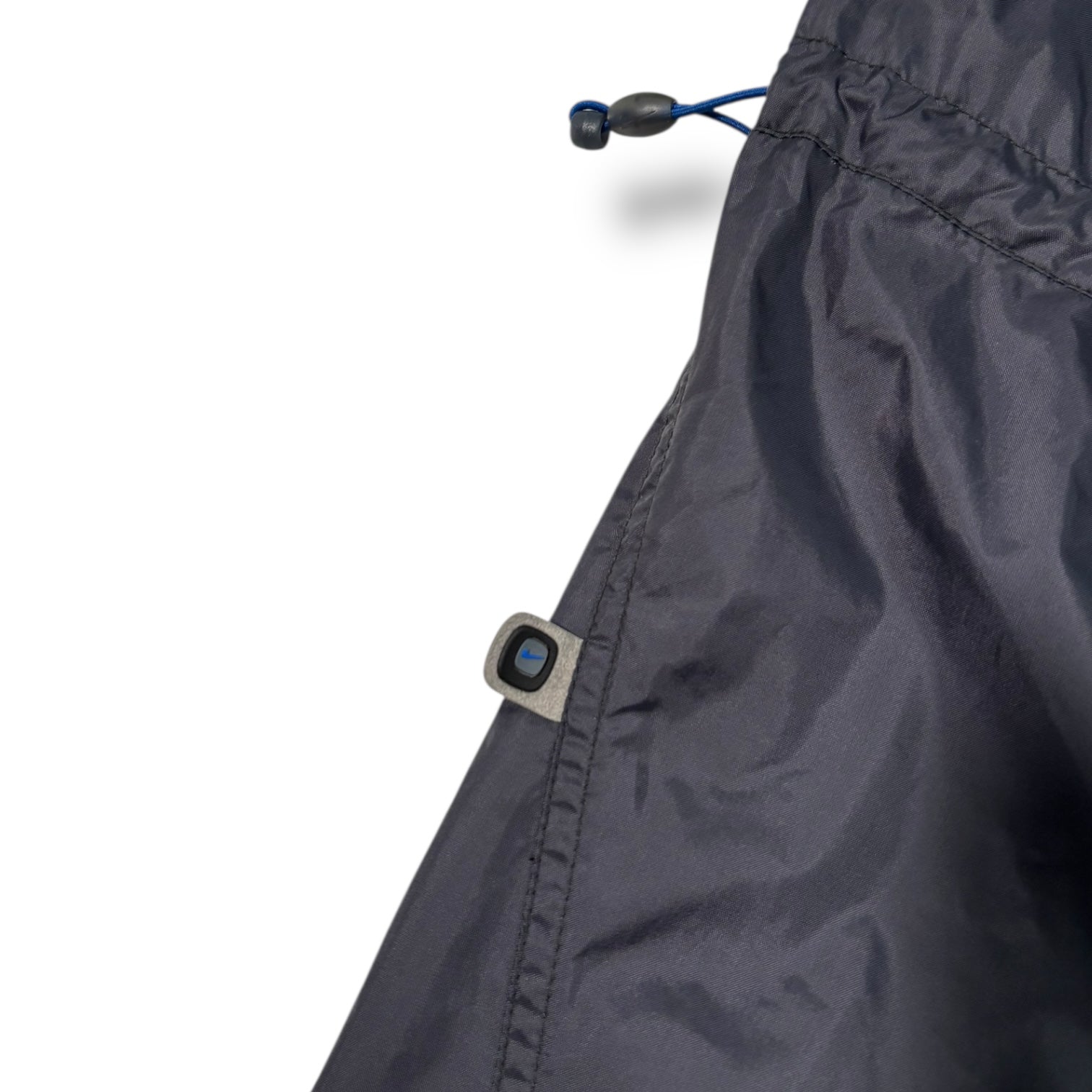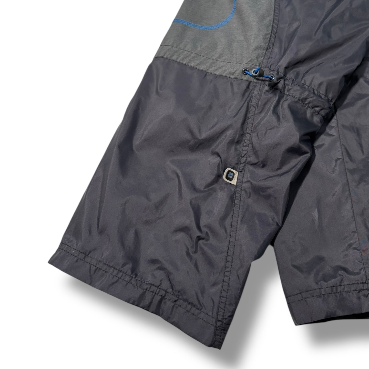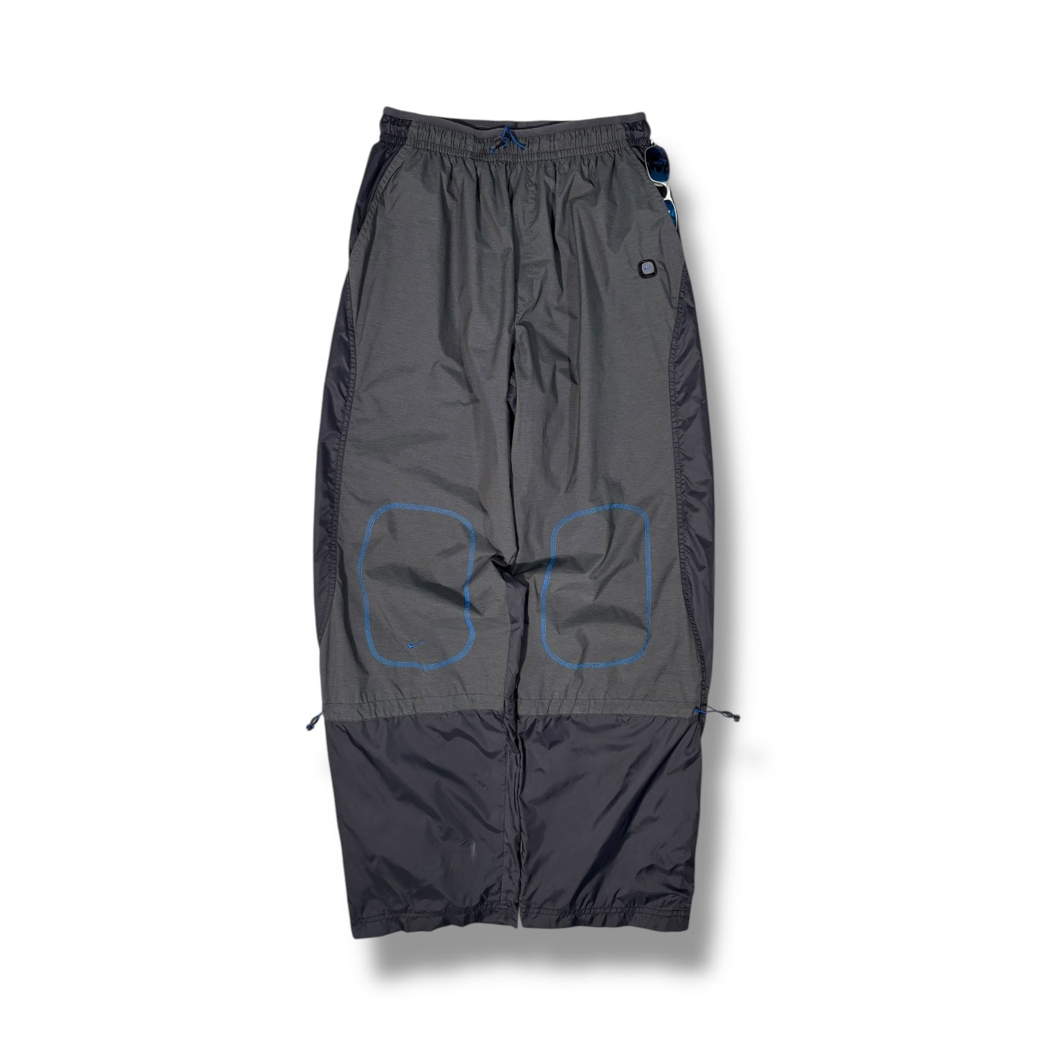 Dark grey and black colourway with paneled construction, featuring blue contrast stitching and embroidered swooshes on the knees. These have an elastic waistband with a blue drawcord, side pockets, and additional toggle-adjustable cinches at the knees. The rear is entirely black nylon, continuing the panelled aesthetic.