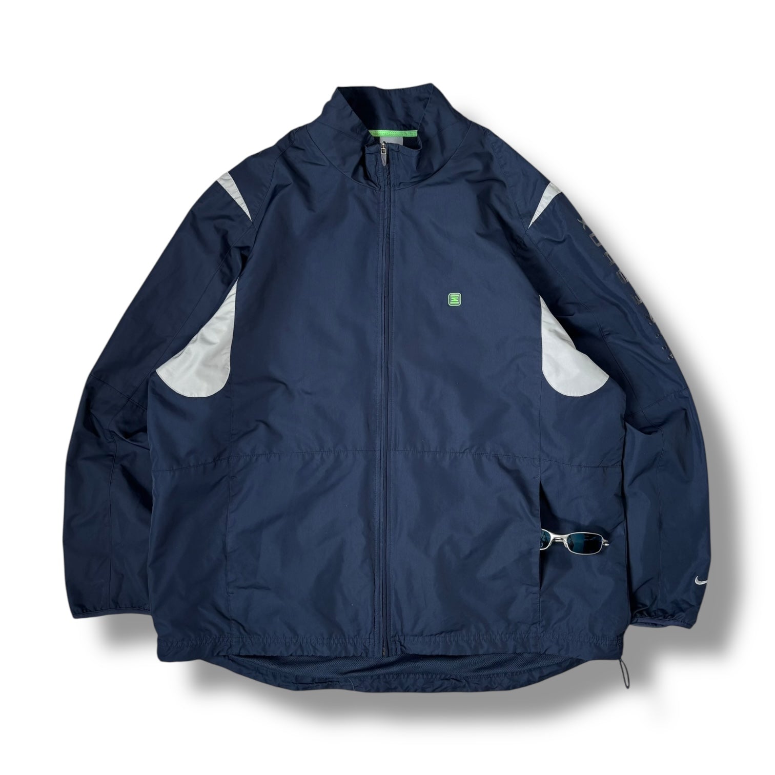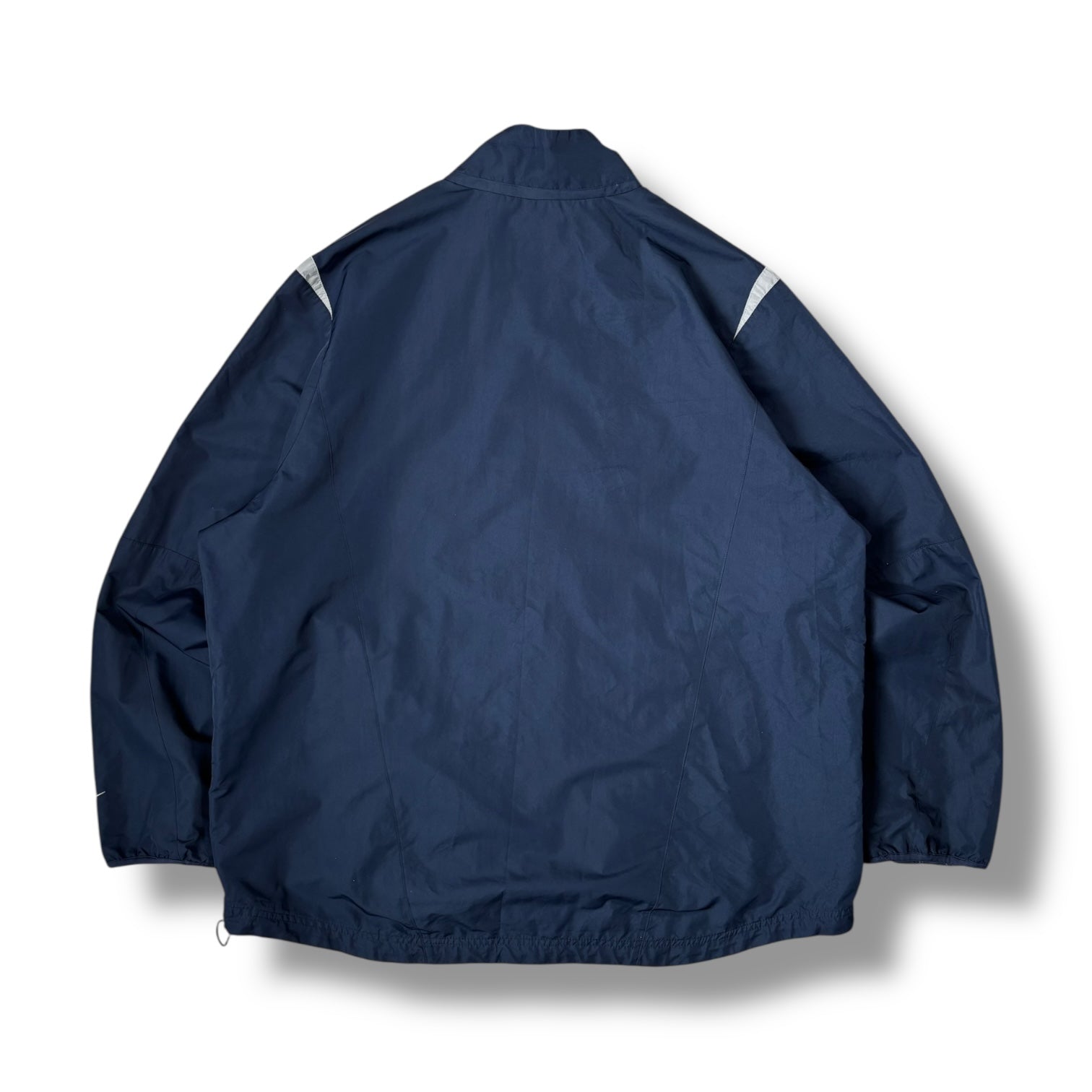Navy blue colourway with contrasting white panels on the underarms and shoulders. This piece features a full front zip closure and two front welt pockets.. Additional functional details include a slightly dropped hem with adjustable drawcord and elasticated cuffs for a secure fit.